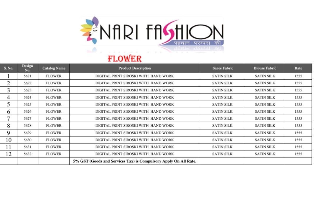 NARI FASHION My New Catalog Launching Today FLOWER Hd link https://drive.google.com/drive/folders/1WHAuwwqQbm1pwoctO6GUp025oXiydSRM?usp=sharing Work on saree DIGITAL PRINT SIROSKI WITH HAND WORK Saree SATIN SILK BLOUSE SATIN SILK 1555+5% gst Single available 100+ |