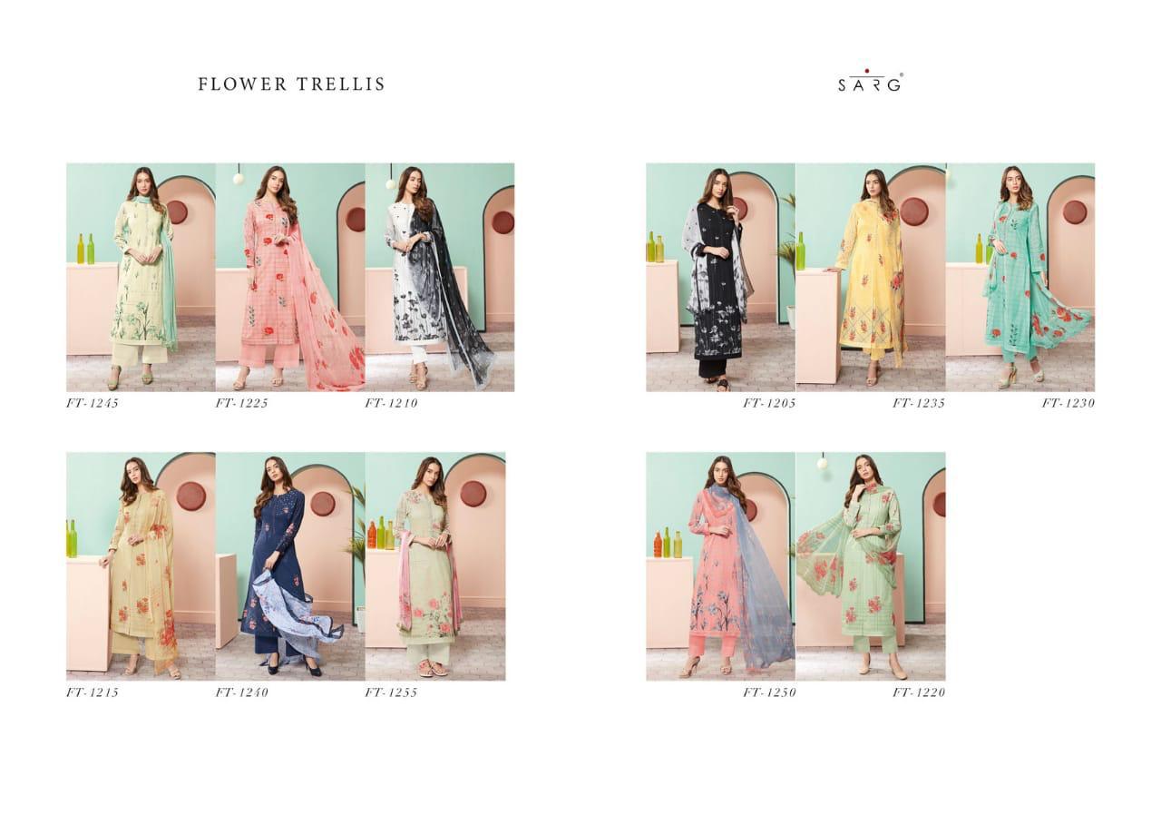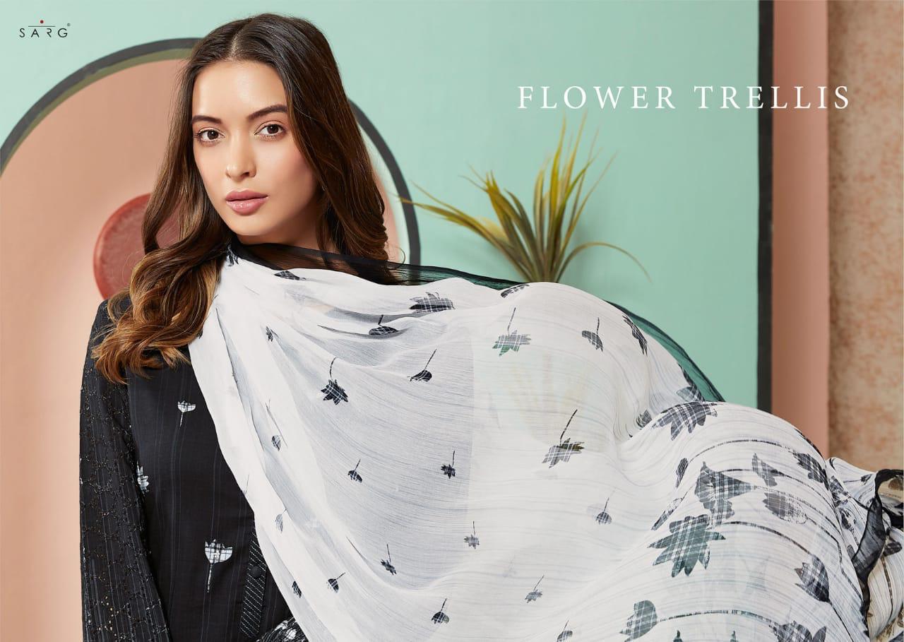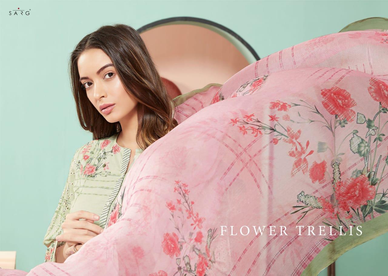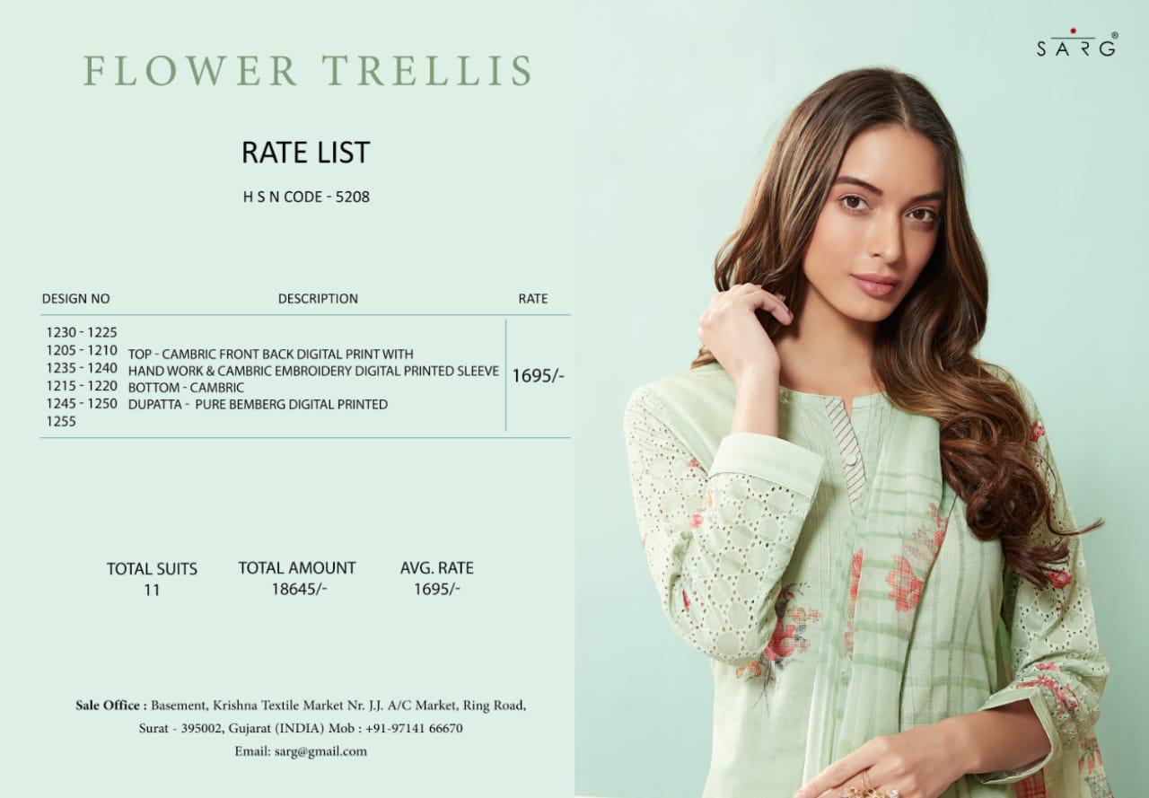 *SAHIBA SARG* PRESENTS ITS NEW CATALOGUE *FLOWER TRELLIS* TOP-CAMBRIC FRONT BACK DIGITAL PRINT WITH HAND WORK & CAMBRIC EMBROIDERY DIGITAL PRINT SLEEVES BOTTOM-CAMBRIC DUPATTA-PURE BEMBERG DIGITAL PRINT *1695?* 5%GST APPLICABLE SET TO SET DELIVERY 2 DAYS |