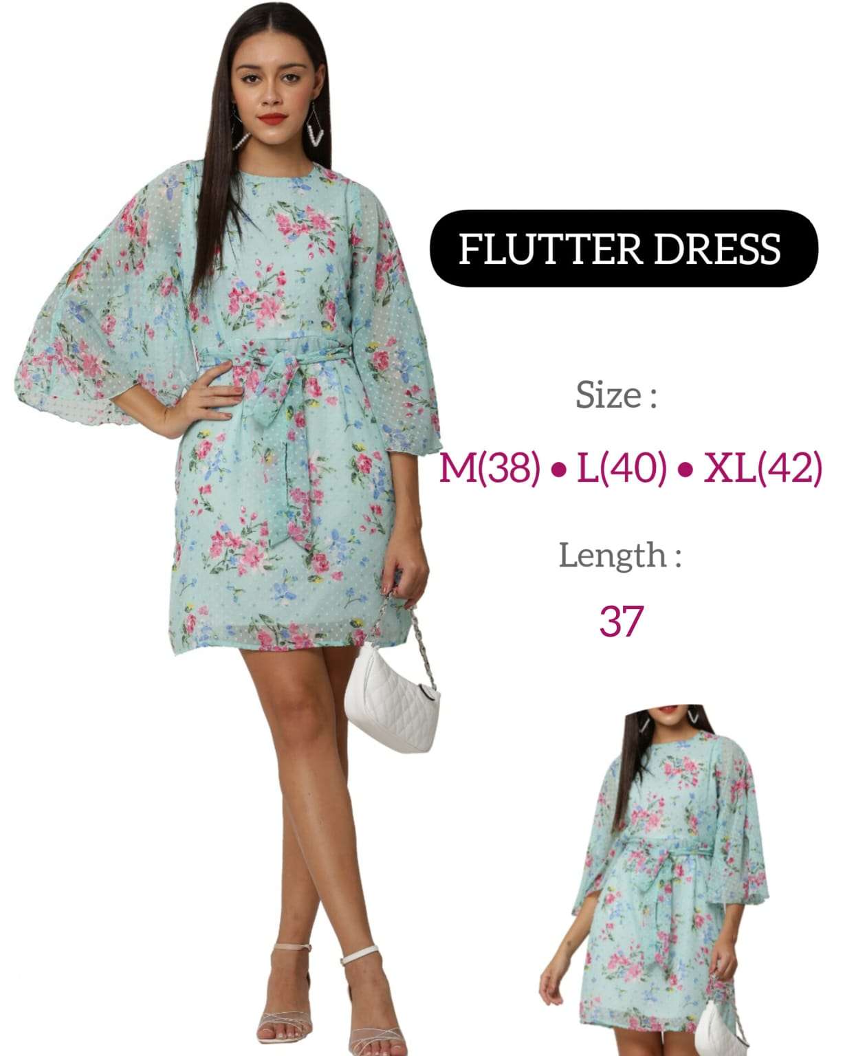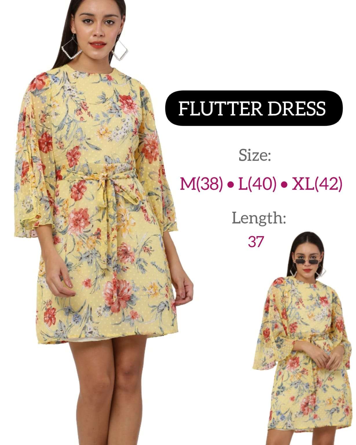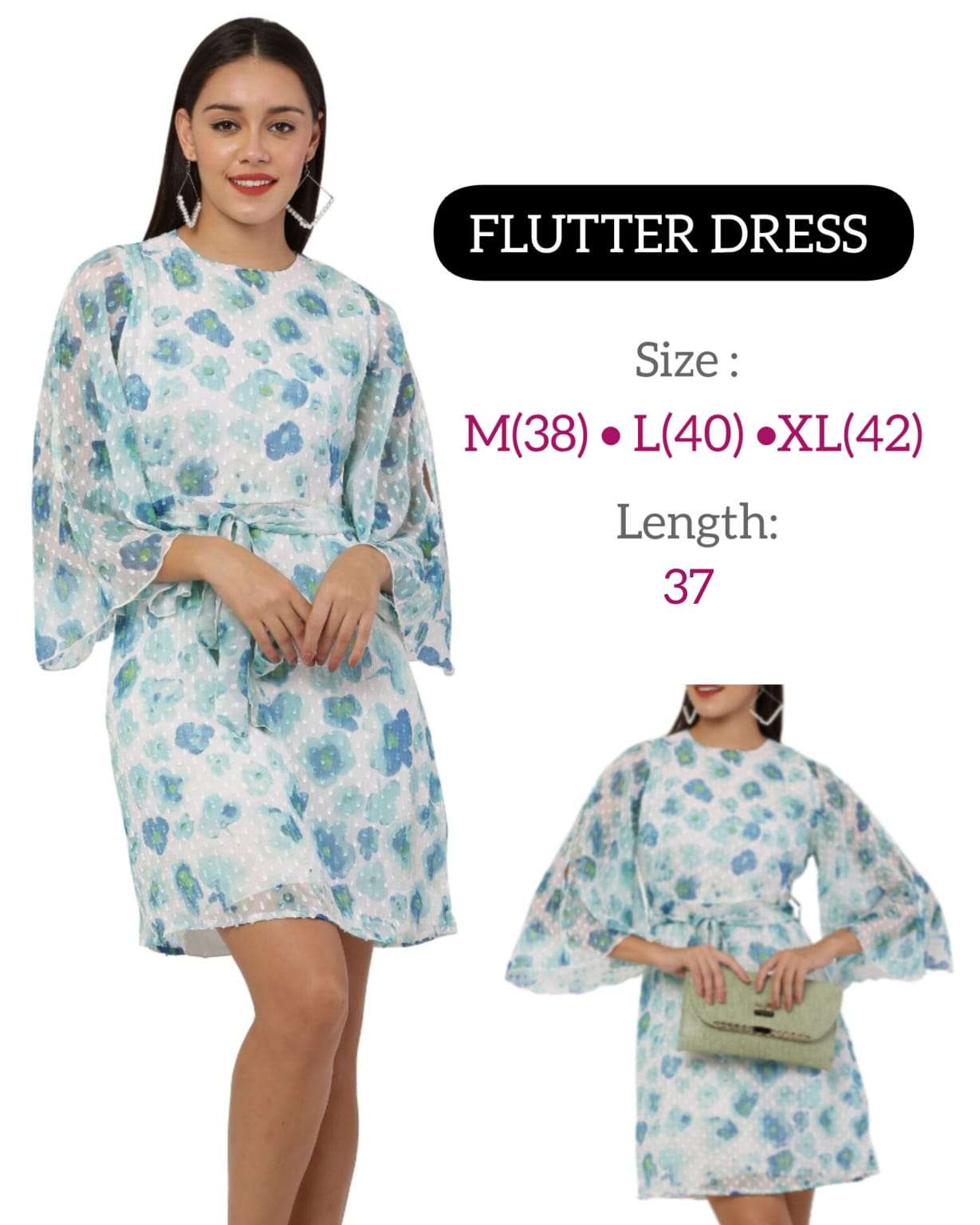 *FLUTTER SLEEVE DRESS* *Fabric:* Premium Georgette with Lining *USP 1:* Trendy Flutter Sleeve *USP 2:* Knotted Belt *Size:* 38 (M) • 40 (L) • 42 (XL) *Length:* 37 inch