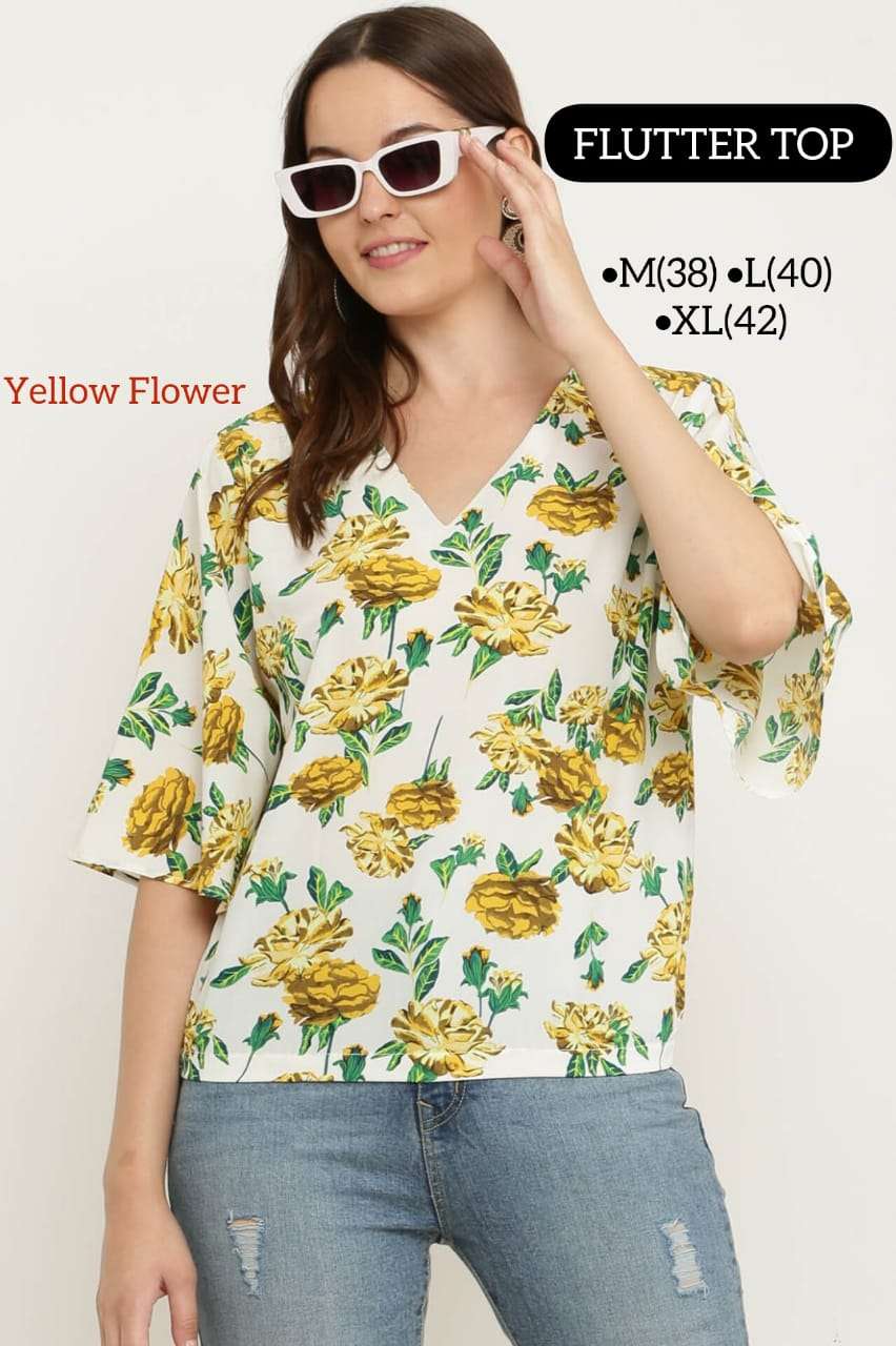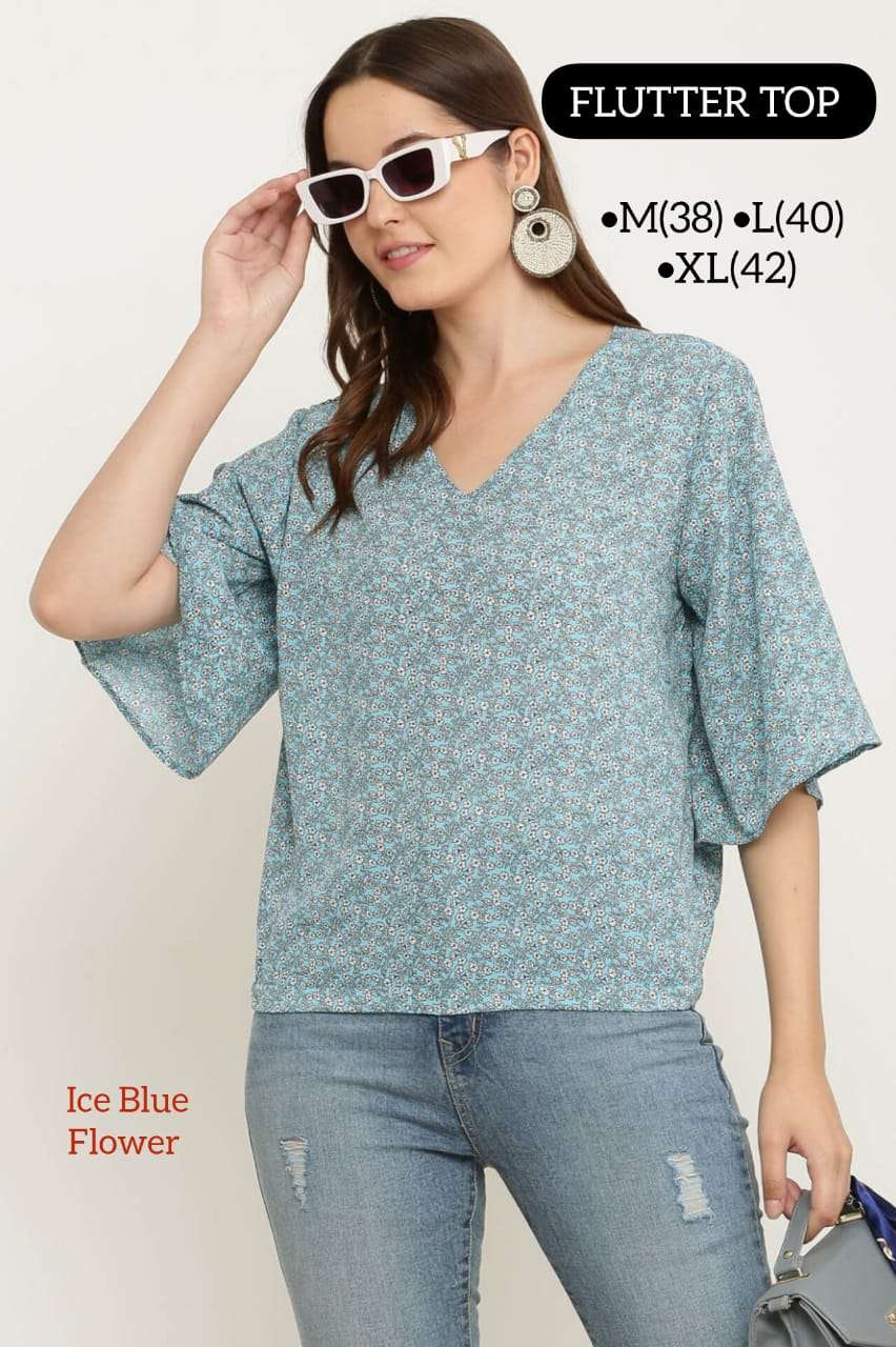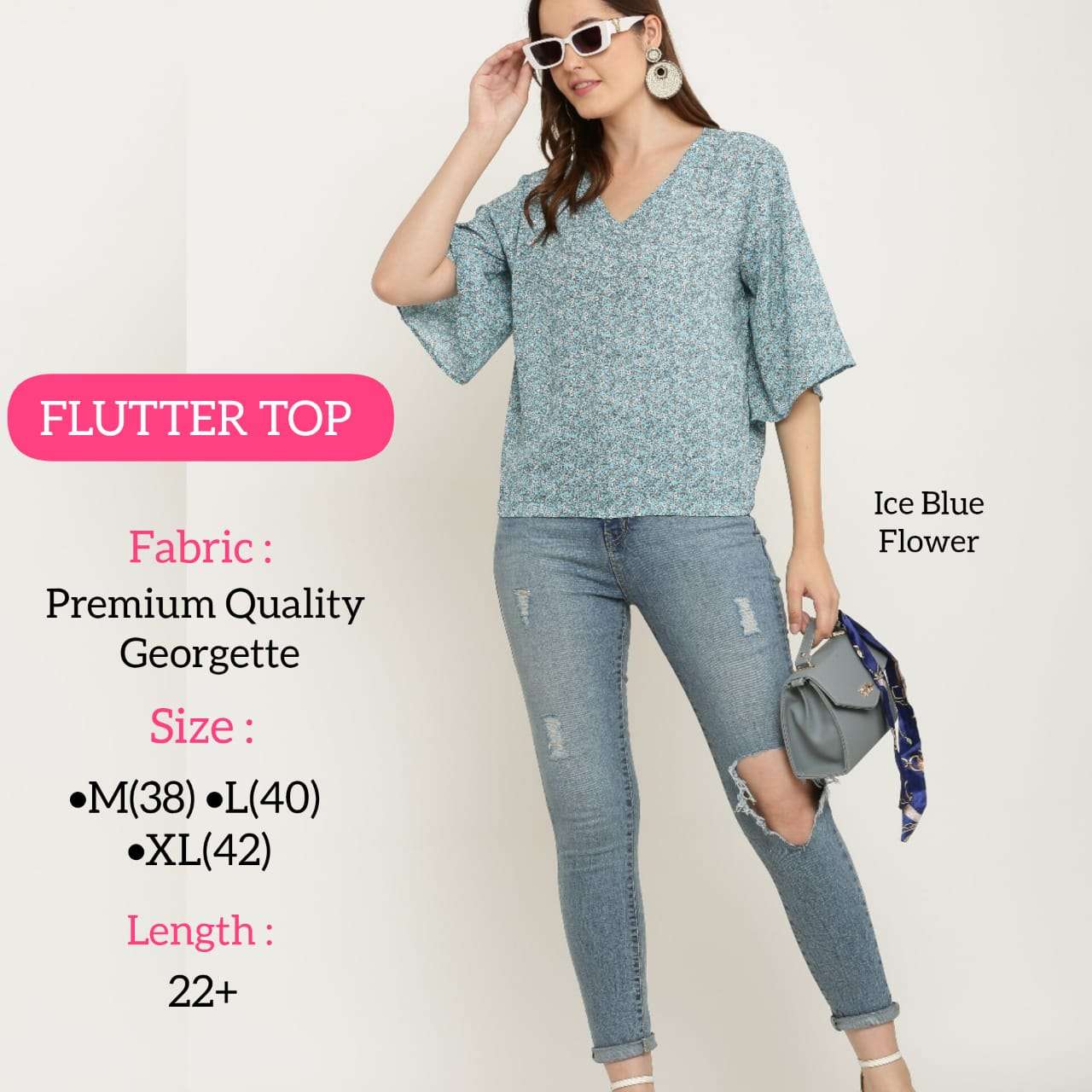 *FLUTTER TOP* *Fabric:* Premium Soft Georgette *Style:* Western *USP1:* Flutter Sleeves *USP2:* Elasticated Bottom *USP3:* Elasticated Bottom *Size:* 38 (M) • 40 (L) • 42 (XL) *Length:* 25
