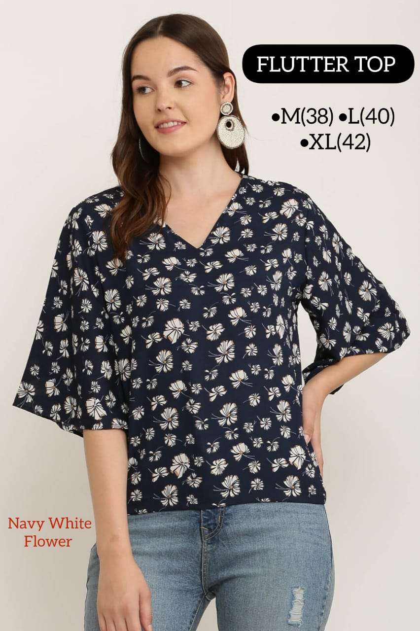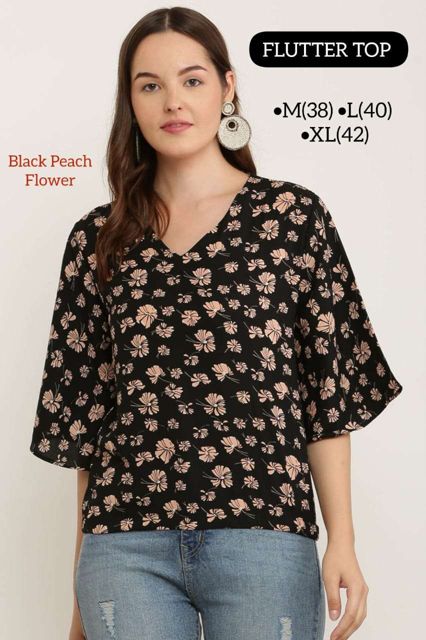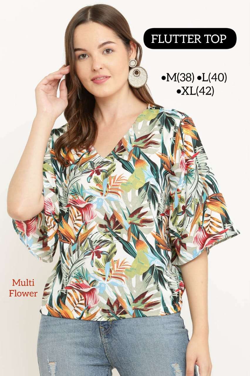 *FLUTTER TOP* *Fabric:* Premium Soft Georgette *Style:* Western *USP1:* Flutter Sleeves *USP2:* Elasticated Bottom *USP3:* Elasticated Bottom *Size:* 38 (M) • 40 (L) • 42 (XL) *Length:* 25