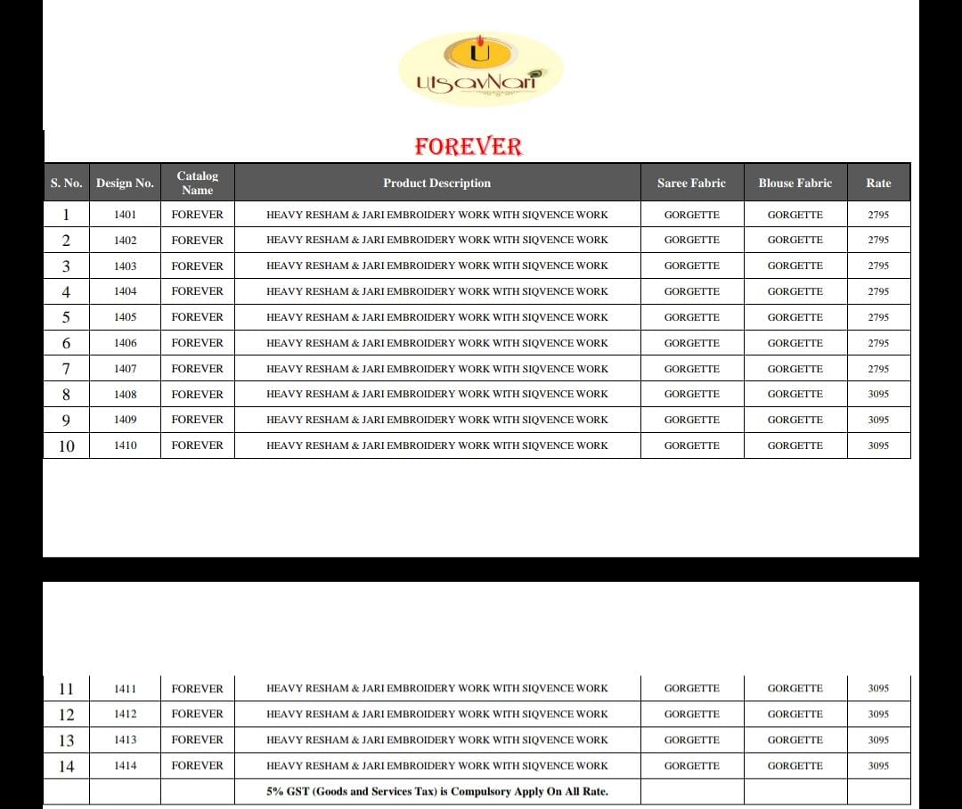 Buy Online Forever By Utsav Nari Designer Party Wear Saree Single And Set Stockiest And Supplier From Surat 14 Pcs of Full Catalogue at Wholesale Price. Looking for Forever By Utsav Nari Designer Party Wear Saree Single And Set Stockiest And Supplier From Surat Full Catalouge at Best Price? Buy Now Forever By Utsav Nari Designer Party Wear Saree Single And Set Stockiest And Supplier From Surat at Wholesale Rate of Rs 0 with Total 14 Pcs from authroized dealer and supplier of Brand. Cost of Each piece is just only Rs 0 which is very low and affordable price to resale the product in your retail store ,This is Surat based Wholesale Supplier & Dealer of Brand. Click on Brand name to Know more about Brand's products.Call or Whatsapp on 9898838984 for booking or enquiry