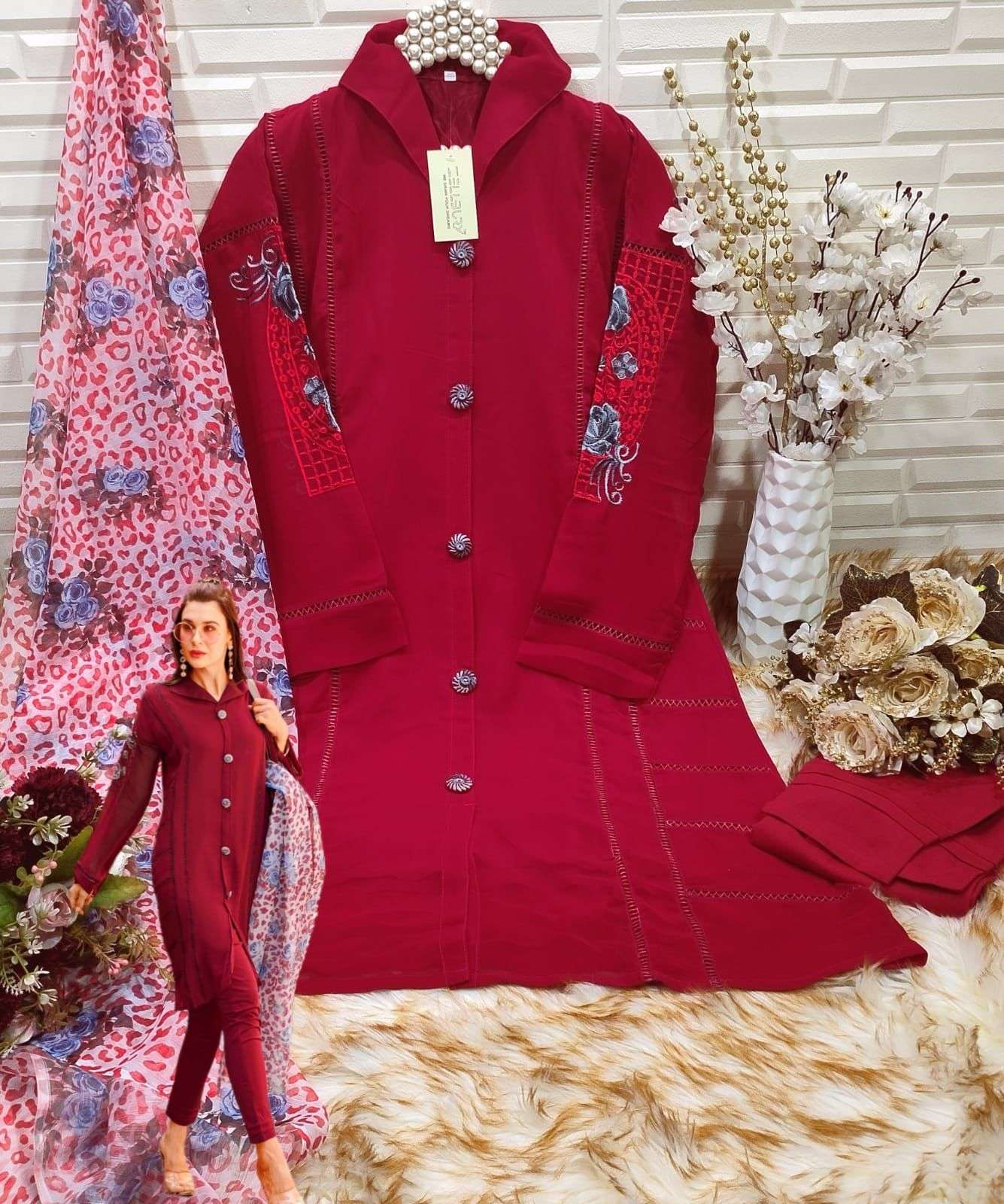 *This gorgeous silhouette with a unique color intricate neckline with handmade batton with embroidered work and lace all over the shirt and sleeve and back embroidered Paired with trousers and digital dupatta*
