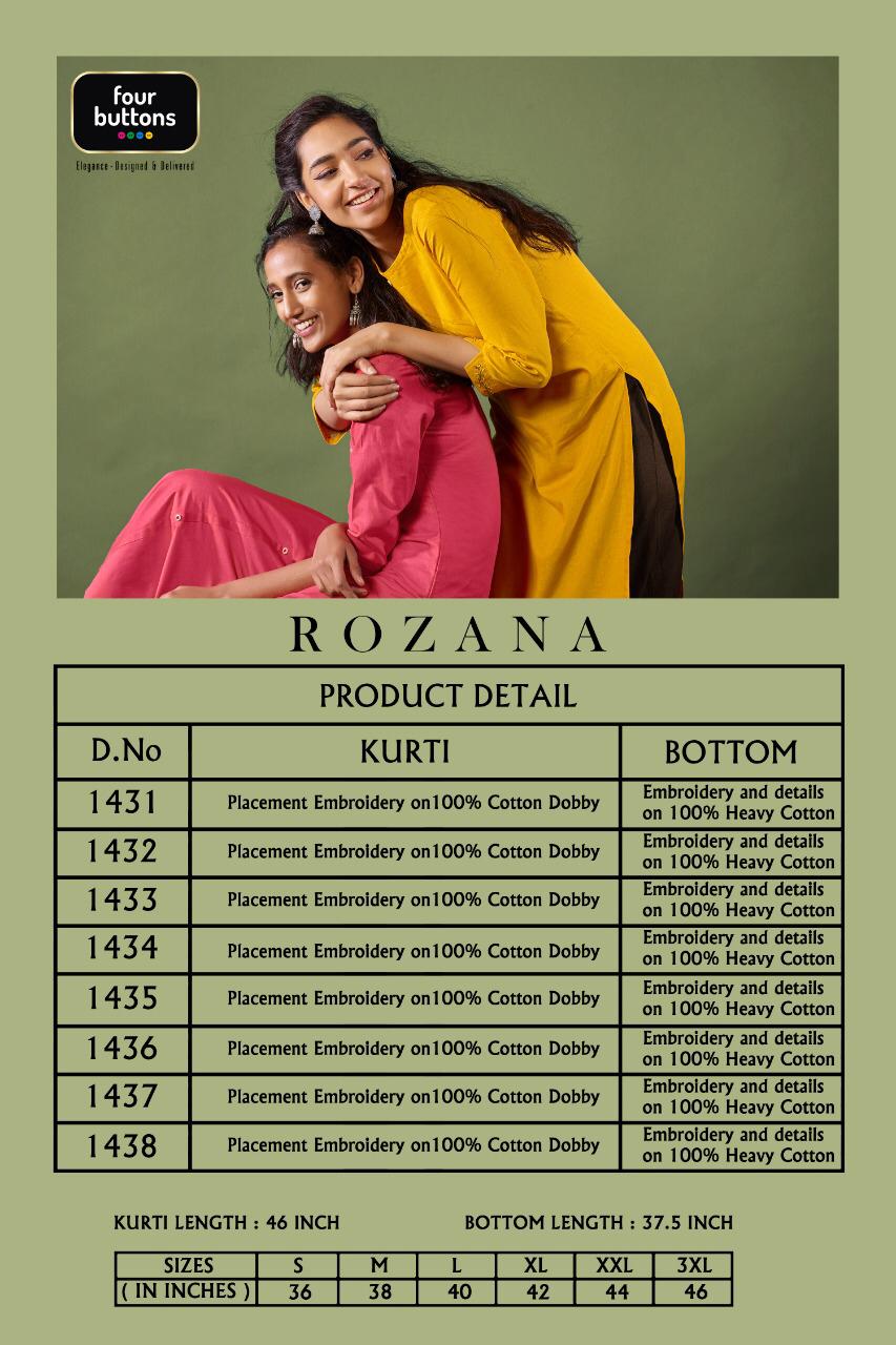 Buy Online Four Buttons Rozana Kurtis With Bottom Wholesale Dealer And Exporter India 8 Pcs of Full Catalogue at Wholesale Price. Looking for Four Buttons Rozana Kurtis With Bottom Wholesale Dealer And Exporter India Full Catalouge at Best Price? Buy Now Four Buttons Rozana Kurtis With Bottom Wholesale Dealer And Exporter India at Wholesale Rate of Rs 5560 with Total 8 Pcs from authroized dealer and supplier of FOUR BUTTONS Brand. Cost of Each piece is just only Rs 695 which is very low and affordable price to resale the product in your retail store ,This is Surat based Wholesale Supplier & Dealer of FOUR BUTTONS Brand. Click on Brand name to Know more about FOUR BUTTONS Brand's products.Call or Whatsapp on 9898838984 for booking or enquiry