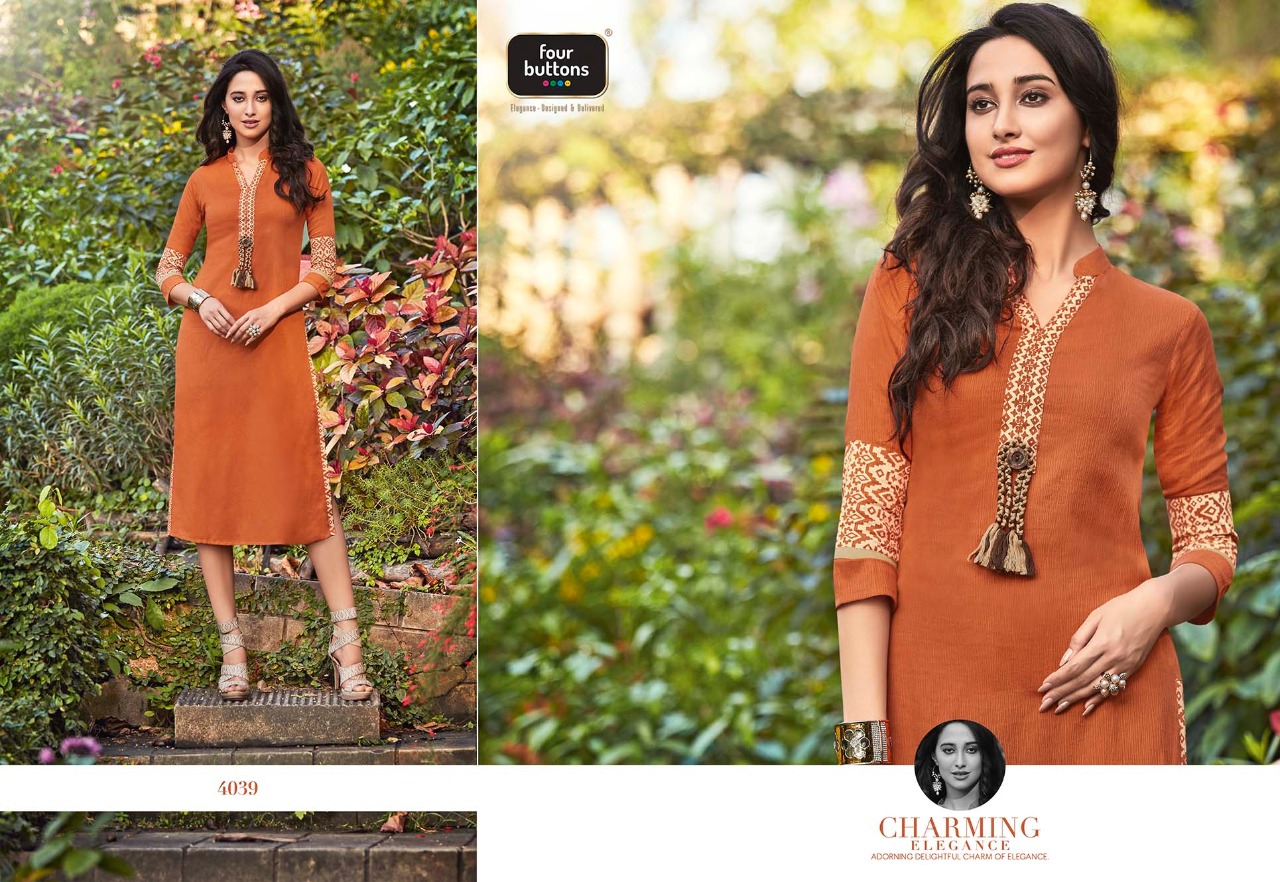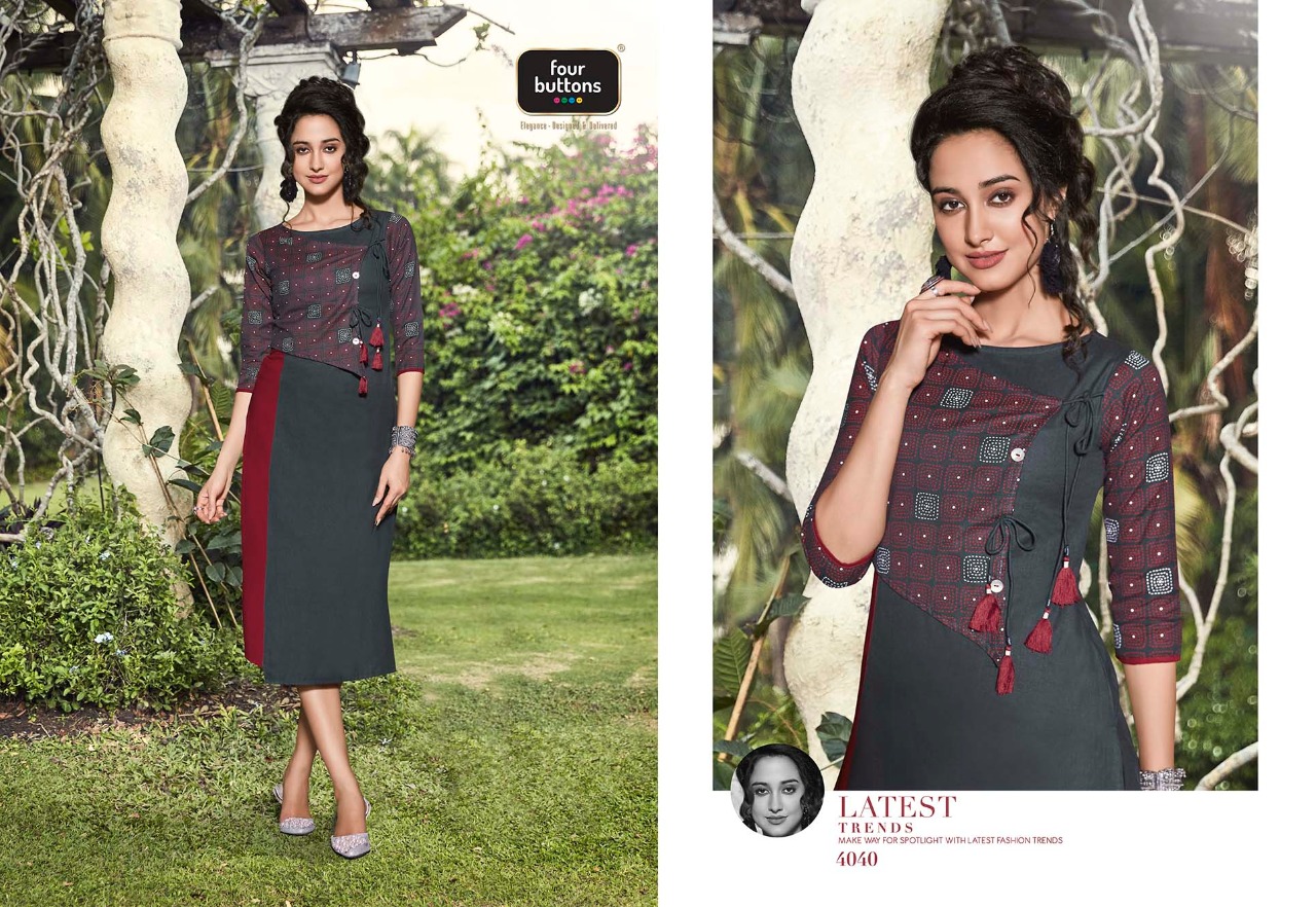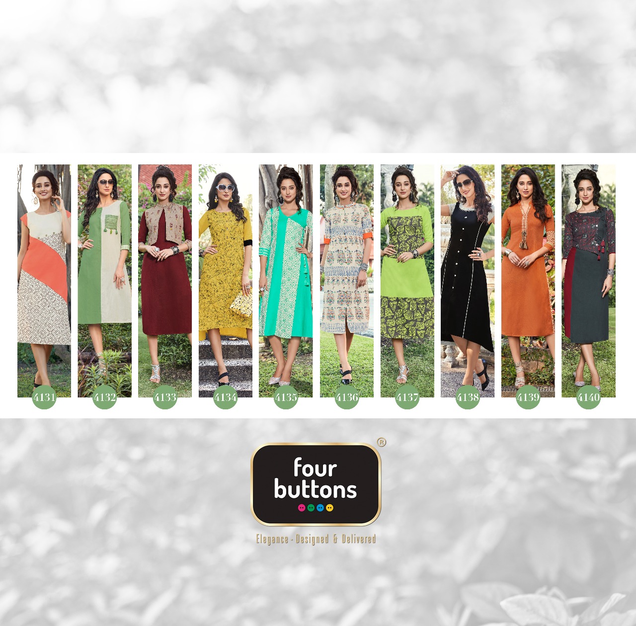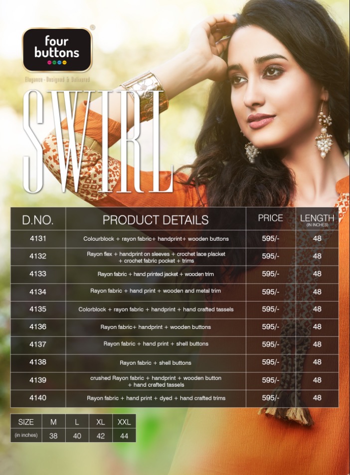 Buy Online Four Buttons Swirl 4131 Series Reyon Kurtie Catalog Supplier 10 Pcs of Full Catalogue at Wholesale Price. Looking for Four Buttons Swirl 4131 Series Reyon Kurtie Catalog Supplier Full Catalouge at Best Price? Buy Now Four Buttons Swirl 4131 Series Reyon Kurtie Catalog Supplier at Wholesale Rate of Rs 5950 with Total 10 Pcs from authroized dealer and supplier of FOUR BUTTONS Brand. Cost of Each piece is just only Rs 595 which is very low and affordable price to resale the product in your retail store ,This is Surat based Wholesale Supplier & Dealer of FOUR BUTTONS Brand. Click on Brand name to Know more about FOUR BUTTONS Brand's products.Call or Whatsapp on 9898838984 for booking or enquiry