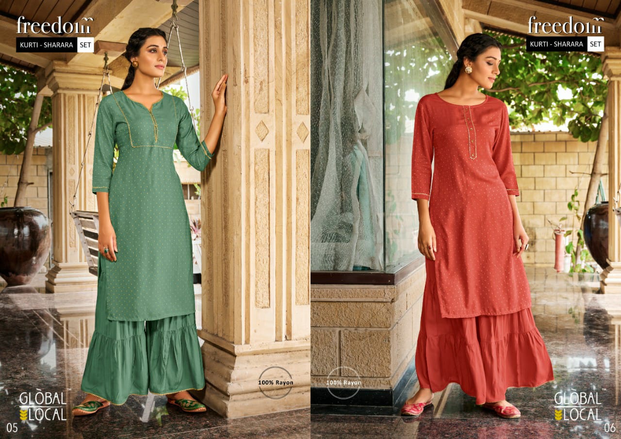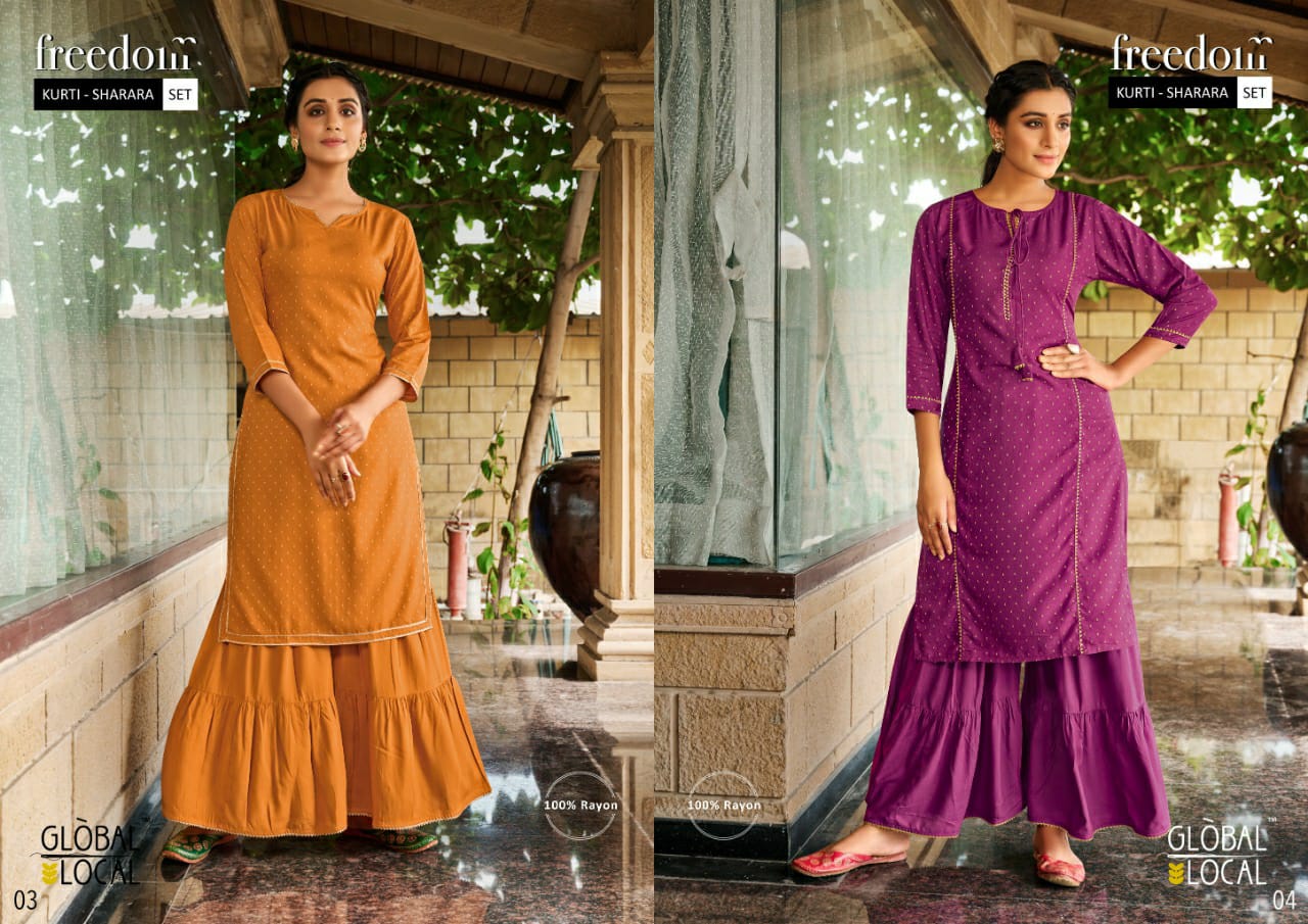 Buy Online Freedom Kurti With Sharara Pant By Global Local Wholesaler Supplier From Surat 6 Pcs of Full Catalogue at Wholesale Price. Looking for Freedom Kurti With Sharara Pant By Global Local Wholesaler Supplier From Surat Full Catalouge at Best Price? Buy Now Freedom Kurti With Sharara Pant By Global Local Wholesaler Supplier From Surat at Wholesale Rate of Rs 3930 with Total 6 Pcs from authroized dealer and supplier of Brand. Cost of Each piece is just only Rs 655 which is very low and affordable price to resale the product in your retail store ,This is Surat based Wholesale Supplier & Dealer of Brand. Click on Brand name to Know more about Brand's products.Call or Whatsapp on 9898838984 for booking or enquiry