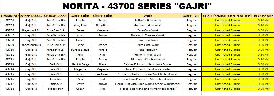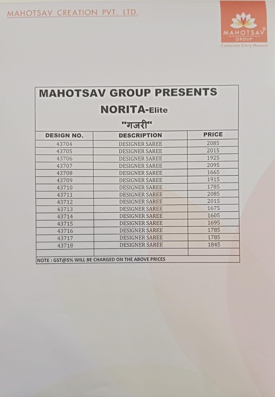 *? OUR NEW FESTIVE WEAR TRADITIONAL SAREE COLLECTION ??* *BRAND NAME : MAHOTSAV* *CATALOG : "NORITA 43700 GAJARI* *PRICE :-* *43704-2085/-* *43705-2015/-* *43706-1925/-* *43707-2095/-* *43708-1665/-* *43709-1915/-* *43710-1785/-* *43711-2085/-* *43712-2015/-* *43713-1675/-* *43714-1605/-* *43715-1695/-* *43716-1785/-* *43717-1785/-* *43718-1845/-* *5% GST EXTRA* *FABRIC:- ATTACHED* *BLOUSE TYPE : UN STITCHED* *SINGLES AVAILABLE* *SHIPPING TIME : READY TO SHIP* *NOTE : There might be slight color variation due to lightings & flash while photo shoot.* 100+singl |