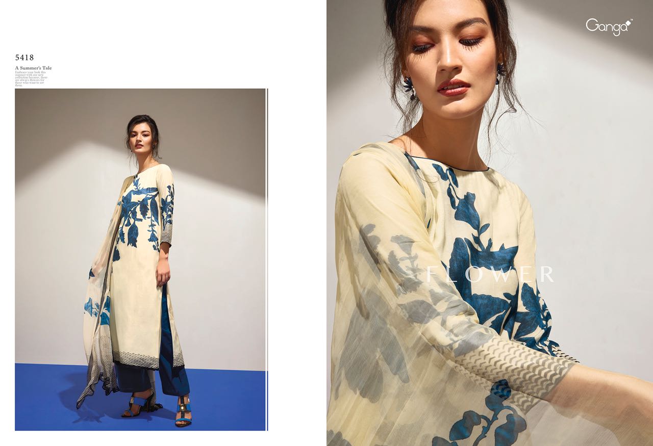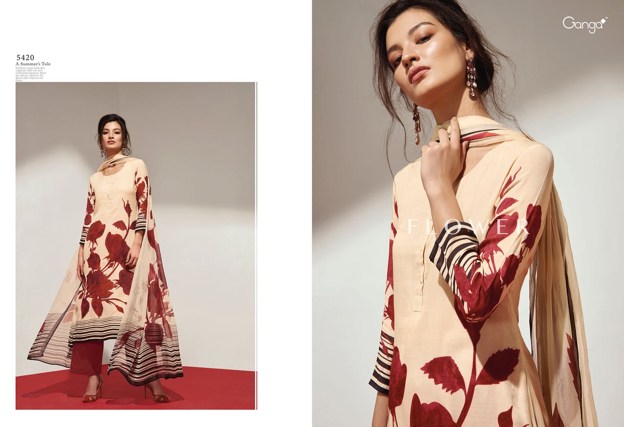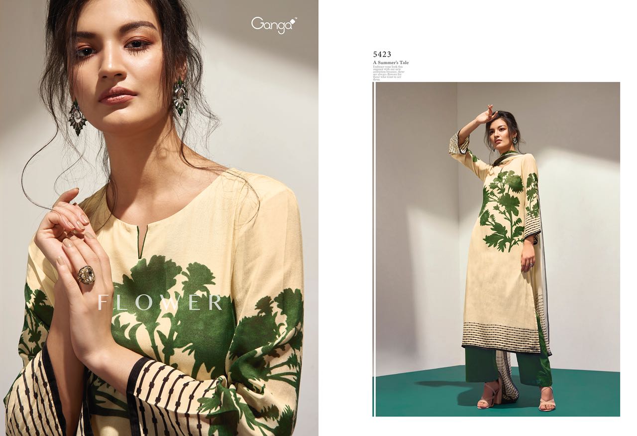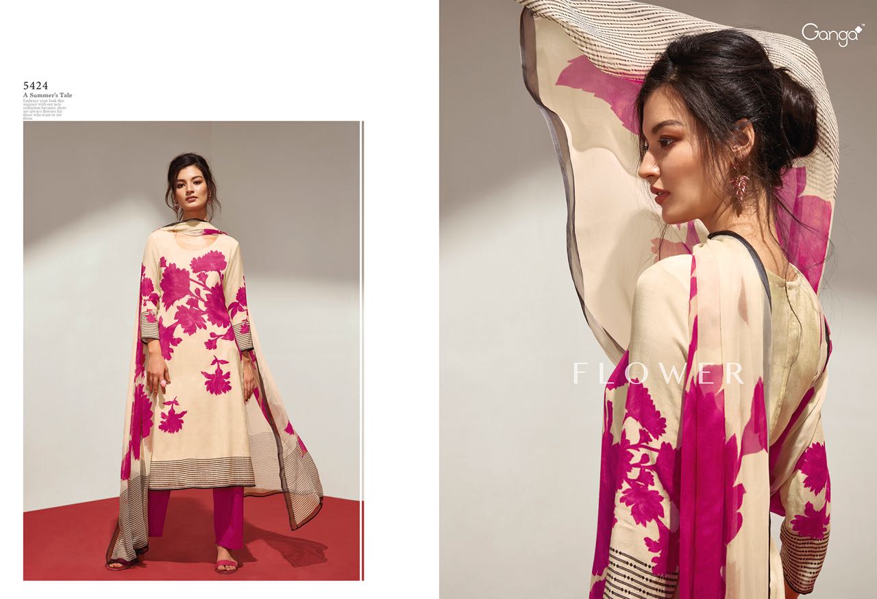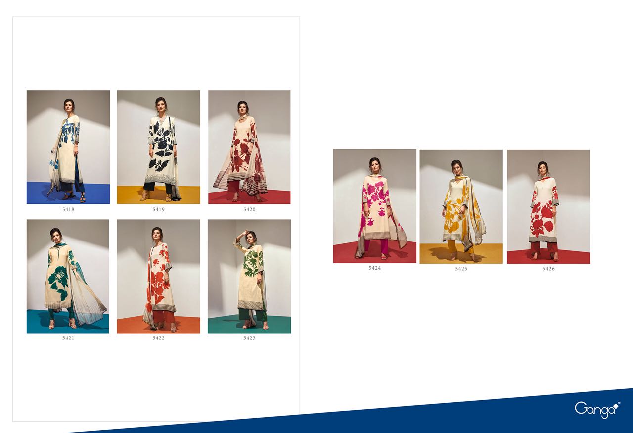 Buy Online Ganga Flower 5418 To 5426 Series Bember Muslin Print Suits 9 Pcs of Full Catalogue at Wholesale Price. Looking for Ganga Flower 5418 To 5426 Series Bember Muslin Print Suits Full Catalouge at Best Price? Buy Now Ganga Flower 5418 To 5426 Series Bember Muslin Print Suits at Wholesale Rate of Rs 13950 with Total 9 Pcs from authroized dealer and supplier of GANGA Brand. Cost of Each piece is just only Rs 1550 which is very low and affordable price to resale the product in your retail store ,This is Surat based Wholesale Supplier & Dealer of GANGA Brand. Click on Brand name to Know more about GANGA Brand's products.Call or Whatsapp on 9898838984 for booking or enquiry