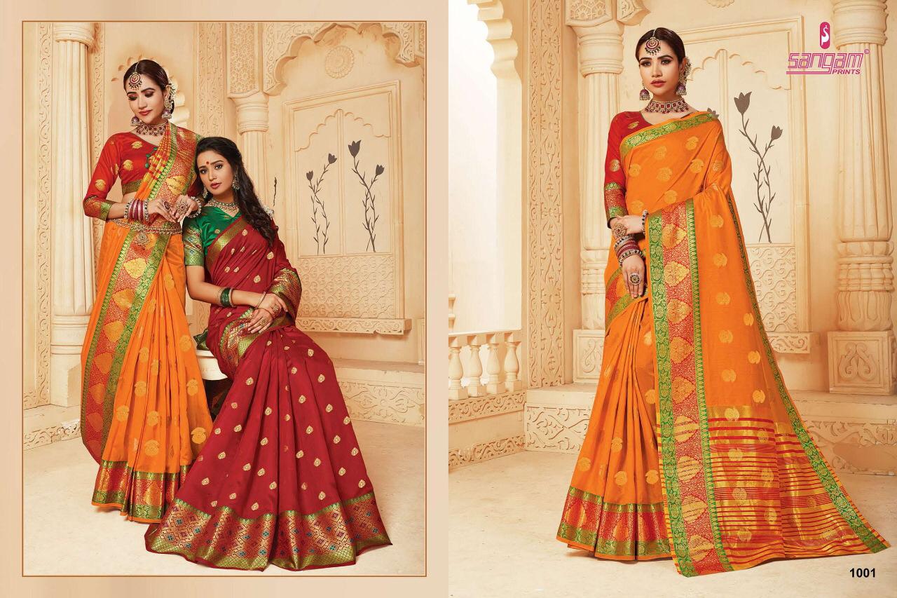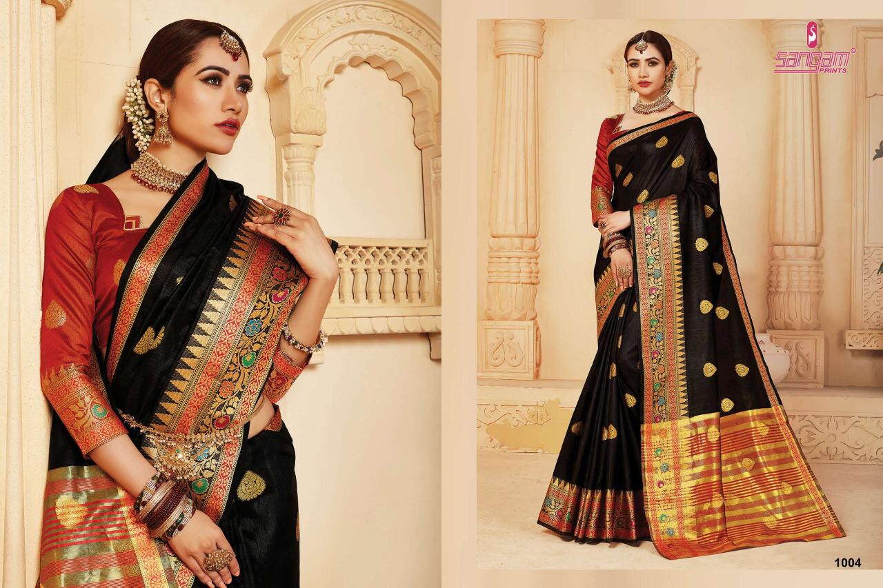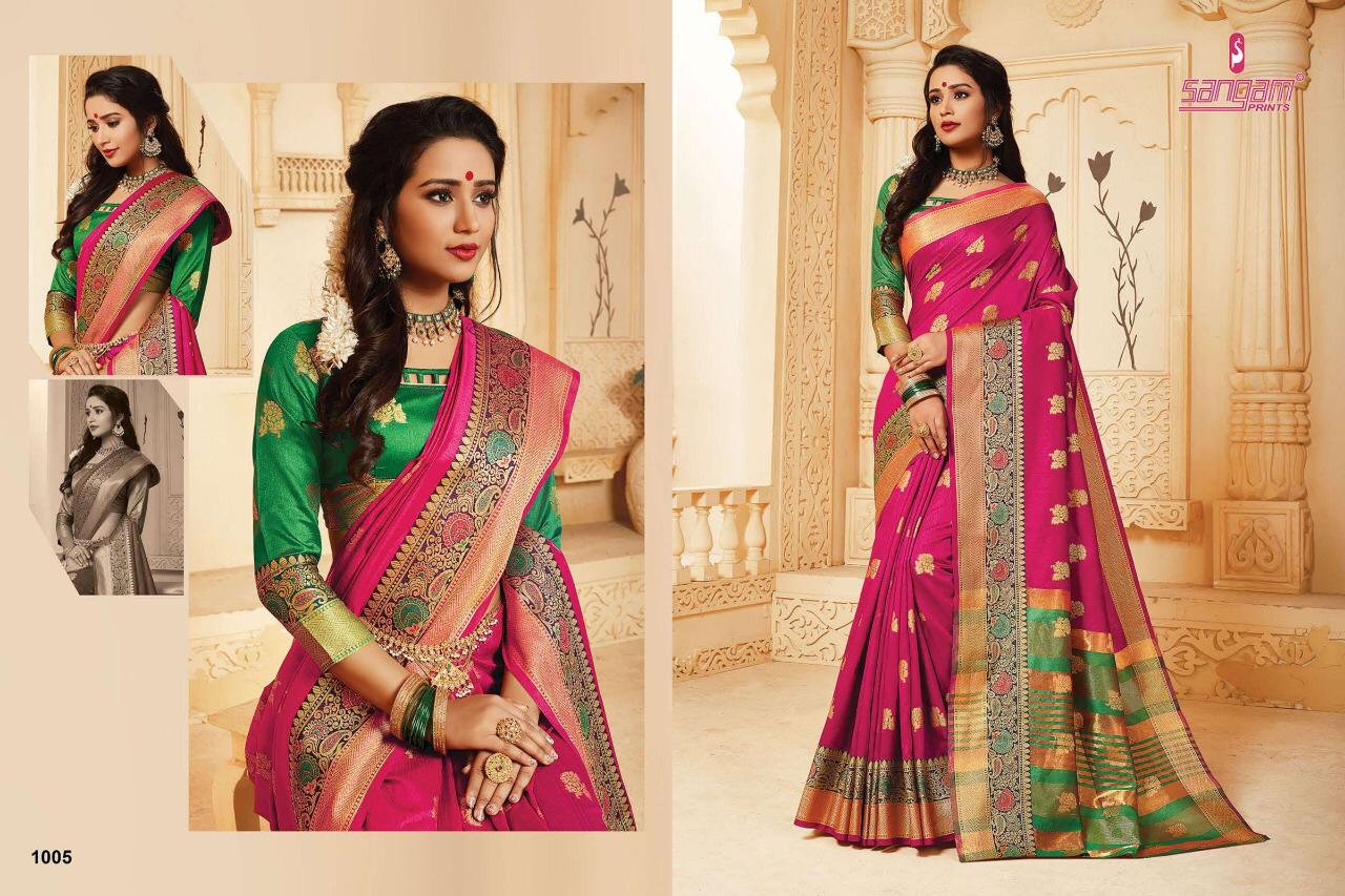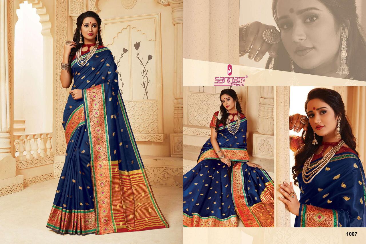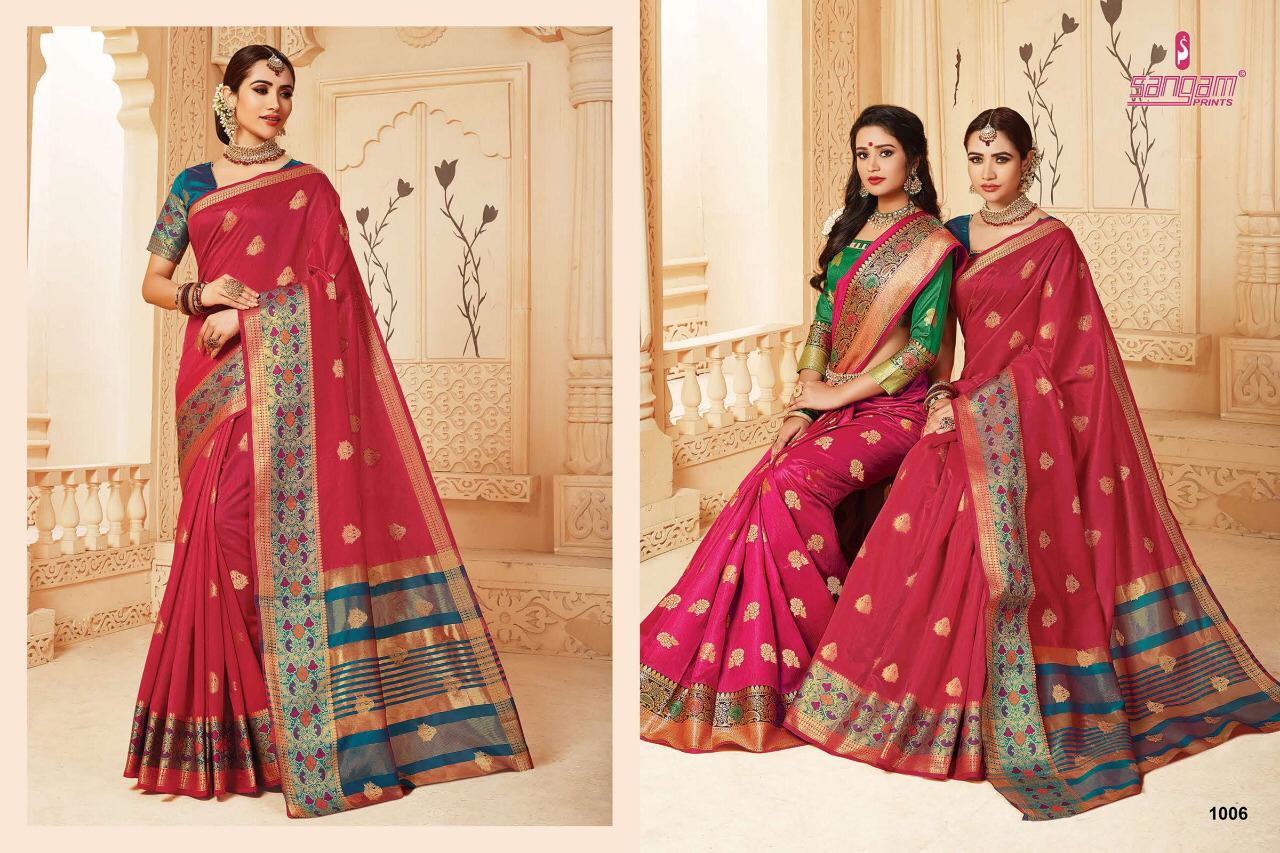 Buy Online Ganga Pallu Handloom By Sangam 1001 Series Fancy Party Wear Handloom Silk Saree Catlog Wholesaler Surat 8 Pcs of Full Catalogue at Wholesale Price. Looking for Ganga Pallu Handloom By Sangam 1001 Series Fancy Party Wear Handloom Silk Saree Catlog Wholesaler Surat Full Catalouge at Best Price? Buy Now Ganga Pallu Handloom By Sangam 1001 Series Fancy Party Wear Handloom Silk Saree Catlog Wholesaler Surat at Wholesale Rate of Rs 6080 with Total 8 Pcs from authroized dealer and supplier of SANGAM Brand. Cost of Each piece is just only Rs 760 which is very low and affordable price to resale the product in your retail store ,This is Surat based Wholesale Supplier & Dealer of SANGAM Brand. Click on Brand name to Know more about SANGAM Brand's products.Call or Whatsapp on 9898838984 for booking or enquiry
