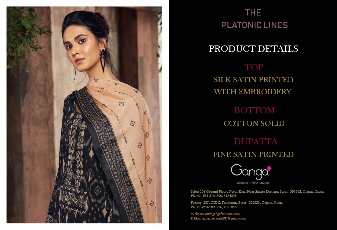 *GANGA* *PLATONIC LINES* _Top silk satin printed with Emb _ _Bottom cotton solid _ _Dupatta fine satin printed_ *1330/-* 5%Gst Applicable Set to set Delivery Tomorrow. |