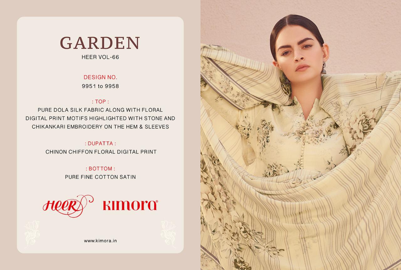 Buy Online Garden By Kimora Heer Series 9951 To 9958 Designer Suits Set And Single Wholesale Supplier Gujarat India 8 Pcs of Full Catalogue at Wholesale Price. Looking for Garden By Kimora Heer Series 9951 To 9958 Designer Suits Set And Single Wholesale Supplier Gujarat India Full Catalouge at Best Price? Buy Now Garden By Kimora Heer Series 9951 To 9958 Designer Suits Set And Single Wholesale Supplier Gujarat India at Wholesale Rate of Rs 14600 with Total 8 Pcs from authroized dealer and supplier of KIMORA Brand. Cost of Each piece is just only Rs 1825 which is very low and affordable price to resale the product in your retail store ,This is Surat based Wholesale Supplier & Dealer of KIMORA Brand. Click on Brand name to Know more about KIMORA Brand's products.Call or Whatsapp on 9898838984 for booking or enquiry