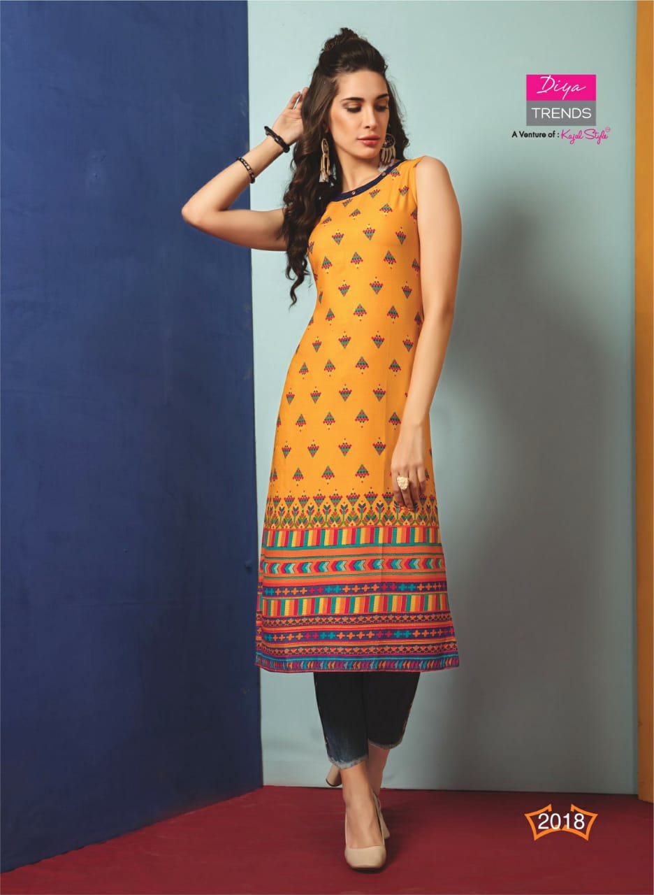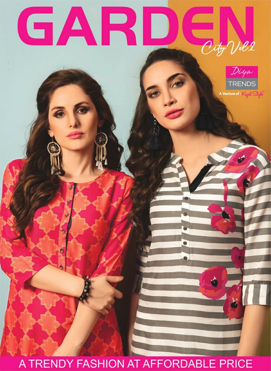 Buy Online Garden City Vol 2 By Diya Trendz 2001 Series Fancy Heavy Reyon Printed Kurti Catlog Wholesale Dealer Surat 20 Pcs of Full Catalogue at Wholesale Price. Looking for Garden City Vol 2 By Diya Trendz 2001 Series Fancy Heavy Reyon Printed Kurti Catlog Wholesale Dealer Surat Full Catalouge at Best Price? Buy Now Garden City Vol 2 By Diya Trendz 2001 Series Fancy Heavy Reyon Printed Kurti Catlog Wholesale Dealer Surat at Wholesale Rate of Rs 5300 with Total 20 Pcs from authroized dealer and supplier of KAJAL STYLE Brand. Cost of Each piece is just only Rs 265 which is very low and affordable price to resale the product in your retail store ,This is Surat based Wholesale Supplier & Dealer of KAJAL STYLE Brand. Click on Brand name to Know more about KAJAL STYLE Brand's products.Call or Whatsapp on 9898838984 for booking or enquiry