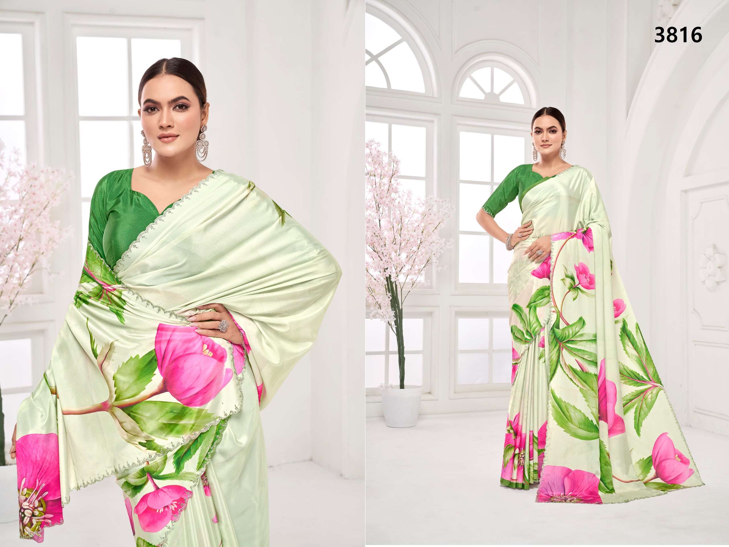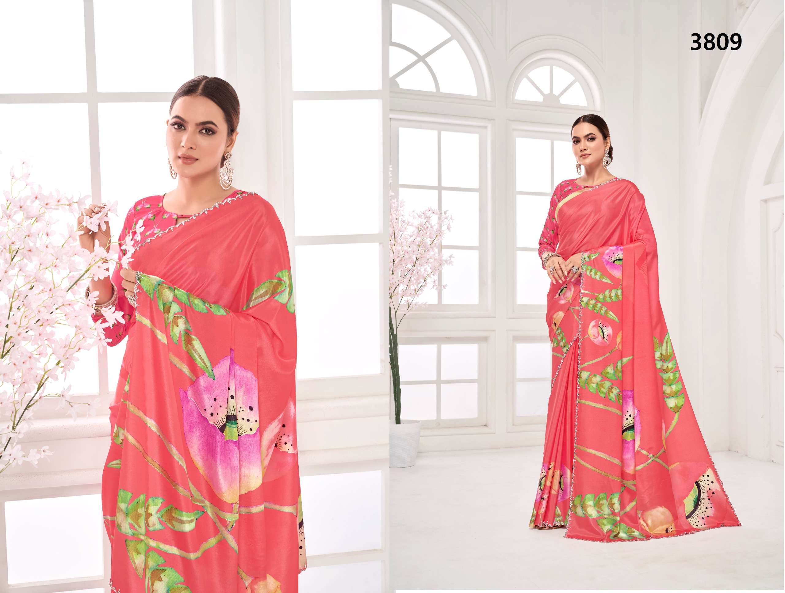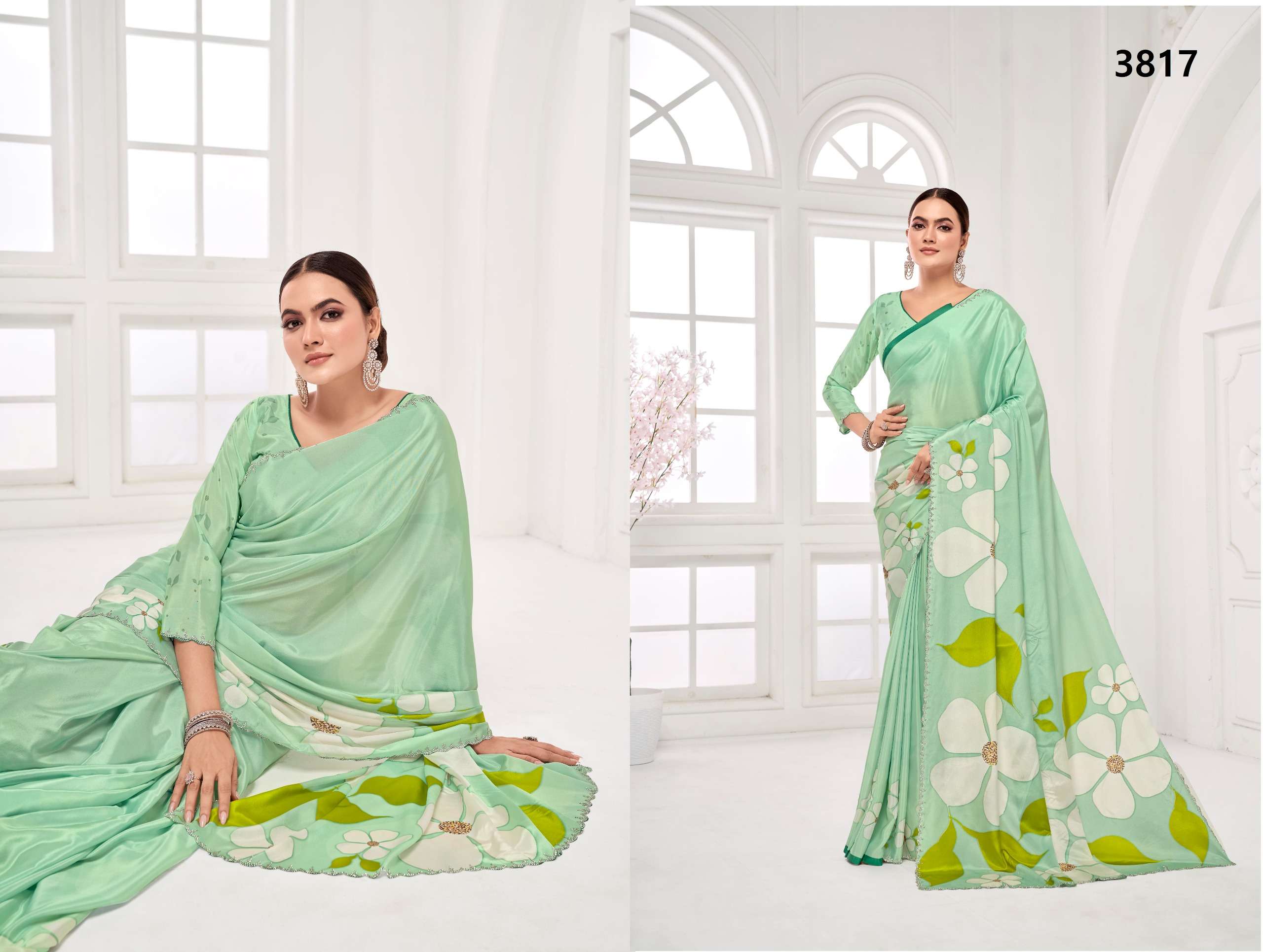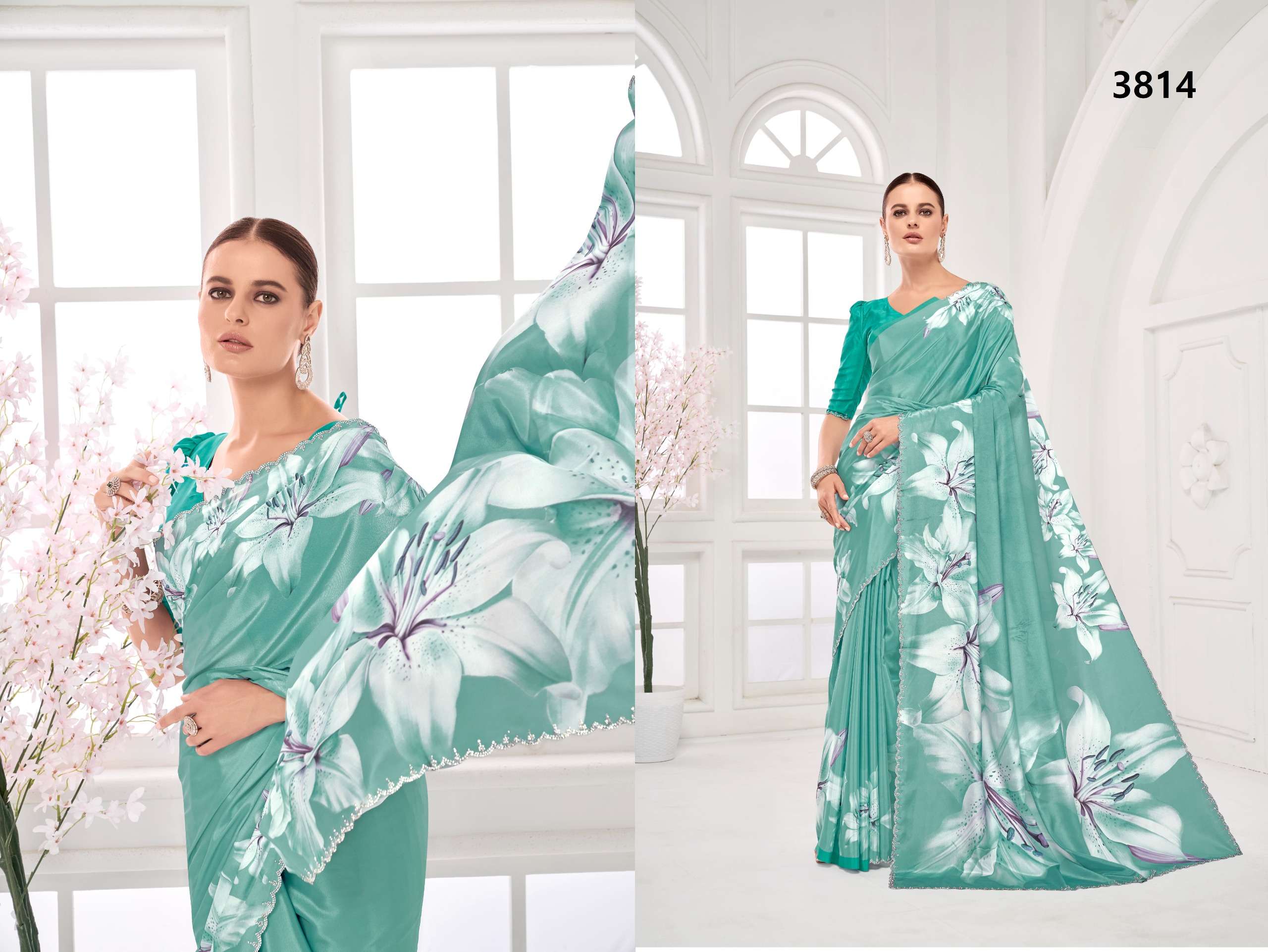 *Inject vibrant charm into your wardrobe with Satin Crepe Saree with Vibrant Floral Print. Made from breathable Satin Crepe, this saree combines modern style with floral finesse. This saree enhanced by rich Digital Floral Print With warovski crystal embellished border,, making it the perfect ensemble for Party gatherings.*