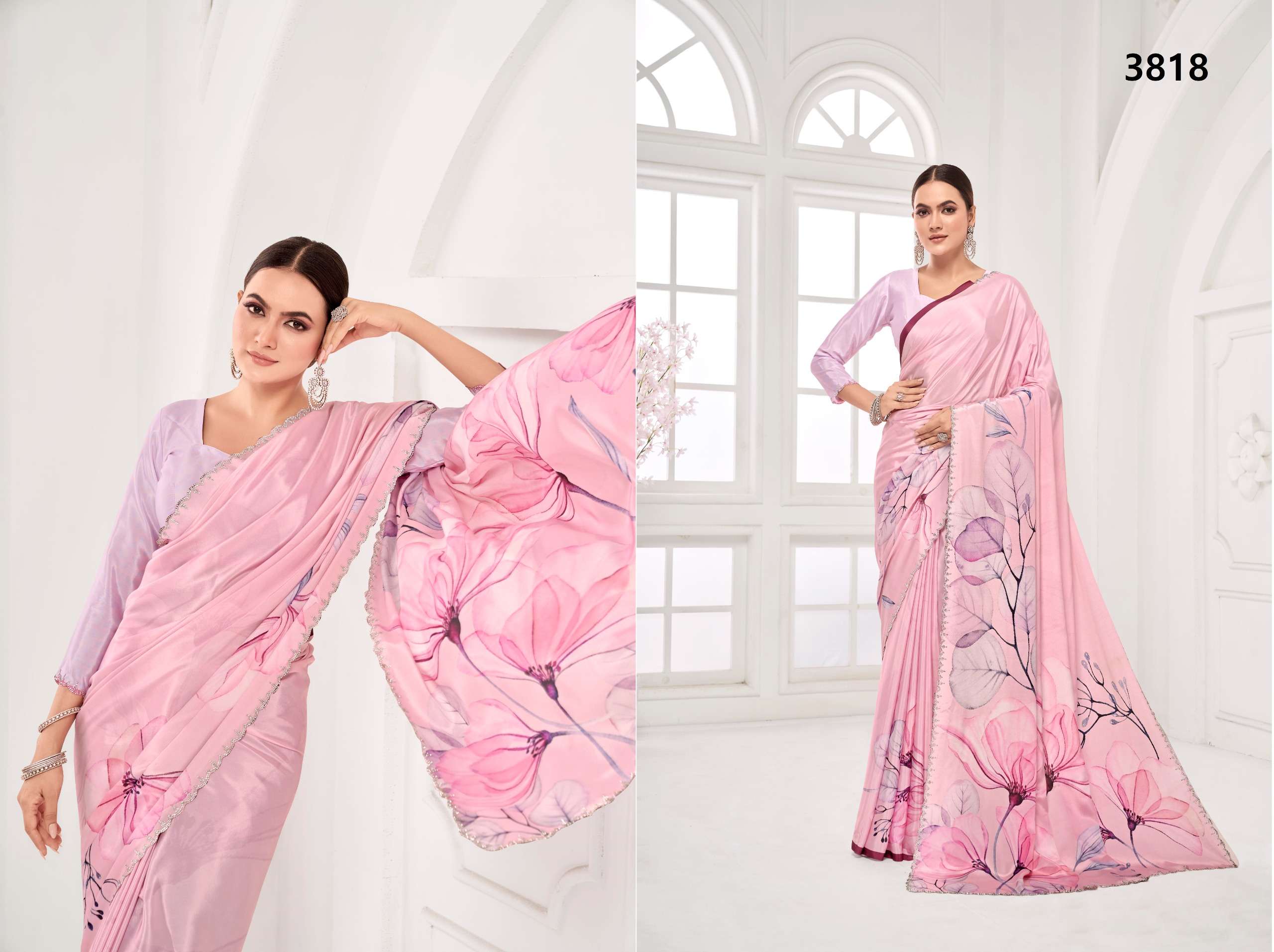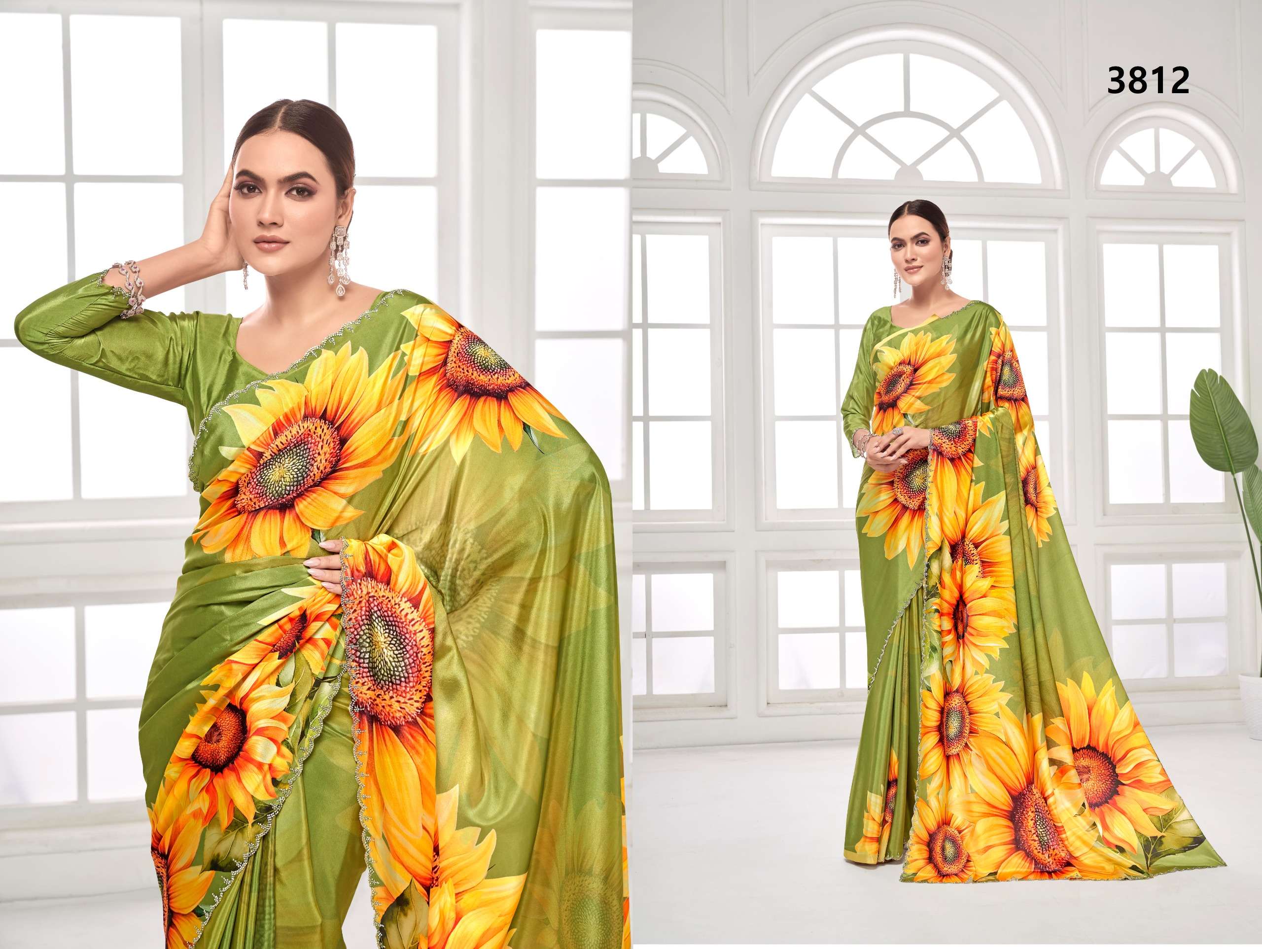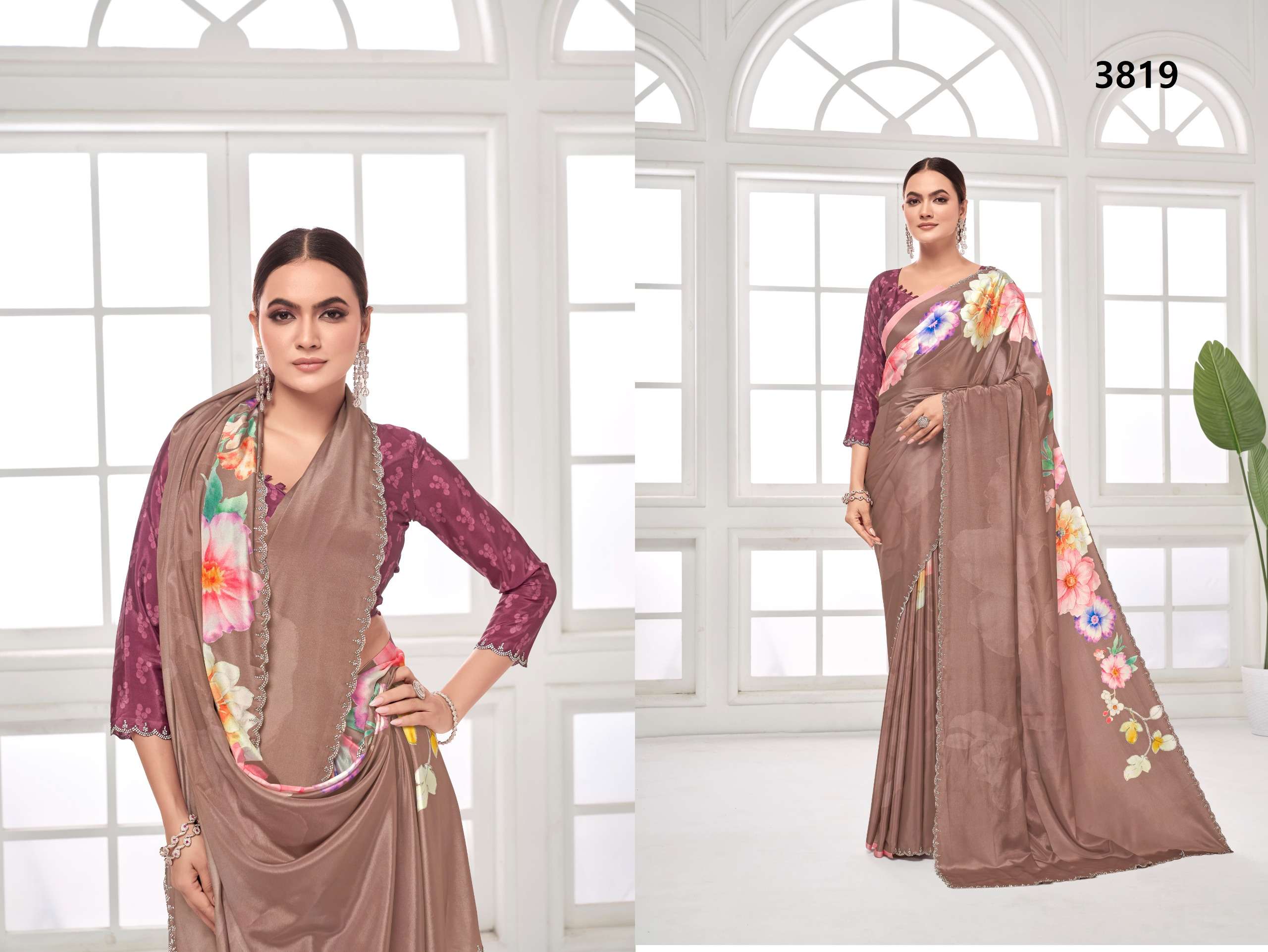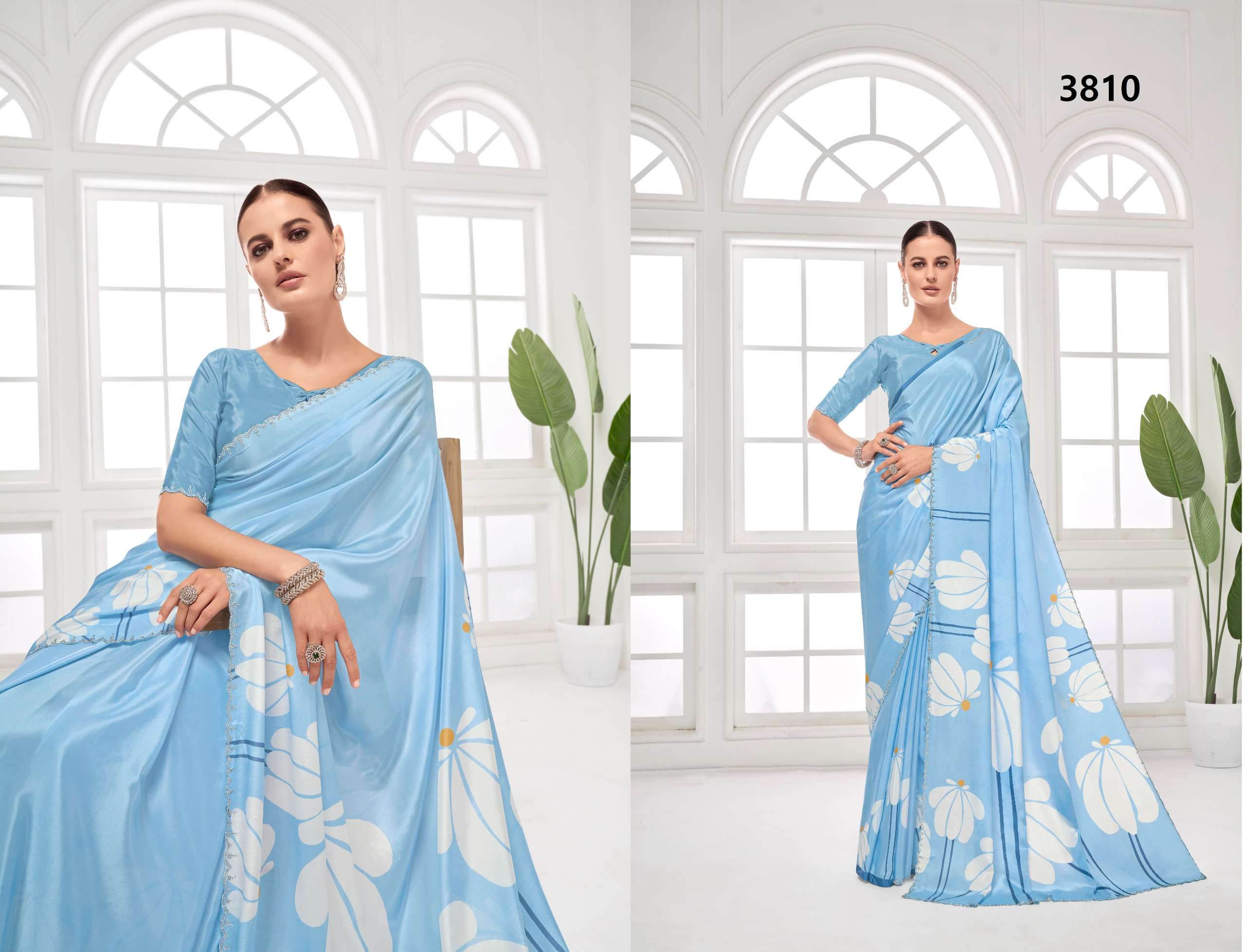 *Inject vibrant charm into your wardrobe with Satin Crepe Saree with Vibrant Floral Print. Made from breathable Satin Crepe, this saree combines modern style with floral finesse. This saree enhanced by rich Digital Floral Print With warovski crystal embellished border,, making it the perfect ensemble for Party gatherings.*