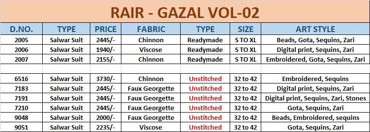 Buy Online GAZAL VOL 02 by RAIR Fancy suit collection manufacturer surat 10 Pcs of Full Catalogue at Wholesale Price. Looking for GAZAL VOL 02 by RAIR Fancy suit collection manufacturer surat Full Catalouge at Best Price? Buy Now GAZAL VOL 02 by RAIR Fancy suit collection manufacturer surat at Wholesale Rate of Rs 0 with Total 10 Pcs from authroized dealer and supplier of BRAND'S Brand. Cost of Each piece is just only Rs 0 which is very low and affordable price to resale the product in your retail store ,This is Surat based Wholesale Supplier & Dealer of BRAND'S Brand. Click on Brand name to Know more about BRAND'S Brand's products.Call or Whatsapp on 9898838984 for booking or enquiry