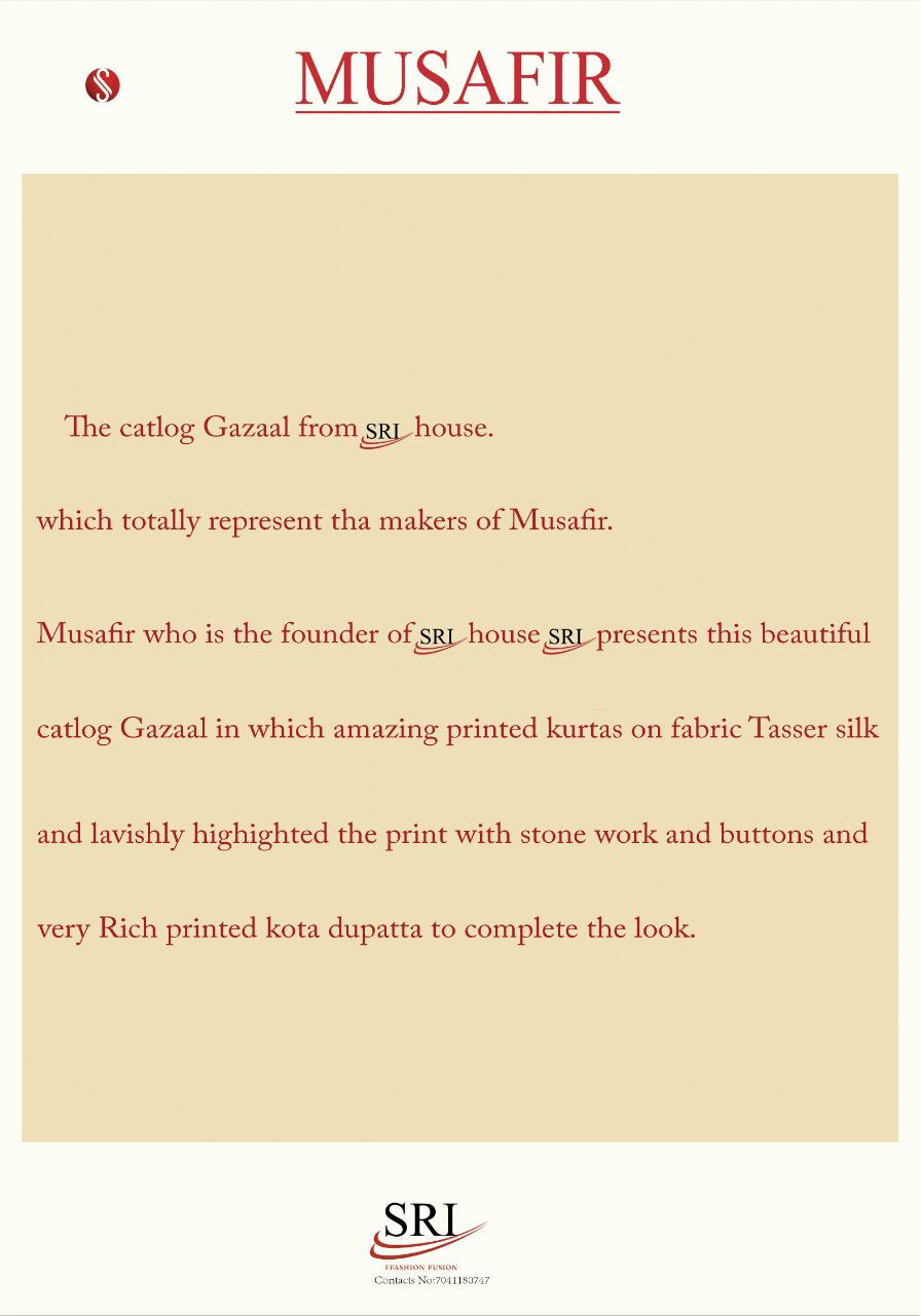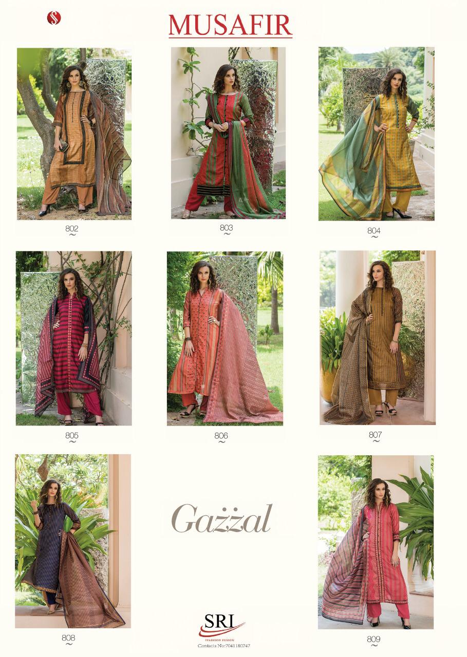 Buy Online Gazzal By Sri Musafir 802 Series Fancy Cotton Satin Printed Salwar Kameez Catlog Wholesaler Surat 8 Pcs of Full Catalogue at Wholesale Price. Looking for Gazzal By Sri Musafir 802 Series Fancy Cotton Satin Printed Salwar Kameez Catlog Wholesaler Surat Full Catalouge at Best Price? Buy Now Gazzal By Sri Musafir 802 Series Fancy Cotton Satin Printed Salwar Kameez Catlog Wholesaler Surat at Wholesale Rate of Rs 11960 with Total 8 Pcs from authroized dealer and supplier of Brand. Cost of Each piece is just only Rs 1495 which is very low and affordable price to resale the product in your retail store ,This is Surat based Wholesale Supplier & Dealer of Brand. Click on Brand name to Know more about Brand's products.Call or Whatsapp on 9898838984 for booking or enquiry