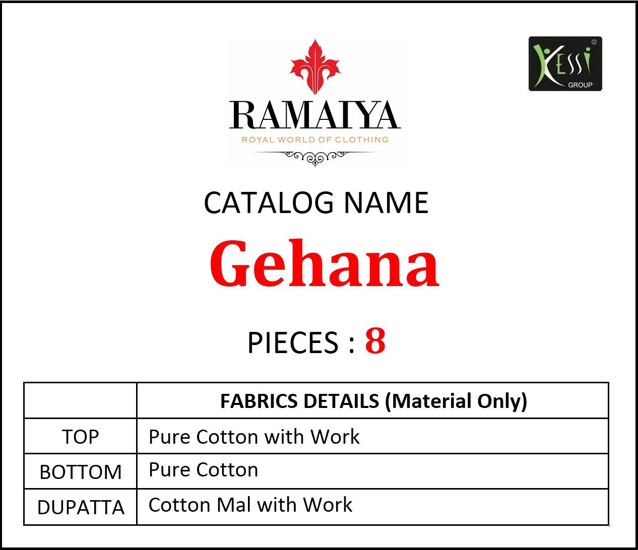 ? *Ramaiya (Kessi Fabrics Pvt. Ltd.)* has launched _Catalog name_ : *Gehana* ? _Fabric Details_ ? ?Top :- Pure Cotton with Work ?Bottom :- Pure Cotton ?Dupatta :- Cotton Mal with Work ?Total Design :- 8 RATE - 649 /- Set To Set . GST 5 Percent Extra. ?Dispatching 4 to 5 days . ?Booking started from now... ?Order yours soon.... |