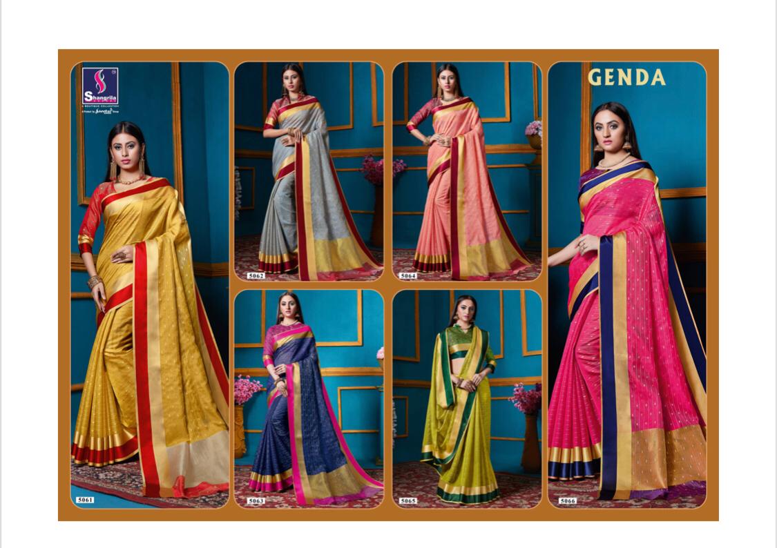 GENDA Shangrila Presents the new trend of weaving sarees with contrast border and Blouse. Feel the new range of sarees with weaved sarees of Shangrila. 6 pcs 695/- Set to set only 5% GST |