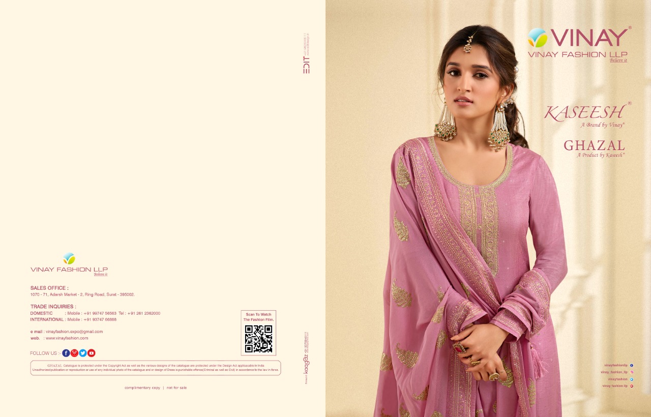 Buy Online Ghazal By Kaseesh By Vinay Fashion Designer Suits Dealer And Exporter Surat Gujarat 7 Pcs of Full Catalogue at Wholesale Price. Looking for Ghazal By Kaseesh By Vinay Fashion Designer Suits Dealer And Exporter Surat Gujarat Full Catalouge at Best Price? Buy Now Ghazal By Kaseesh By Vinay Fashion Designer Suits Dealer And Exporter Surat Gujarat at Wholesale Rate of Rs 11900 with Total 7 Pcs from authroized dealer and supplier of Brand. Cost of Each piece is just only Rs 1700 which is very low and affordable price to resale the product in your retail store ,This is Surat based Wholesale Supplier & Dealer of Brand. Click on Brand name to Know more about Brand's products.Call or Whatsapp on 9898838984 for booking or enquiry
