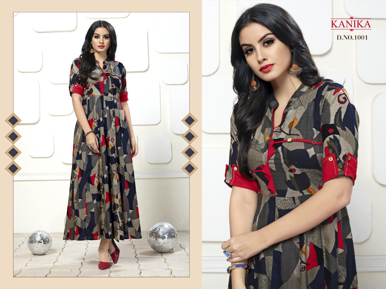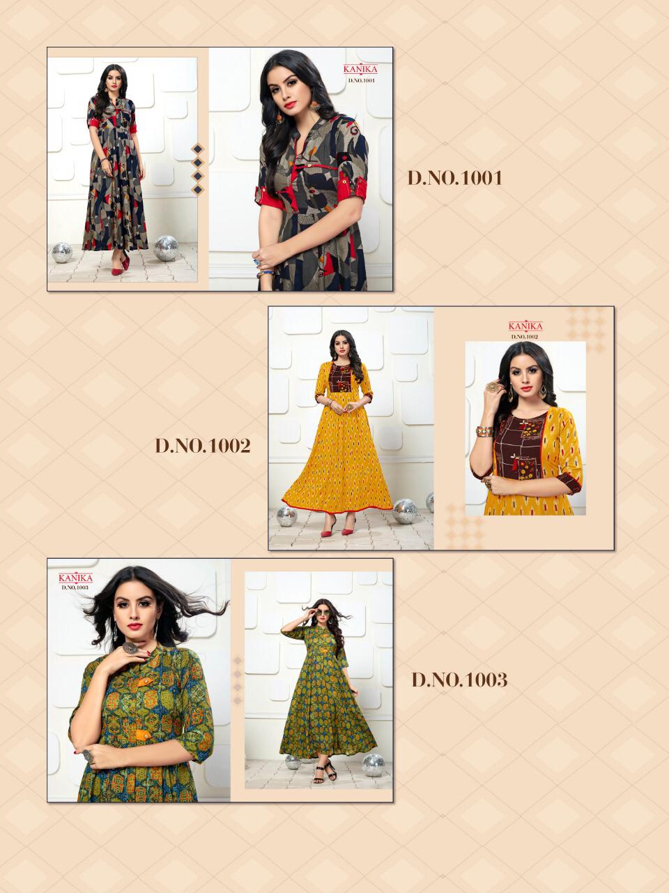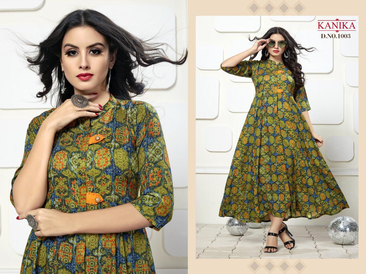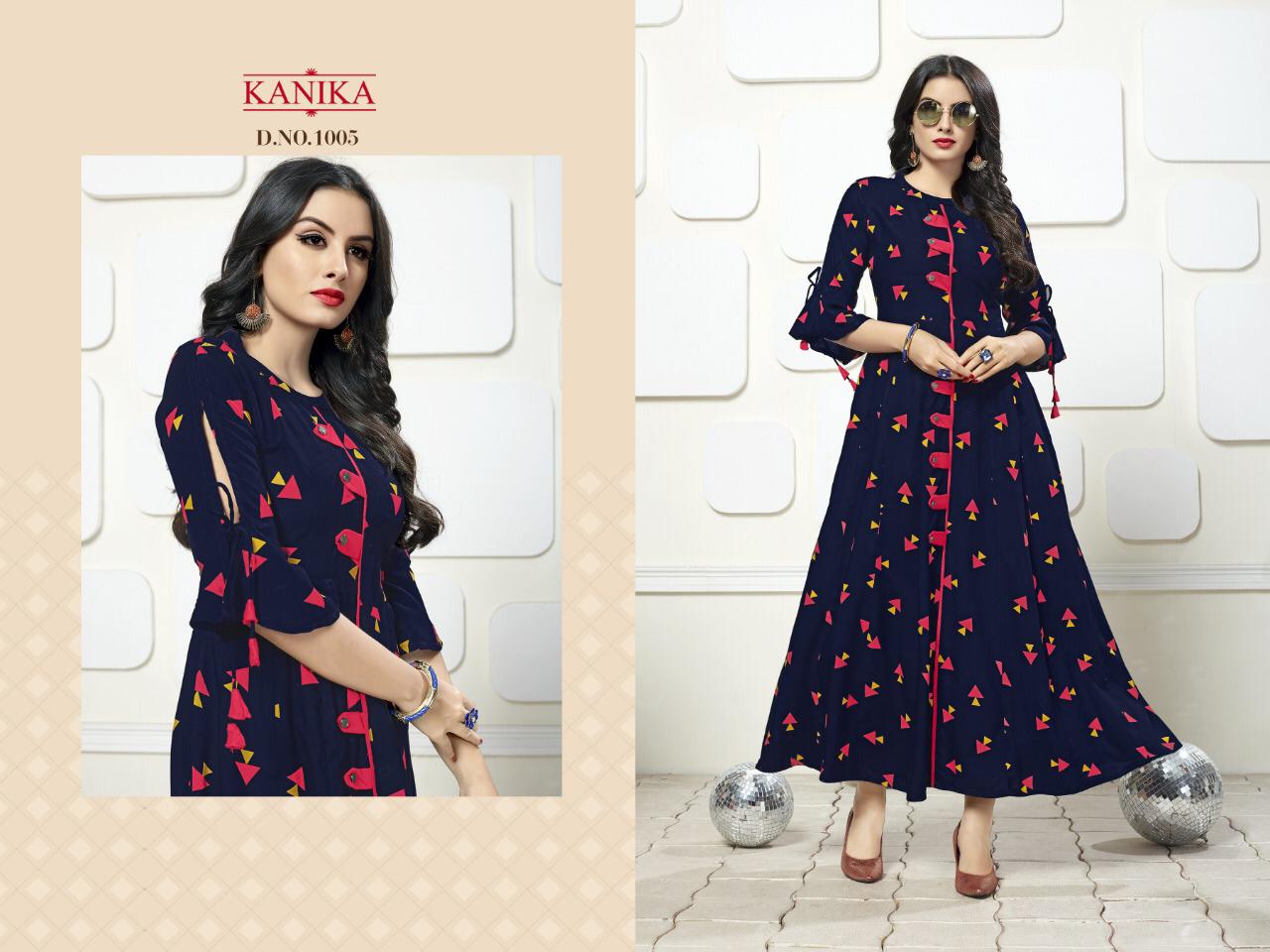 Buy Online Ghoomar Anarkali By Kanika 1001 Series Fancy Reyon Printed Kurti Collection Wholesaler Surat 6 Pcs of Full Catalogue at Wholesale Price. Looking for Ghoomar Anarkali By Kanika 1001 Series Fancy Reyon Printed Kurti Collection Wholesaler Surat Full Catalouge at Best Price? Buy Now Ghoomar Anarkali By Kanika 1001 Series Fancy Reyon Printed Kurti Collection Wholesaler Surat at Wholesale Rate of Rs 3810 with Total 6 Pcs from authroized dealer and supplier of KANIKA Brand. Cost of Each piece is just only Rs 635 which is very low and affordable price to resale the product in your retail store ,This is Surat based Wholesale Supplier & Dealer of KANIKA Brand. Click on Brand name to Know more about KANIKA Brand's products.Call or Whatsapp on 9898838984 for booking or enquiry