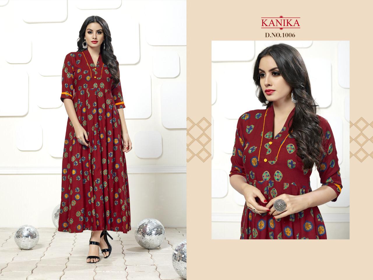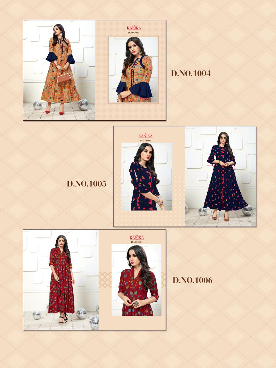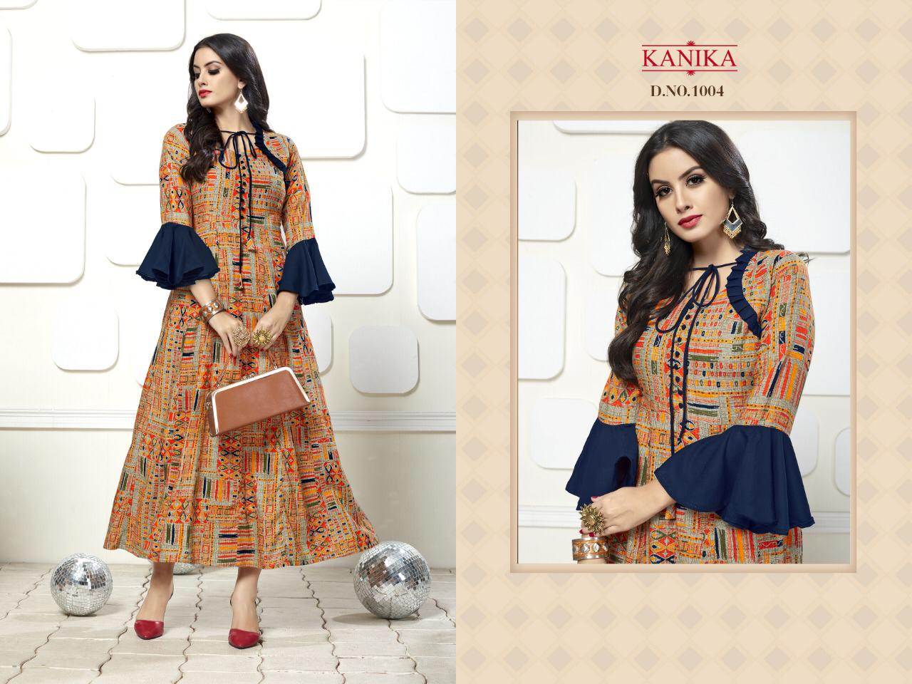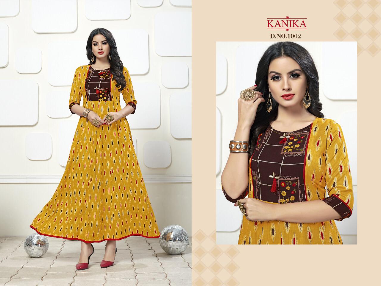 Buy Online Ghoomar Anarkali By Kanika 1001 Series Fancy Reyon Printed Kurti Collection Wholesaler Surat 6 Pcs of Full Catalogue at Wholesale Price. Looking for Ghoomar Anarkali By Kanika 1001 Series Fancy Reyon Printed Kurti Collection Wholesaler Surat Full Catalouge at Best Price? Buy Now Ghoomar Anarkali By Kanika 1001 Series Fancy Reyon Printed Kurti Collection Wholesaler Surat at Wholesale Rate of Rs 3810 with Total 6 Pcs from authroized dealer and supplier of KANIKA Brand. Cost of Each piece is just only Rs 635 which is very low and affordable price to resale the product in your retail store ,This is Surat based Wholesale Supplier & Dealer of KANIKA Brand. Click on Brand name to Know more about KANIKA Brand's products.Call or Whatsapp on 9898838984 for booking or enquiry