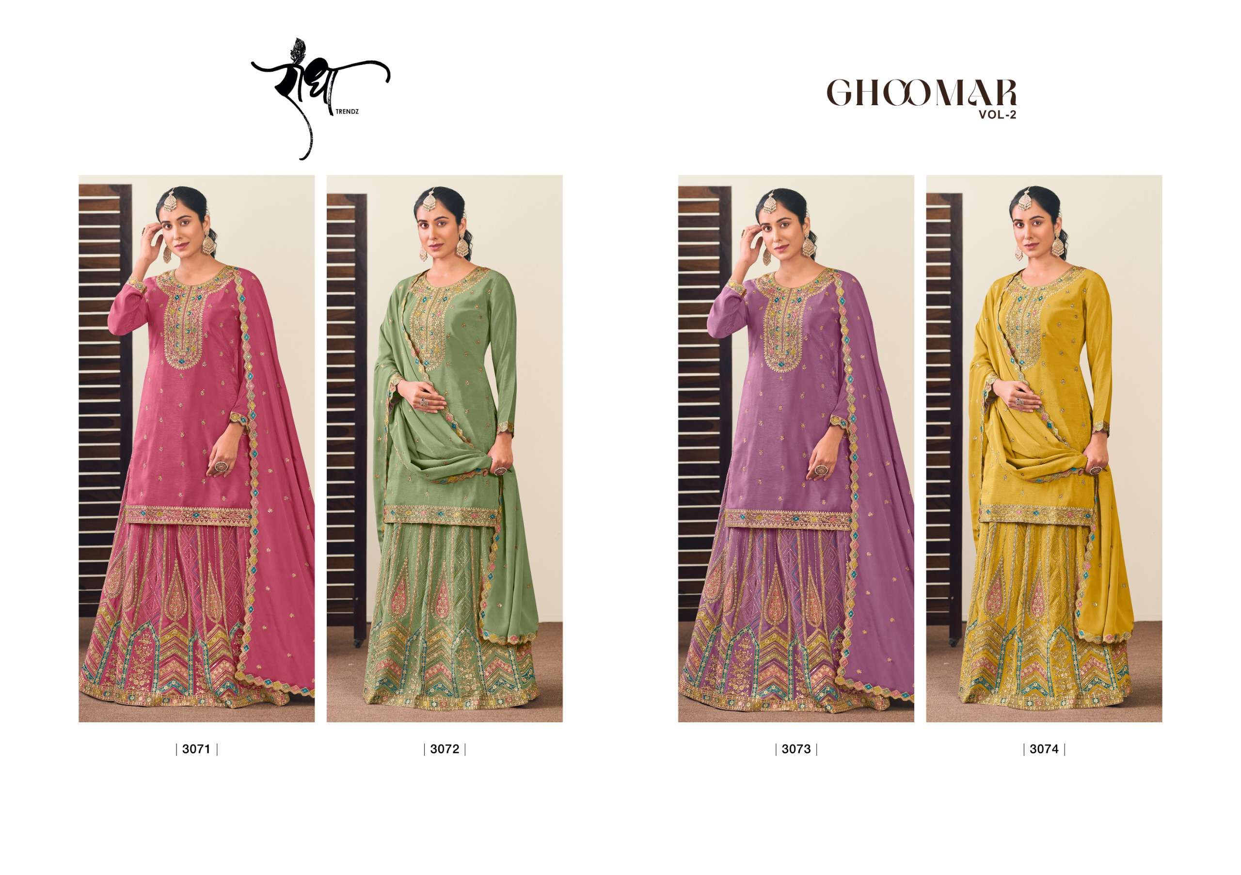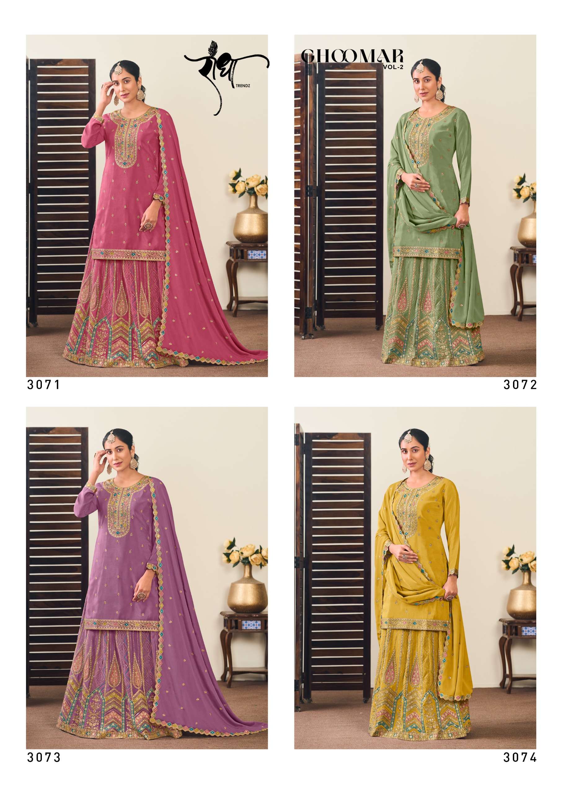 Buy Online GHOOMAR vol 2 By RADHA TRENDZ PREMIUM Chinon Sarara suit collection manufacturer surat 4 Pcs of Full Catalogue at Wholesale Price. Looking for GHOOMAR vol 2 By RADHA TRENDZ PREMIUM Chinon Sarara suit collection manufacturer surat Full Catalouge at Best Price? Buy Now GHOOMAR vol 2 By RADHA TRENDZ PREMIUM Chinon Sarara suit collection manufacturer surat at Wholesale Rate of Rs 11180 with Total 4 Pcs from authroized dealer and supplier of Radha Trendz Brand. Cost of Each piece is just only Rs 2795 which is very low and affordable price to resale the product in your retail store ,This is Surat based Wholesale Supplier & Dealer of Radha Trendz Brand. Click on Brand name to Know more about Radha Trendz Brand's products.Call or Whatsapp on 9898838984 for booking or enquiry
