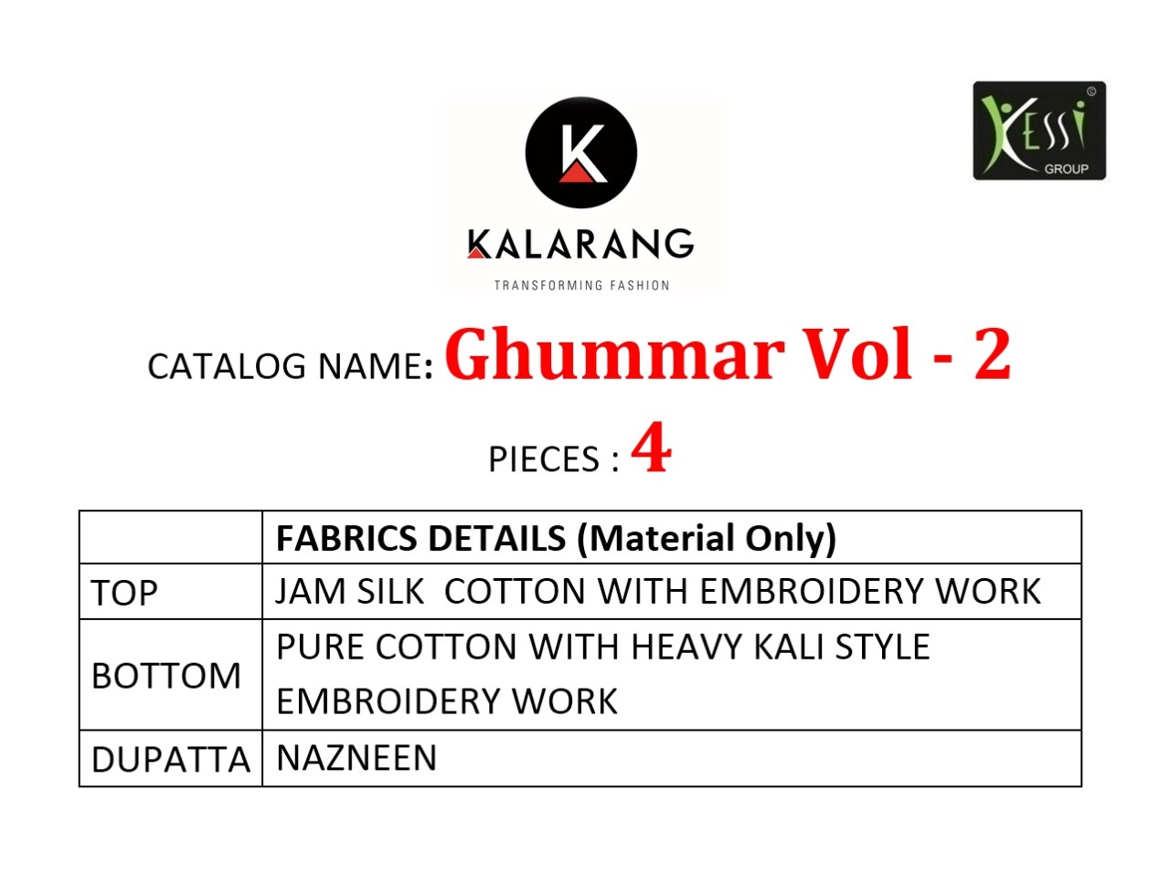 Buy Online Ghummar Vol 2 By Kalarang Jam Silk Cotton Dress Materials Wholesale Supplier Surat 4 Pcs of Full Catalogue at Wholesale Price. Looking for Ghummar Vol 2 By Kalarang Jam Silk Cotton Dress Materials Wholesale Supplier Surat Full Catalouge at Best Price? Buy Now Ghummar Vol 2 By Kalarang Jam Silk Cotton Dress Materials Wholesale Supplier Surat at Wholesale Rate of Rs 4396 with Total 4 Pcs from authroized dealer and supplier of KALARANG Brand. Cost of Each piece is just only Rs 1099 which is very low and affordable price to resale the product in your retail store ,This is Surat based Wholesale Supplier & Dealer of KALARANG Brand. Click on Brand name to Know more about KALARANG Brand's products.Call or Whatsapp on 9898838984 for booking or enquiry