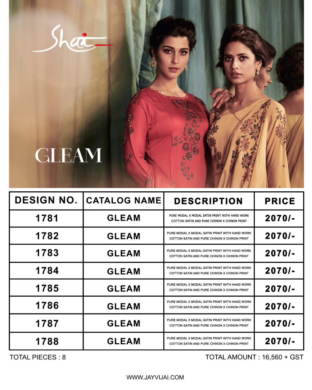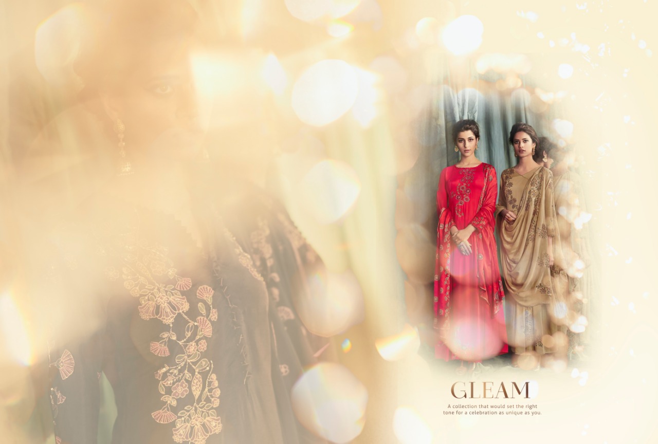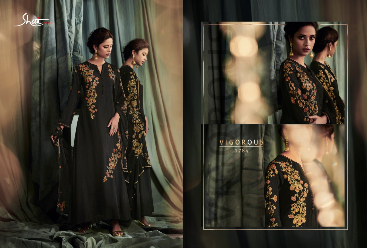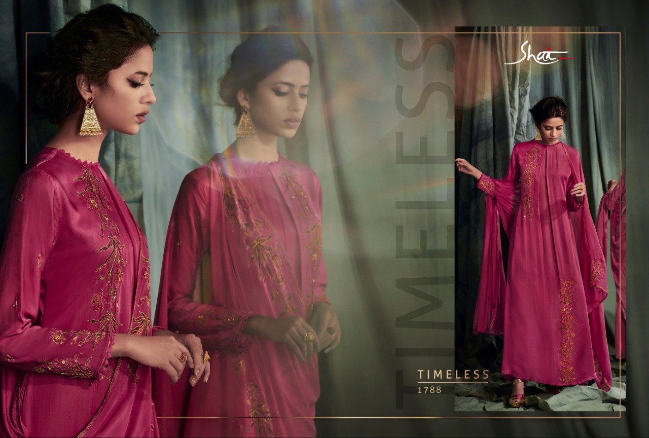 Brand - Shai . Catlog name - Glam . Series -1781 to 1788. Fabric Details Top - Pure Modal Ã? Modal Satin With Print and Handwork Bottom - Pure Cotton Satin Dupatta - Pure Chinnon With Print And 4 Side Tapping Work. Total pieces - 8 Rate - 2070 /- Set to set . GST 5 Percent Extra. Delivery from today. |