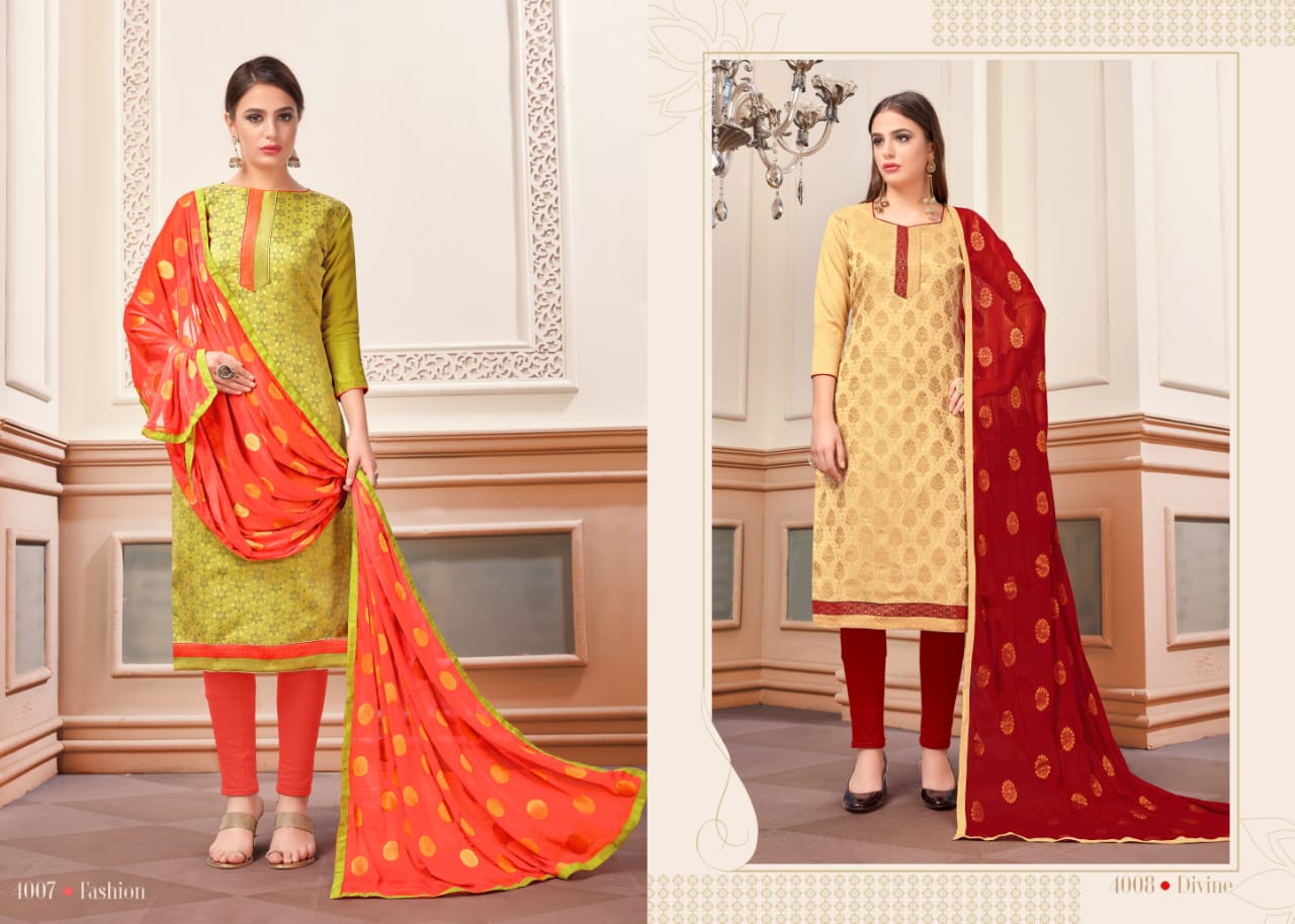 Buy Online Glamour Vol 4 By Shree Mahaveer Fashion 4001 Series Fancy Jacqard Silk Salwar Kameez Catlog Wholesale Dealer Surat 12 Pcs of Full Catalogue at Wholesale Price. Looking for Glamour Vol 4 By Shree Mahaveer Fashion 4001 Series Fancy Jacqard Silk Salwar Kameez Catlog Wholesale Dealer Surat Full Catalouge at Best Price? Buy Now Glamour Vol 4 By Shree Mahaveer Fashion 4001 Series Fancy Jacqard Silk Salwar Kameez Catlog Wholesale Dealer Surat at Wholesale Rate of Rs 5400 with Total 12 Pcs from authroized dealer and supplier of Brand. Cost of Each piece is just only Rs 450 which is very low and affordable price to resale the product in your retail store ,This is Surat based Wholesale Supplier & Dealer of Brand. Click on Brand name to Know more about Brand's products.Call or Whatsapp on 9898838984 for booking or enquiry