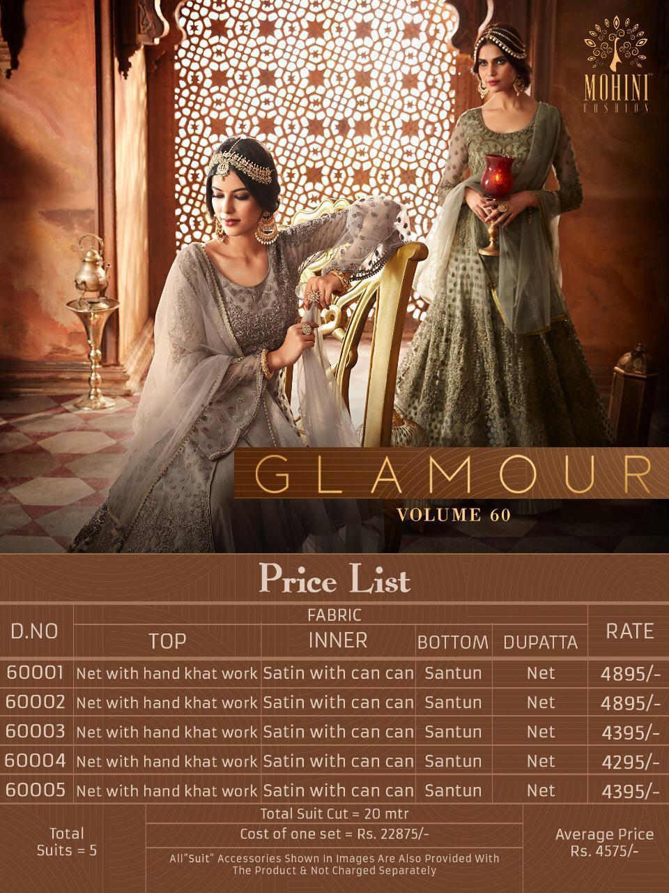 Buy Online Glamour Vol 60 By Mohini Fashion Series 60001 To 60005 Beautiful Designer Party Wear Suits Wholesale Supplier Gujarat 5 Pcs of Full Catalogue at Wholesale Price. Looking for Glamour Vol 60 By Mohini Fashion Series 60001 To 60005 Beautiful Designer Party Wear Suits Wholesale Supplier Gujarat Full Catalouge at Best Price? Buy Now Glamour Vol 60 By Mohini Fashion Series 60001 To 60005 Beautiful Designer Party Wear Suits Wholesale Supplier Gujarat at Wholesale Rate of Rs 22875 with Total 5 Pcs from authroized dealer and supplier of MOHINI FASHIONS Brand. Cost of Each piece is just only Rs 4575 which is very low and affordable price to resale the product in your retail store ,This is Surat based Wholesale Supplier & Dealer of MOHINI FASHIONS Brand. Click on Brand name to Know more about MOHINI FASHIONS Brand's products.Call or Whatsapp on 9898838984 for booking or enquiry