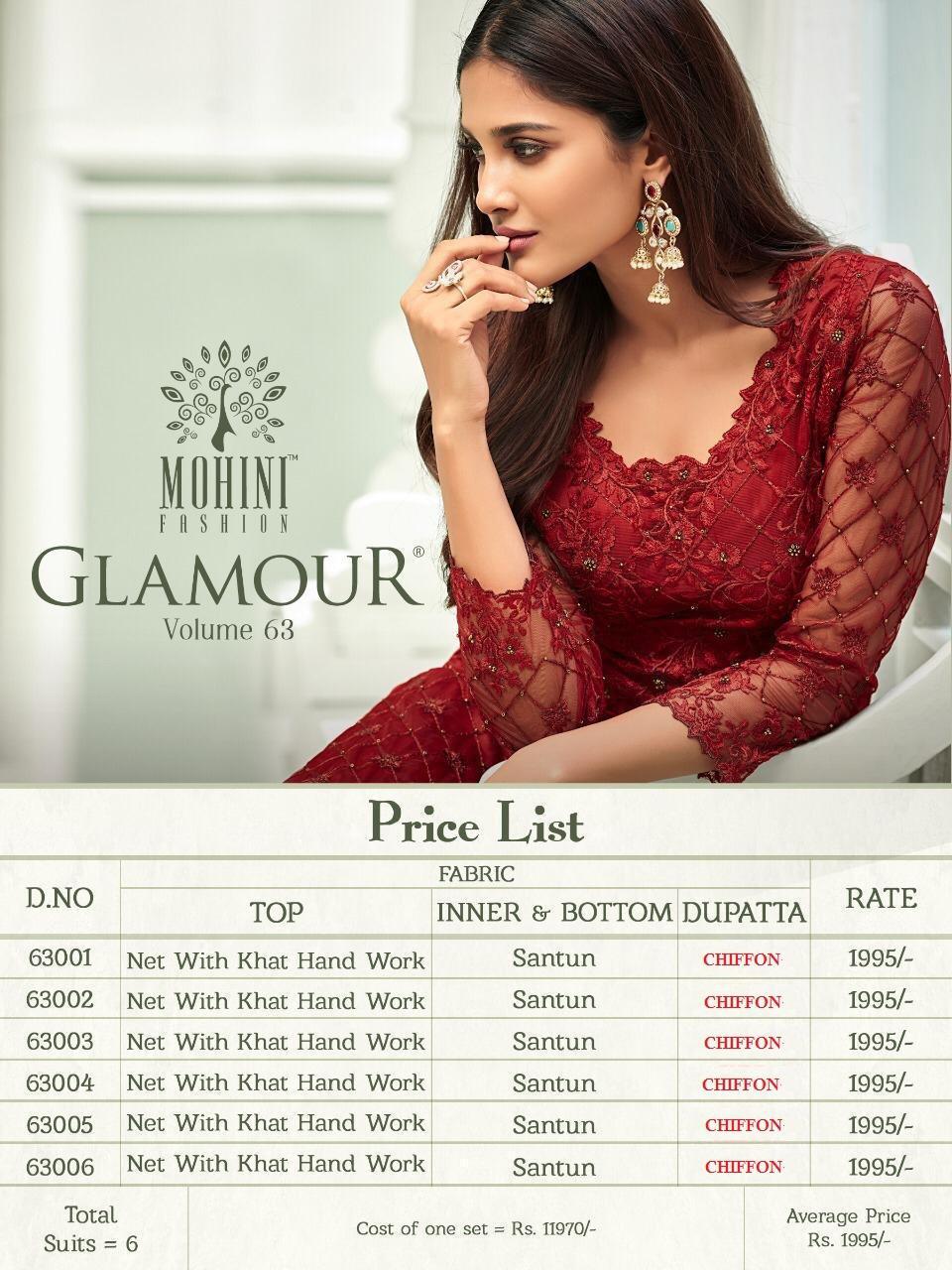 Buy Online Glamour Vol 63 By Mohini Fashion Series 63001 To 63006 Net Embroidered Designer Suits Wholesale Supplier Gujarat 6 Pcs of Full Catalogue at Wholesale Price. Looking for Glamour Vol 63 By Mohini Fashion Series 63001 To 63006 Net Embroidered Designer Suits Wholesale Supplier Gujarat Full Catalouge at Best Price? Buy Now Glamour Vol 63 By Mohini Fashion Series 63001 To 63006 Net Embroidered Designer Suits Wholesale Supplier Gujarat at Wholesale Rate of Rs 11970 with Total 6 Pcs from authroized dealer and supplier of MOHINI FASHIONS Brand. Cost of Each piece is just only Rs 1995 which is very low and affordable price to resale the product in your retail store ,This is Surat based Wholesale Supplier & Dealer of MOHINI FASHIONS Brand. Click on Brand name to Know more about MOHINI FASHIONS Brand's products.Call or Whatsapp on 9898838984 for booking or enquiry