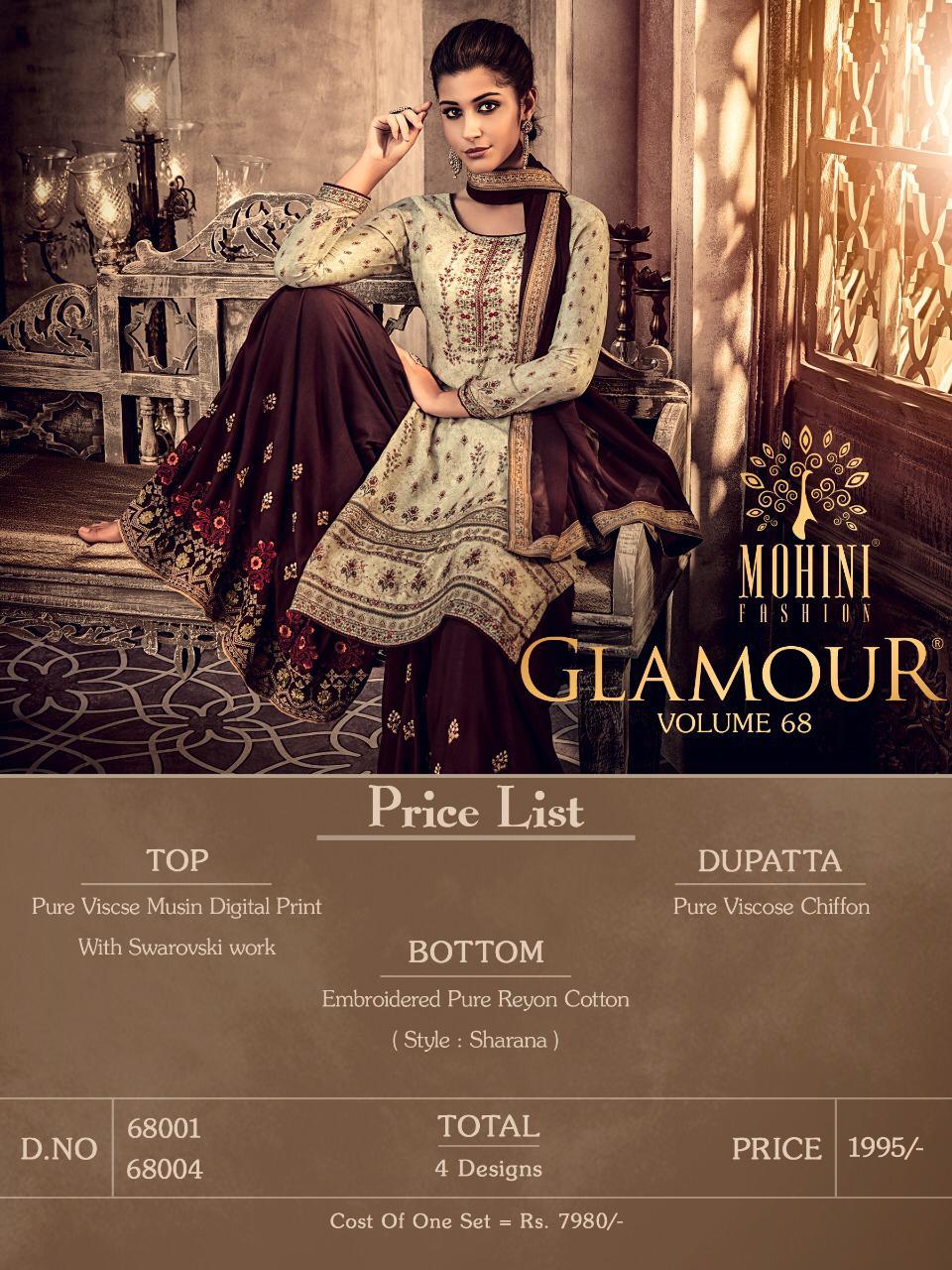 Buy Online Glamour Vol 68 By Mohini Fashion Series 68001 To 68004 Viscose Muslin Digital Print With Work Suits Wholesale Supplier And Dealer Surat 4 Pcs of Full Catalogue at Wholesale Price. Looking for Glamour Vol 68 By Mohini Fashion Series 68001 To 68004 Viscose Muslin Digital Print With Work Suits Wholesale Supplier And Dealer Surat Full Catalouge at Best Price? Buy Now Glamour Vol 68 By Mohini Fashion Series 68001 To 68004 Viscose Muslin Digital Print With Work Suits Wholesale Supplier And Dealer Surat at Wholesale Rate of Rs 7980 with Total 4 Pcs from authroized dealer and supplier of MOHINI FASHIONS Brand. Cost of Each piece is just only Rs 1995 which is very low and affordable price to resale the product in your retail store ,This is Surat based Wholesale Supplier & Dealer of MOHINI FASHIONS Brand. Click on Brand name to Know more about MOHINI FASHIONS Brand's products.Call or Whatsapp on 9898838984 for booking or enquiry