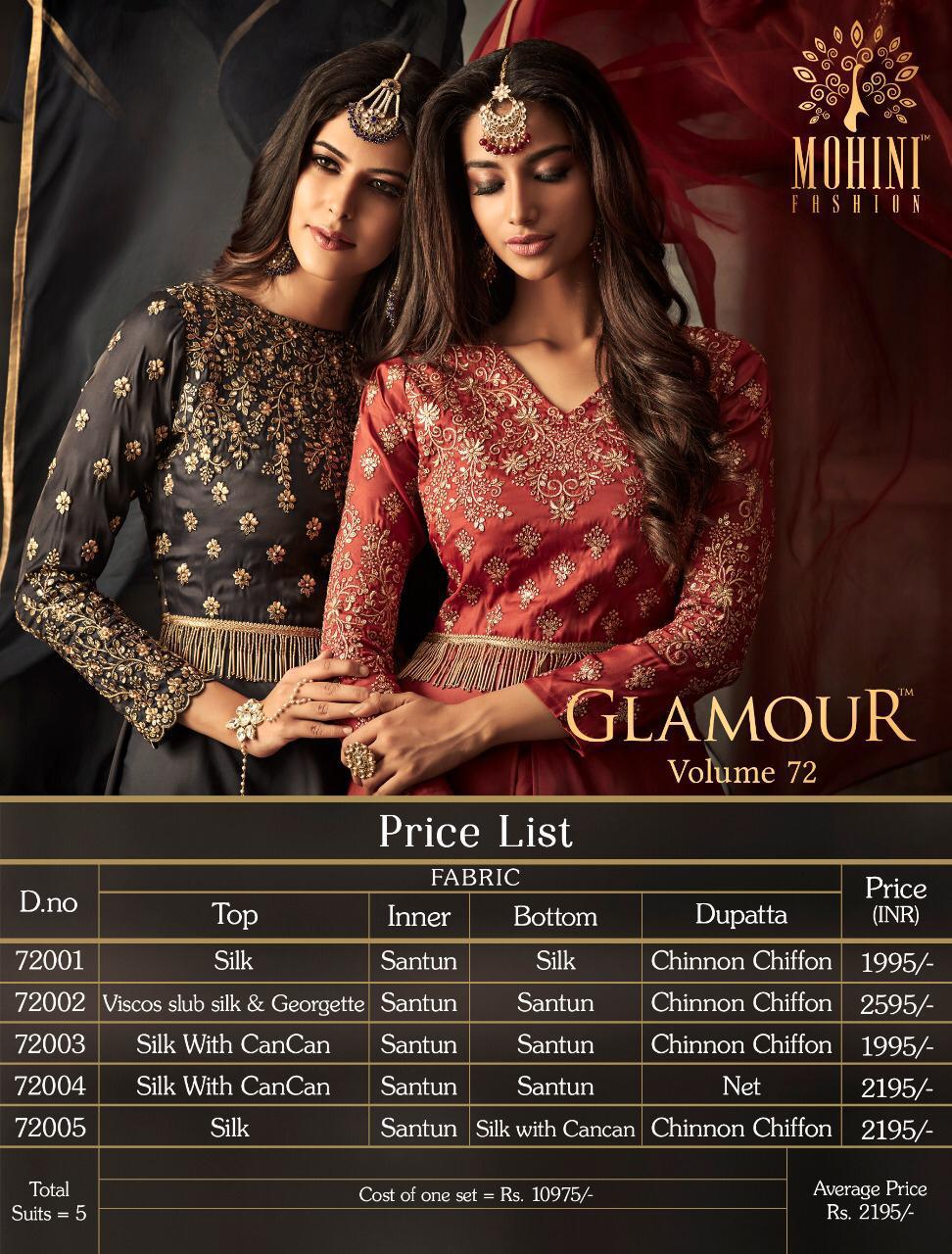 Buy Online Glamour Vol 72 By Mohini Fashion Series 72001 To 72005 Designer Party Wear Suits Wholesale Supplier Gujarat 5 Pcs of Full Catalogue at Wholesale Price. Looking for Glamour Vol 72 By Mohini Fashion Series 72001 To 72005 Designer Party Wear Suits Wholesale Supplier Gujarat Full Catalouge at Best Price? Buy Now Glamour Vol 72 By Mohini Fashion Series 72001 To 72005 Designer Party Wear Suits Wholesale Supplier Gujarat at Wholesale Rate of Rs 10975 with Total 5 Pcs from authroized dealer and supplier of MOHINI FASHIONS Brand. Cost of Each piece is just only Rs 2195 which is very low and affordable price to resale the product in your retail store ,This is Surat based Wholesale Supplier & Dealer of MOHINI FASHIONS Brand. Click on Brand name to Know more about MOHINI FASHIONS Brand's products.Call or Whatsapp on 9898838984 for booking or enquiry
