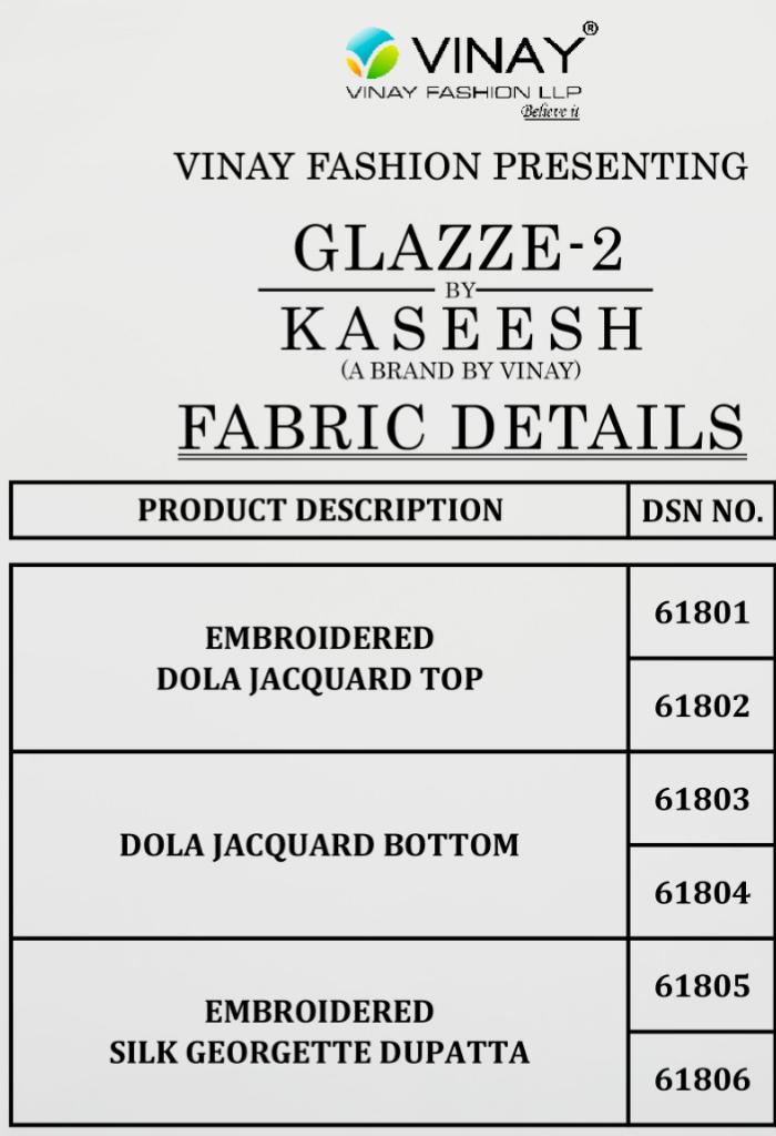 Buy Online Glazze Vol 2 By Vinay Fashion Pure Dola Jacquard Suits Singles Avilable Dealer From Surat 6 Pcs of Full Catalogue at Wholesale Price. Looking for Glazze Vol 2 By Vinay Fashion Pure Dola Jacquard Suits Singles Avilable Dealer From Surat Full Catalouge at Best Price? Buy Now Glazze Vol 2 By Vinay Fashion Pure Dola Jacquard Suits Singles Avilable Dealer From Surat at Wholesale Rate of Rs 12480 with Total 6 Pcs from authroized dealer and supplier of VINAY Brand. Cost of Each piece is just only Rs 2080 which is very low and affordable price to resale the product in your retail store ,This is Surat based Wholesale Supplier & Dealer of VINAY Brand. Click on Brand name to Know more about VINAY Brand's products.Call or Whatsapp on 9898838984 for booking or enquiry