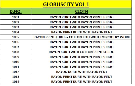 Buy Online Globus City Vol 1 By Diya Trendz Reyon Kurti With Shurg And Pant Wholesale Supplier And Dealer Surat 14 Pcs of Full Catalogue at Wholesale Price. Looking for Globus City Vol 1 By Diya Trendz Reyon Kurti With Shurg And Pant Wholesale Supplier And Dealer Surat Full Catalouge at Best Price? Buy Now Globus City Vol 1 By Diya Trendz Reyon Kurti With Shurg And Pant Wholesale Supplier And Dealer Surat at Wholesale Rate of Rs 6580 with Total 14 Pcs from authroized dealer and supplier of Brand. Cost of Each piece is just only Rs 470 which is very low and affordable price to resale the product in your retail store ,This is Surat based Wholesale Supplier & Dealer of Brand. Click on Brand name to Know more about Brand's products.Call or Whatsapp on 9898838984 for booking or enquiry