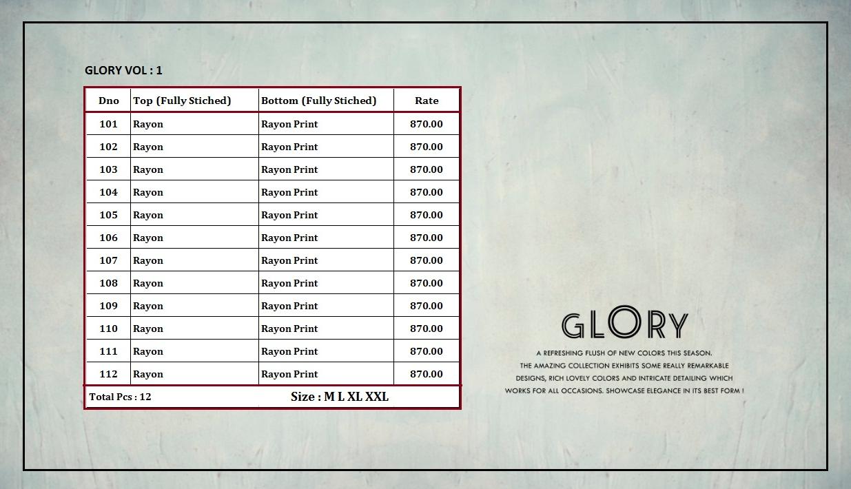 Buy Online Glory By Lt Fabrics 101 Series Fancy Reyon Top And Bottom Reyon Printed Catlog Wholesale Dealer Surat 12 Pcs of Full Catalogue at Wholesale Price. Looking for Glory By Lt Fabrics 101 Series Fancy Reyon Top And Bottom Reyon Printed Catlog Wholesale Dealer Surat Full Catalouge at Best Price? Buy Now Glory By Lt Fabrics 101 Series Fancy Reyon Top And Bottom Reyon Printed Catlog Wholesale Dealer Surat at Wholesale Rate of Rs 10440 with Total 12 Pcs from authroized dealer and supplier of LT FABRICS Brand. Cost of Each piece is just only Rs 870 which is very low and affordable price to resale the product in your retail store ,This is Surat based Wholesale Supplier & Dealer of LT FABRICS Brand. Click on Brand name to Know more about LT FABRICS Brand's products.Call or Whatsapp on 9898838984 for booking or enquiry