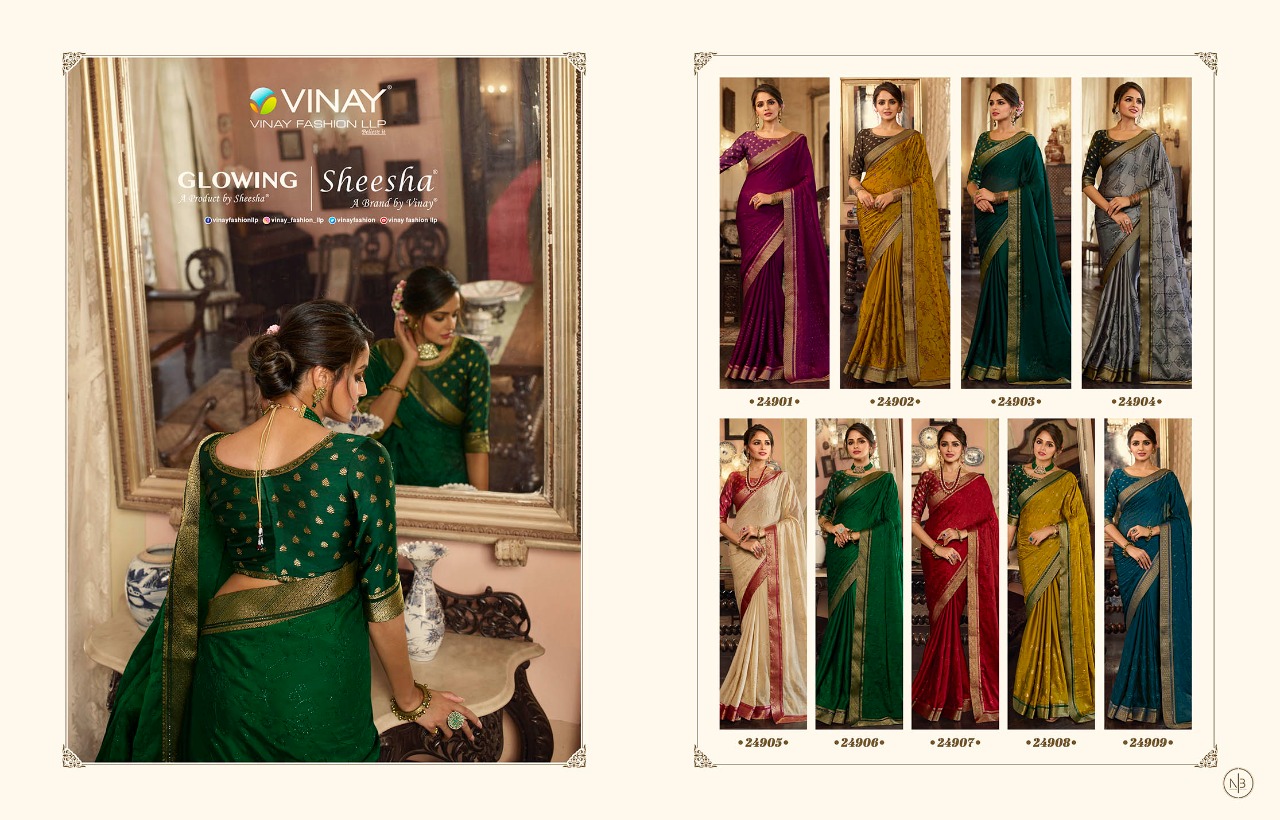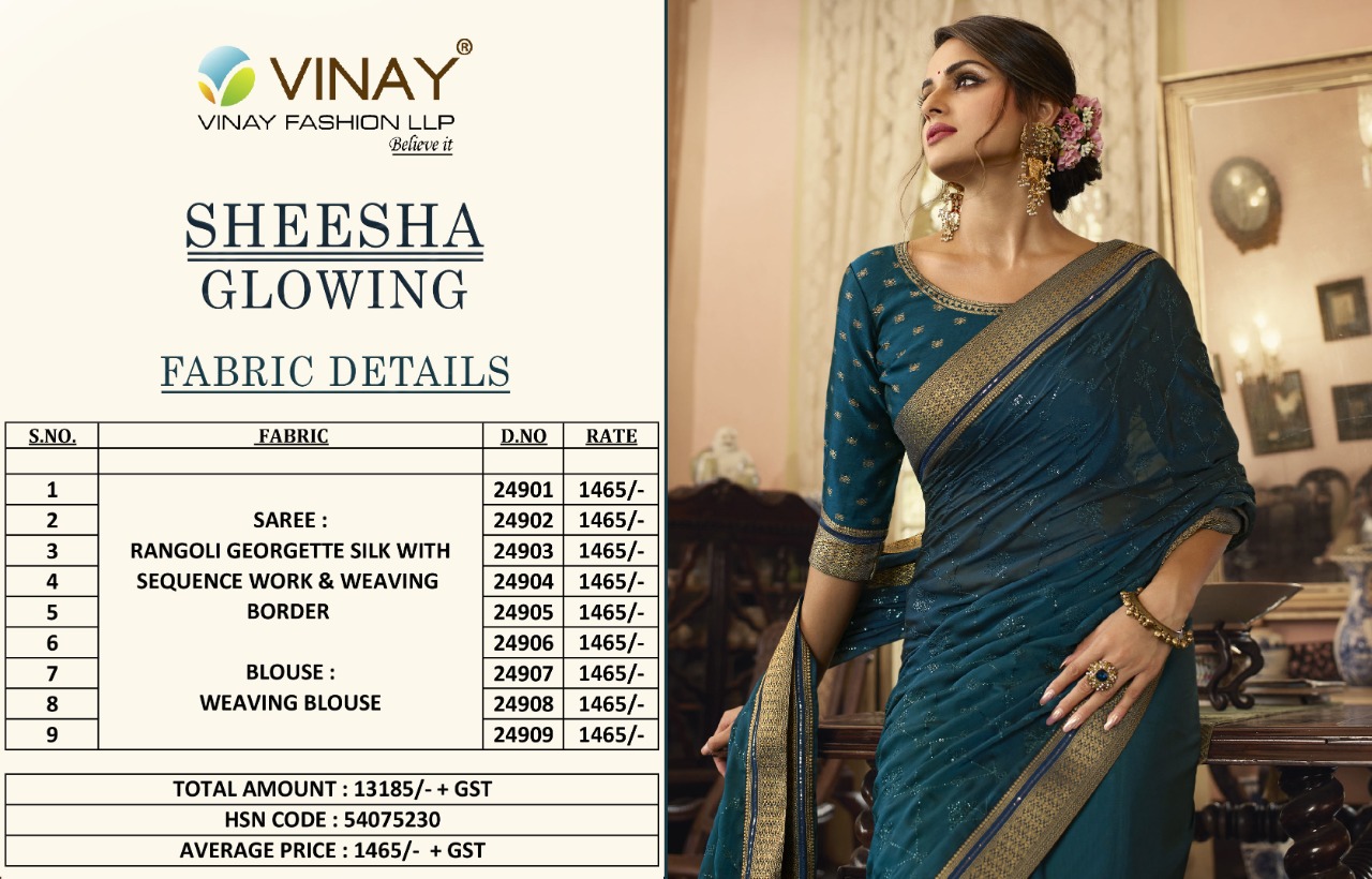 Buy Online Glowing By Vinay Fashion Wholesale Supplier Traders In Surat 9 Pcs of Full Catalogue at Wholesale Price. Looking for Glowing By Vinay Fashion Wholesale Supplier Traders In Surat Full Catalouge at Best Price? Buy Now Glowing By Vinay Fashion Wholesale Supplier Traders In Surat at Wholesale Rate of Rs 13185 with Total 9 Pcs from authroized dealer and supplier of Brand. Cost of Each piece is just only Rs 1465 which is very low and affordable price to resale the product in your retail store ,This is Surat based Wholesale Supplier & Dealer of Brand. Click on Brand name to Know more about Brand's products.Call or Whatsapp on 9898838984 for booking or enquiry