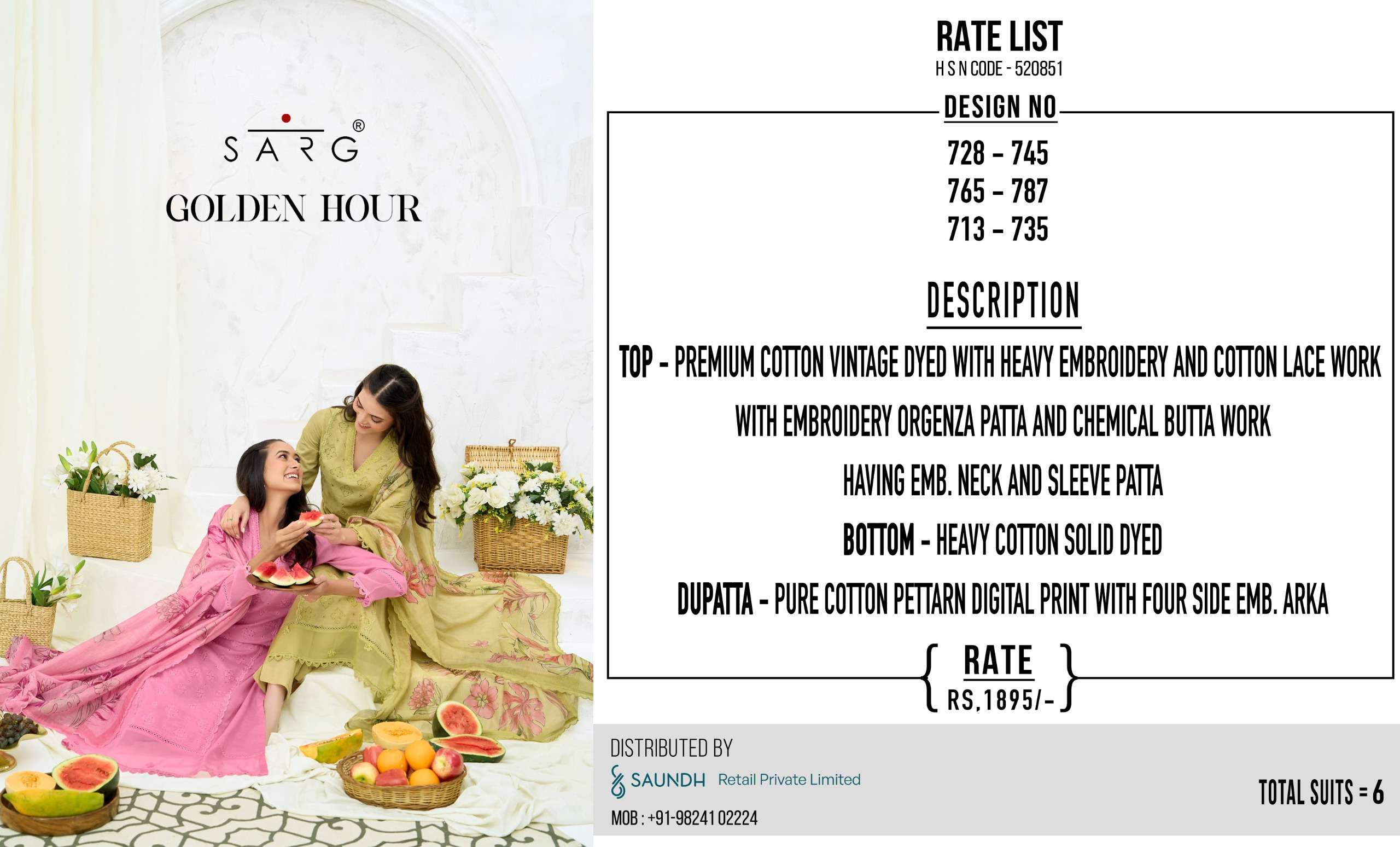 Buy Online GOLDEN HOUR by SARG Suit collection manufacturers surat 6 Pcs of Full Catalogue at Wholesale Price. Looking for GOLDEN HOUR by SARG Suit collection manufacturers surat Full Catalouge at Best Price? Buy Now GOLDEN HOUR by SARG Suit collection manufacturers surat at Wholesale Rate of Rs 11370 with Total 6 Pcs from authroized dealer and supplier of BRAND'S Brand. Cost of Each piece is just only Rs 1895 which is very low and affordable price to resale the product in your retail store ,This is Surat based Wholesale Supplier & Dealer of BRAND'S Brand. Click on Brand name to Know more about BRAND'S Brand's products.Call or Whatsapp on 9898838984 for booking or enquiry