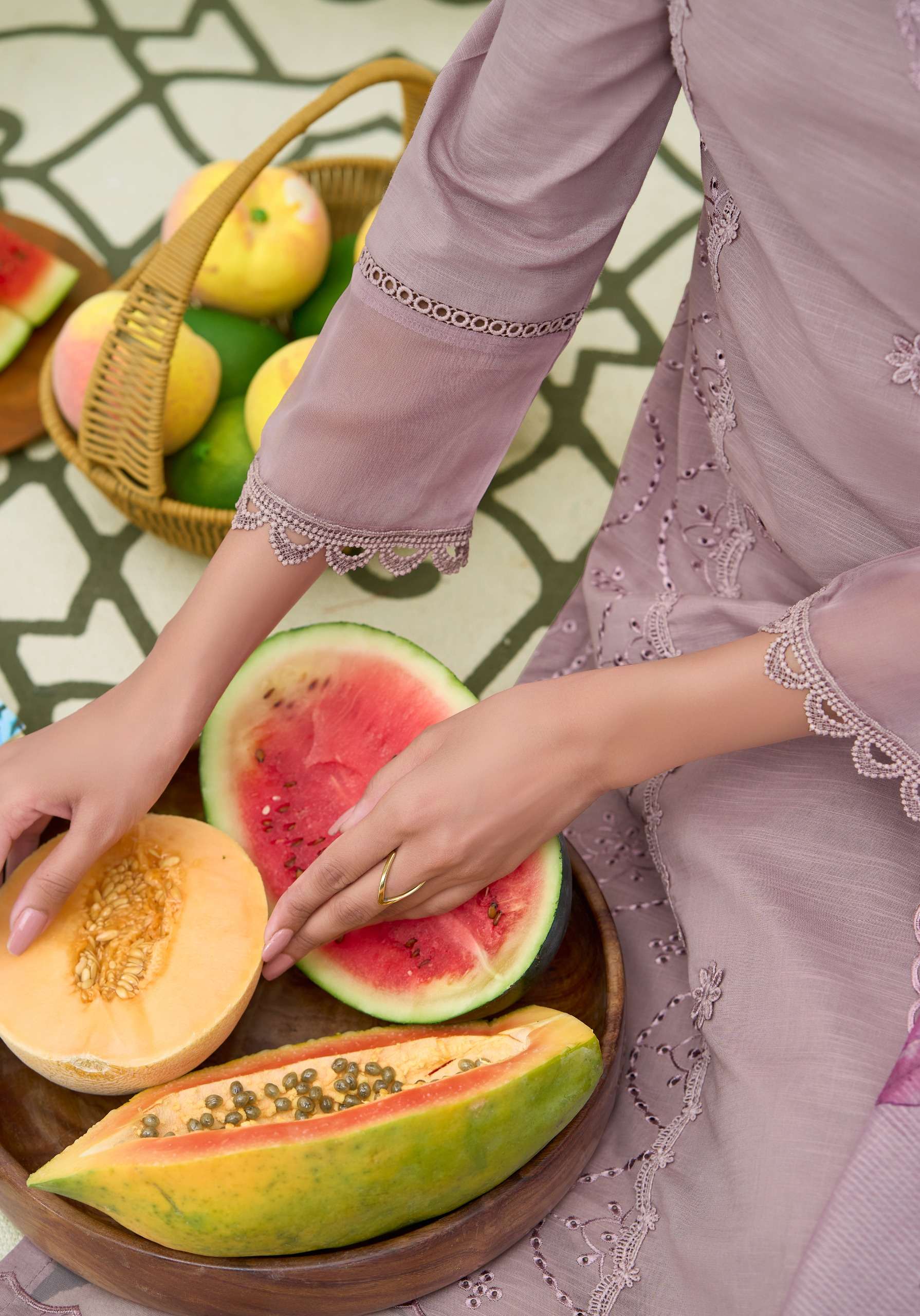 TOP - PREMIUM COTTON VINTAGE DYED WITH HEAVY EMBROIDERY AND COTTON LACE WORK WITH EMBROIDERY ORGENZA PATTA AND CHEMICAL BUTTA WORK HAVING EMB. NECK AND SLEEVE PATTA