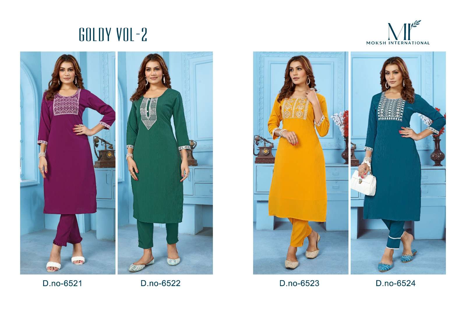 Buy Online Goldy Vol 2 by MOKSH INTERNATIONAL Rinkal cotton kurti collection manufacturer surat 4 Pcs of Full Catalogue at Wholesale Price. Looking for Goldy Vol 2 by MOKSH INTERNATIONAL Rinkal cotton kurti collection manufacturer surat Full Catalouge at Best Price? Buy Now Goldy Vol 2 by MOKSH INTERNATIONAL Rinkal cotton kurti collection manufacturer surat at Wholesale Rate of Rs 2916 with Total 4 Pcs from authroized dealer and supplier of MOKSH INTERNATIONAL Brand. Cost of Each piece is just only Rs 729 which is very low and affordable price to resale the product in your retail store ,This is Surat based Wholesale Supplier & Dealer of MOKSH INTERNATIONAL Brand. Click on Brand name to Know more about MOKSH INTERNATIONAL Brand's products.Call or Whatsapp on 9898838984 for booking or enquiry