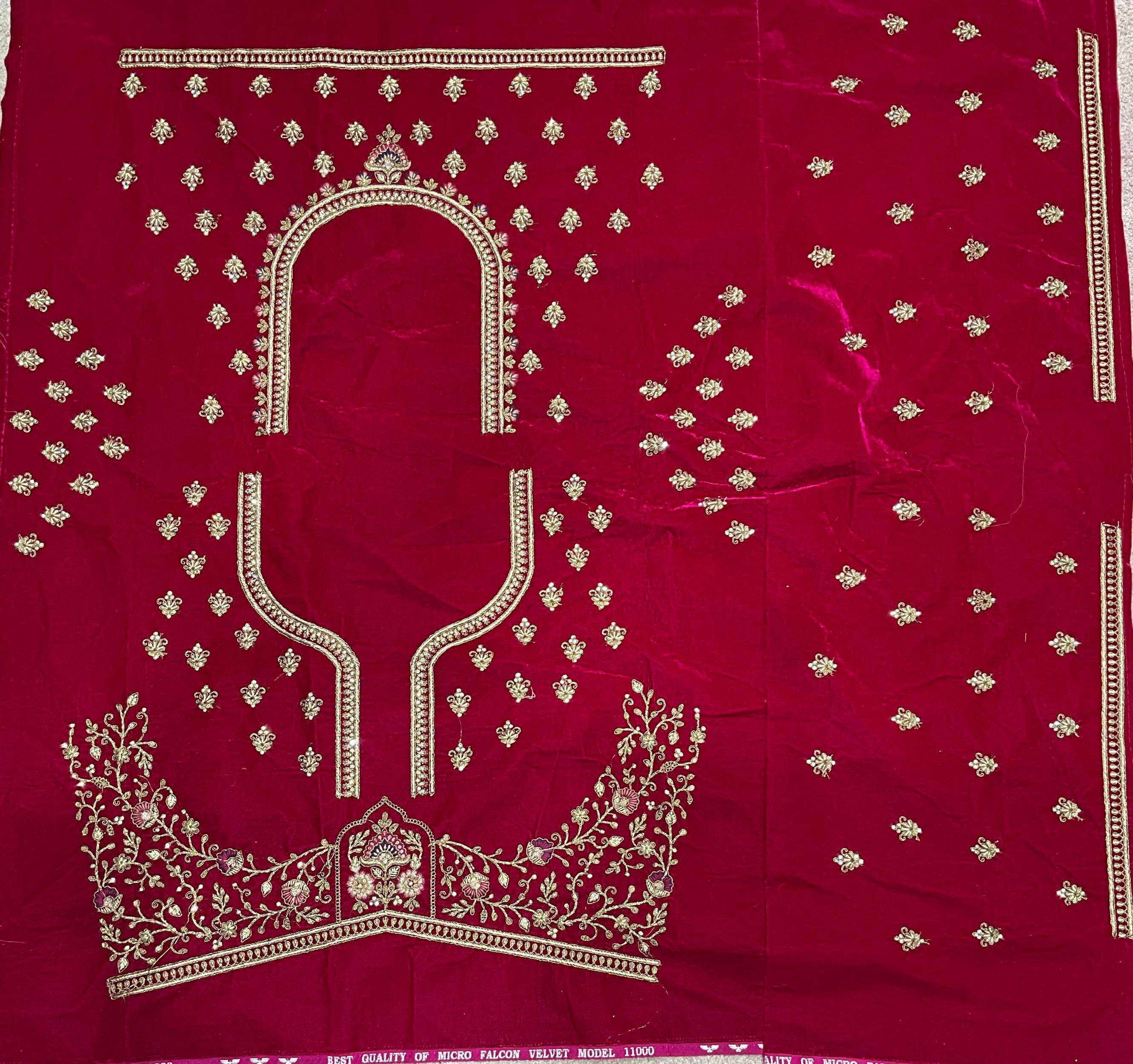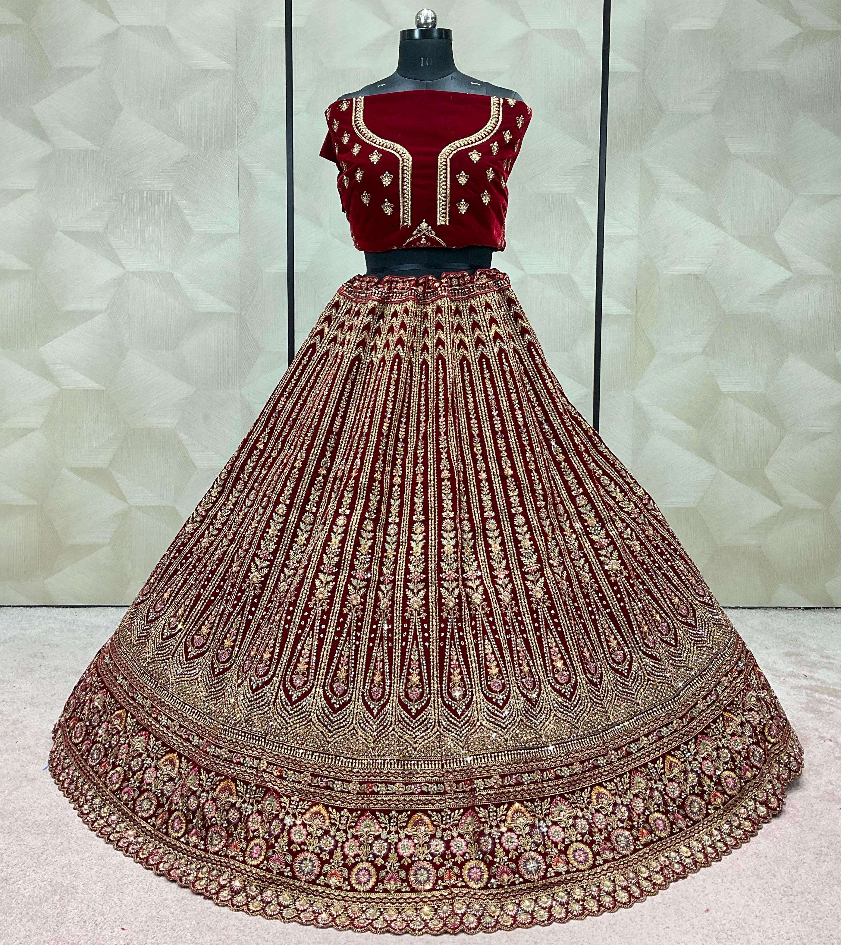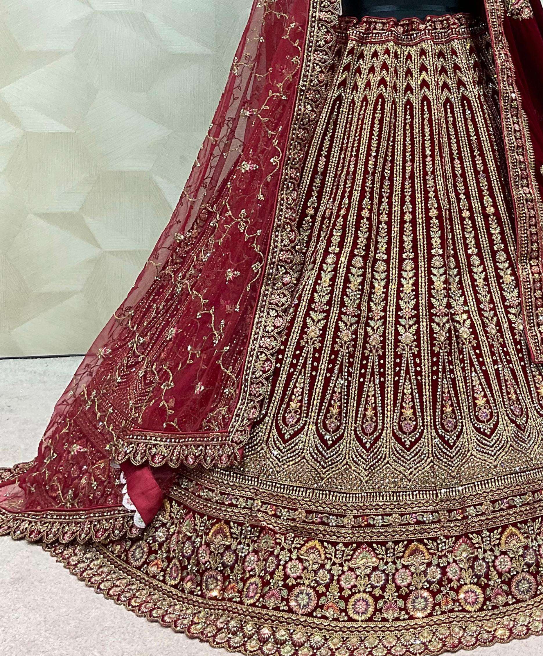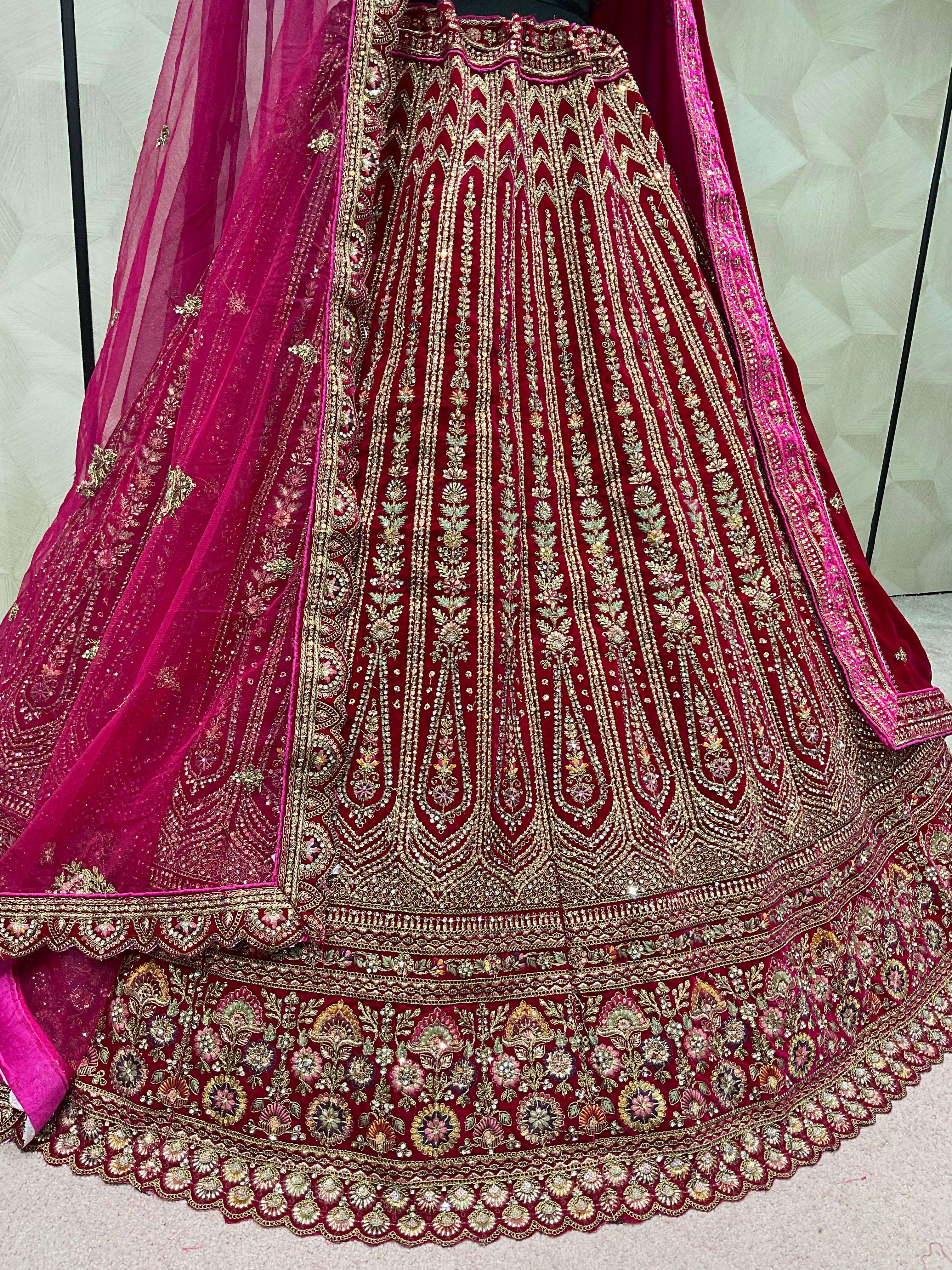 Lehenga-velvet with zarkan Blouse-velvet with zarkan sequence codding work Dupatta-1-net Dupatta -2-velvet • Lehenga:- exquisite velvet lehenga choli with intricate embroidery, Semi-Stitched lehenga with zarkan , Sequins and Coding thread Work Embroidery. • Lehenga Stitching Note:- 2 layers of Can Can with size waist upto 42 • Dupatta1:- net fabric Ethnic motif with ZARKAN sequence Embroidery lace Border. •Dupatta2: velvet dupatta with heavy embroidery lace border • Blouse:- velvet With Heavy sequinse zarkan and Embroidery work. • Lehenga Flair : 5.25 meter with Inner attached with latkans • 1 Lehenga, 1 Blouse, 2 Dupatta • Lehenga: Customizable upto 42 inches at the waist, • Lehenga Flair: 5.25 Meter • Lehenga length: 42 inches at the length • Choli: Customizable upto 44 inches at the Bust • Dupatta length: 2.50 meter • Dupatta width: 1 meter |