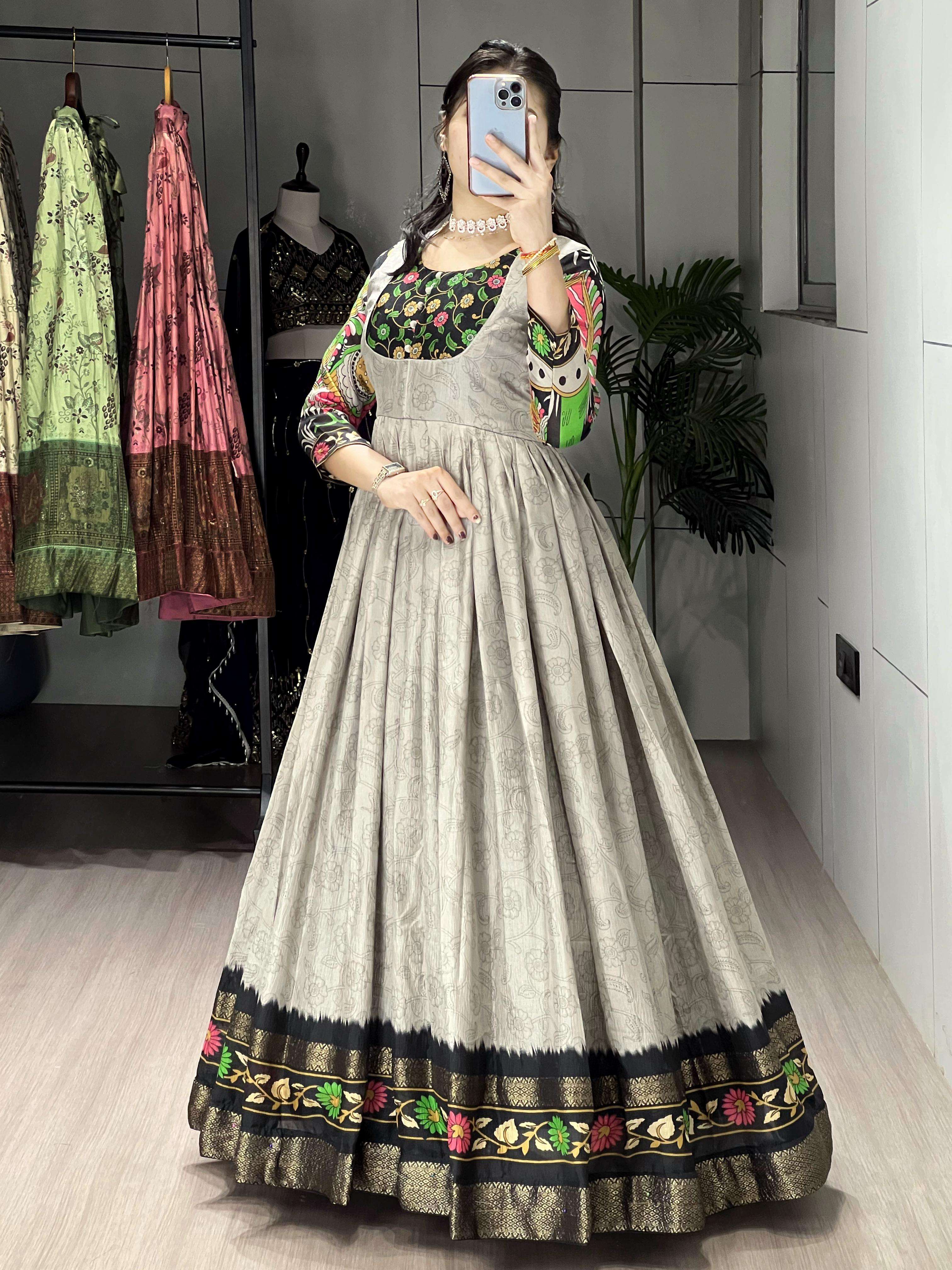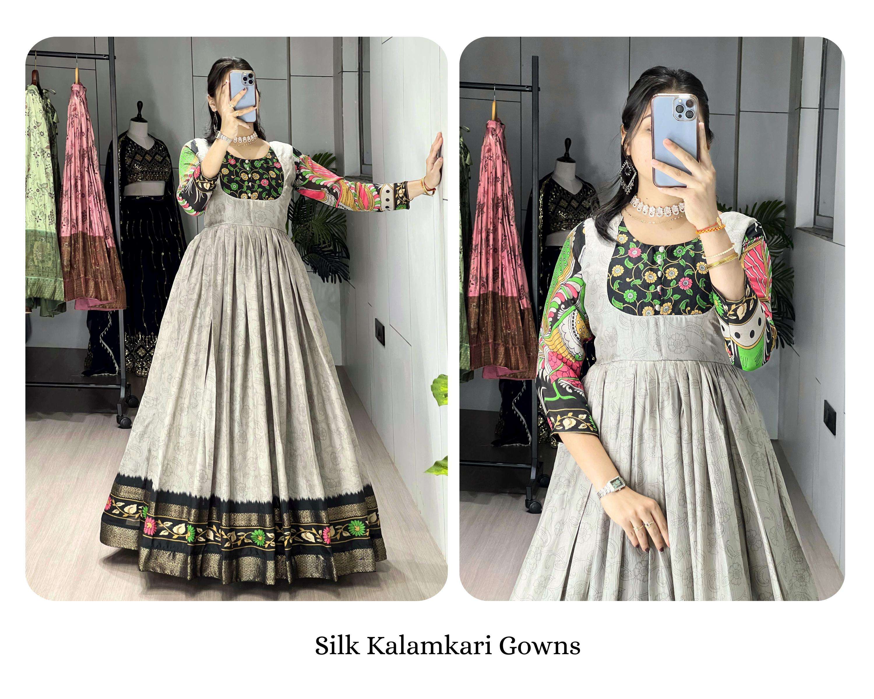 *Gown Details* Fabric : Soft Silk Work : All Over Traditional Kalamkari Print With Weaving Zari Border