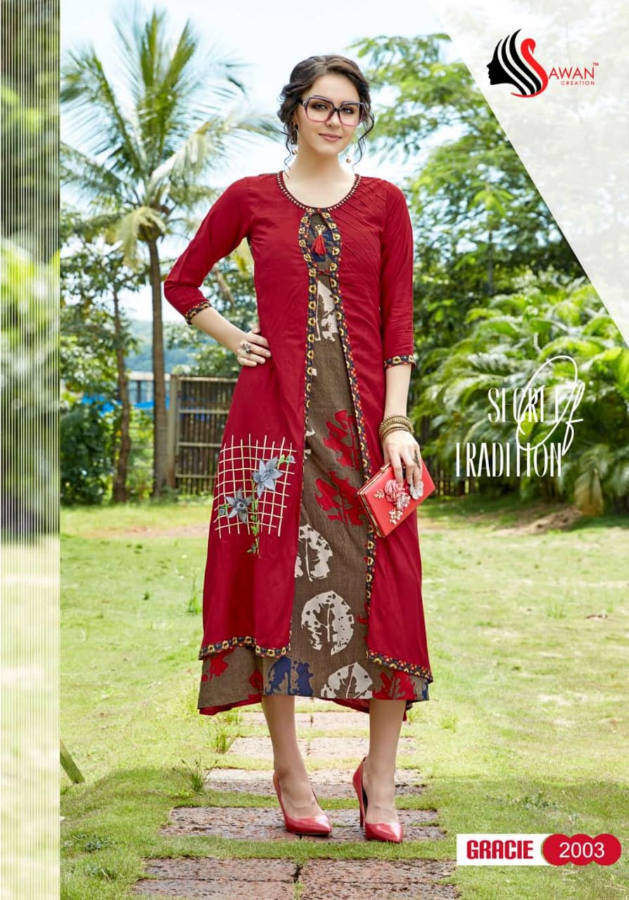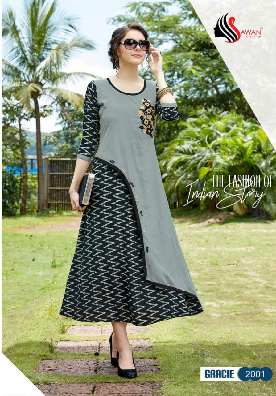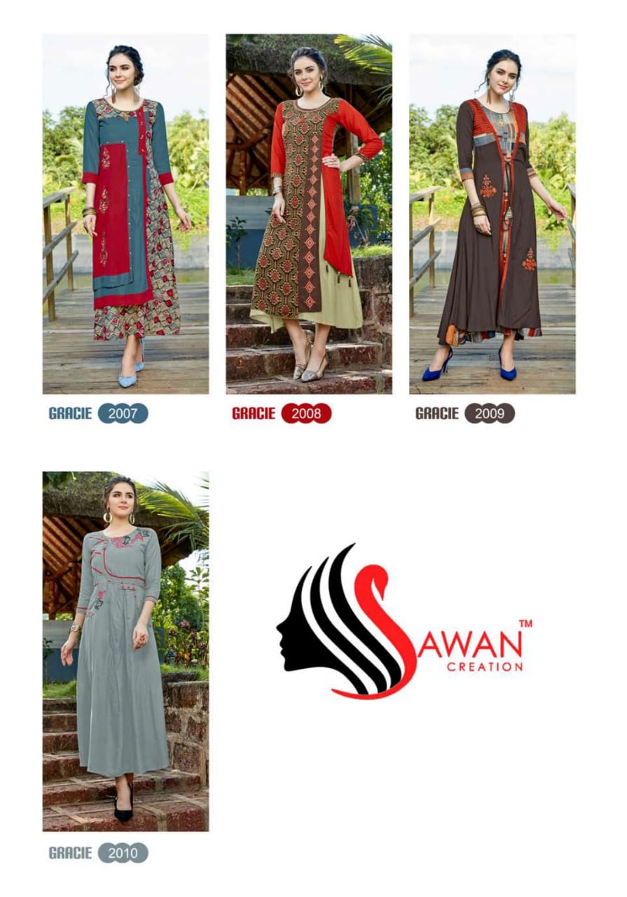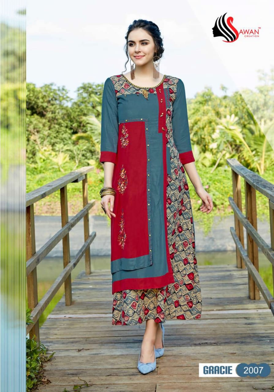 Buy Online Gracie Vol 2 By Sawan Creation 2001 Series Reyon Printed Kurti Catlog Wholesale Dealer And Supplier Surat 10 Pcs of Full Catalogue at Wholesale Price. Looking for Gracie Vol 2 By Sawan Creation 2001 Series Reyon Printed Kurti Catlog Wholesale Dealer And Supplier Surat Full Catalouge at Best Price? Buy Now Gracie Vol 2 By Sawan Creation 2001 Series Reyon Printed Kurti Catlog Wholesale Dealer And Supplier Surat at Wholesale Rate of Rs 5990 with Total 10 Pcs from authroized dealer and supplier of SAWAN CREATION Brand. Cost of Each piece is just only Rs 599 which is very low and affordable price to resale the product in your retail store ,This is Surat based Wholesale Supplier & Dealer of SAWAN CREATION Brand. Click on Brand name to Know more about SAWAN CREATION Brand's products.Call or Whatsapp on 9898838984 for booking or enquiry