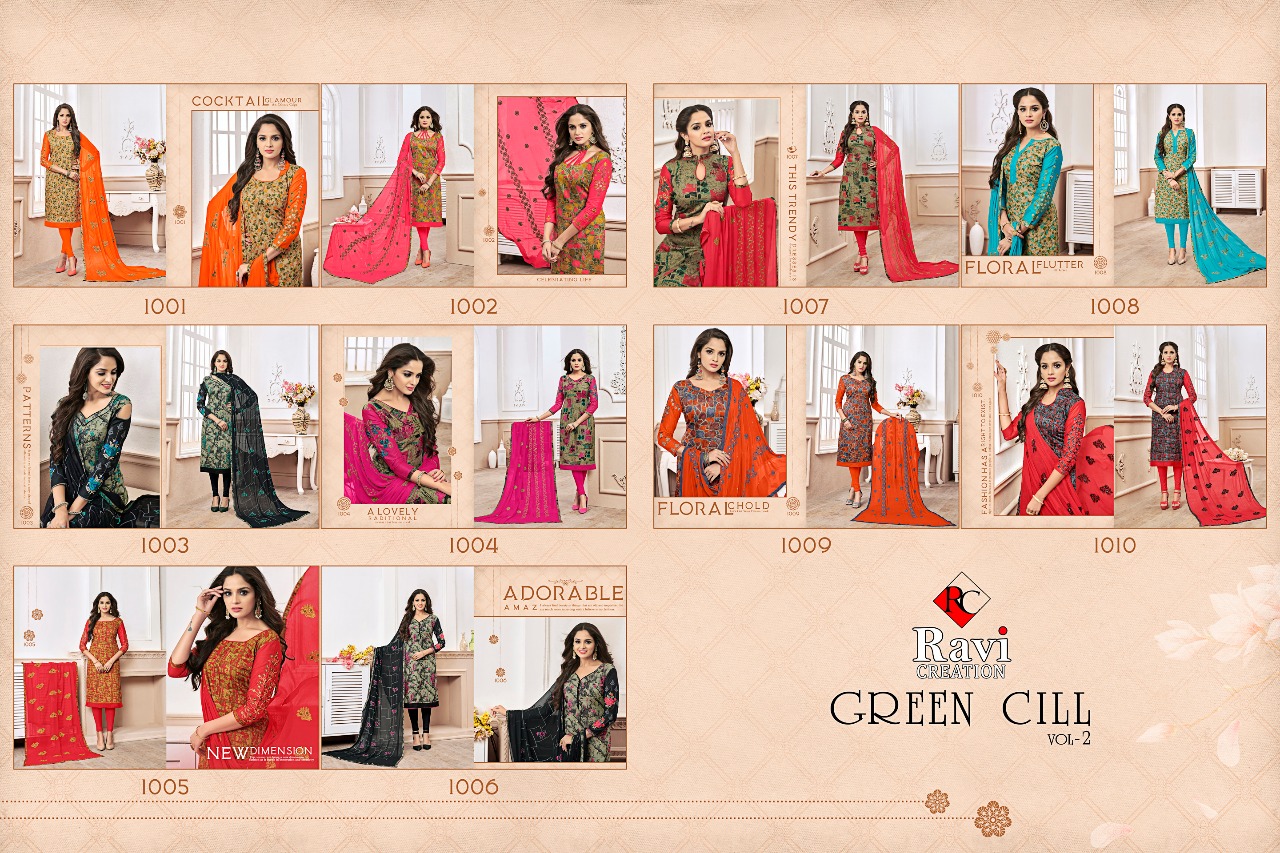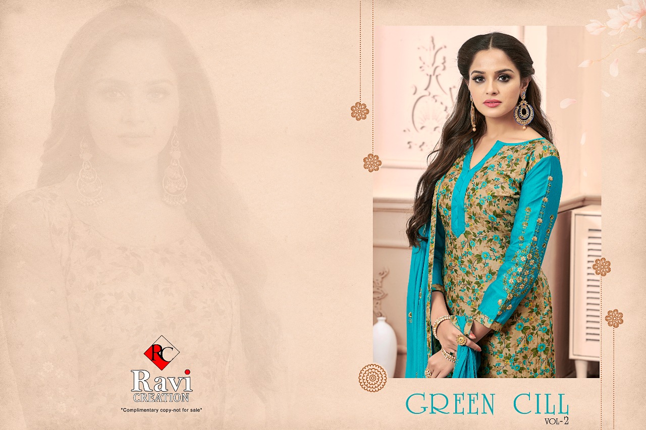 Buy Online Green Cill By Ravi Creation Satin Cotton Printed Designer Suits Wholesale Dealer And Supplier Surat 10 Pcs of Full Catalogue at Wholesale Price. Looking for Green Cill By Ravi Creation Satin Cotton Printed Designer Suits Wholesale Dealer And Supplier Surat Full Catalouge at Best Price? Buy Now Green Cill By Ravi Creation Satin Cotton Printed Designer Suits Wholesale Dealer And Supplier Surat at Wholesale Rate of Rs 5510 with Total 10 Pcs from authroized dealer and supplier of Ravi creation Brand. Cost of Each piece is just only Rs 551 which is very low and affordable price to resale the product in your retail store ,This is Surat based Wholesale Supplier & Dealer of Ravi creation Brand. Click on Brand name to Know more about Ravi creation Brand's products.Call or Whatsapp on 9898838984 for booking or enquiry