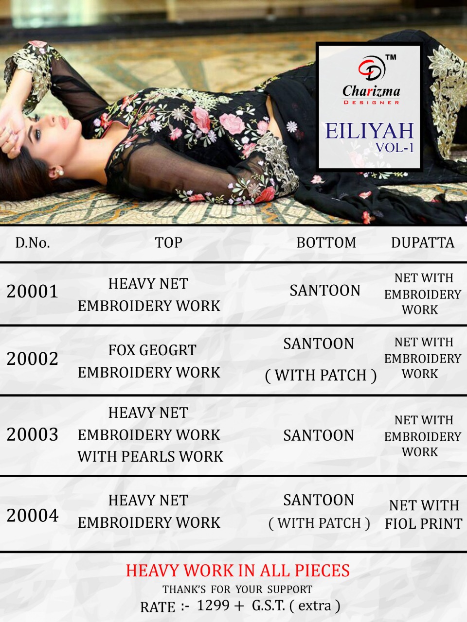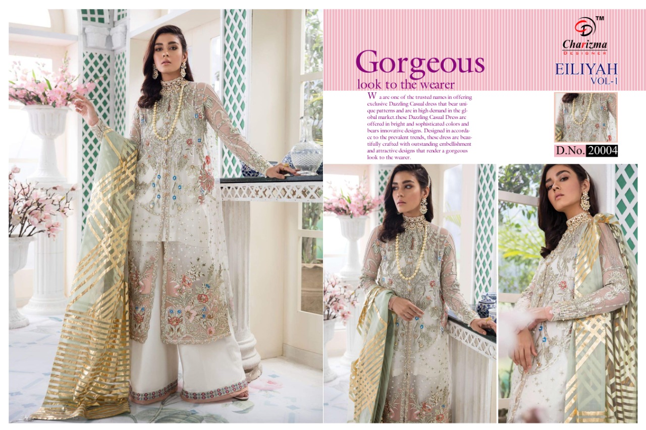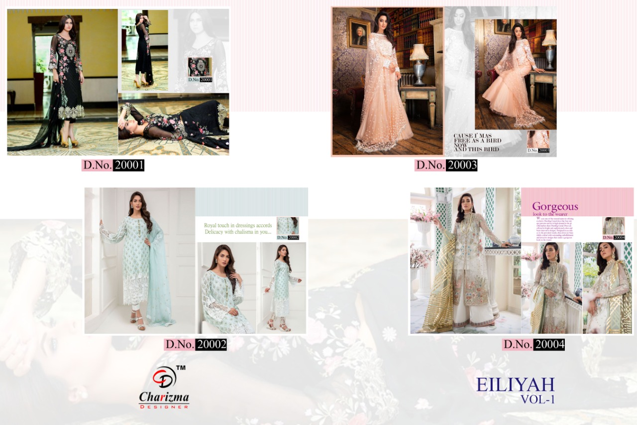 Buy Online Gul E Rana Eiliyah Fancy Collection By Charizma Designer Pakistani Suits Wholesale Supplier Surat 4 Pcs of Full Catalogue at Wholesale Price. Looking for Gul E Rana Eiliyah Fancy Collection By Charizma Designer Pakistani Suits Wholesale Supplier Surat Full Catalouge at Best Price? Buy Now Gul E Rana Eiliyah Fancy Collection By Charizma Designer Pakistani Suits Wholesale Supplier Surat at Wholesale Rate of Rs 5196 with Total 4 Pcs from authroized dealer and supplier of Brand. Cost of Each piece is just only Rs 1299 which is very low and affordable price to resale the product in your retail store ,This is Surat based Wholesale Supplier & Dealer of Brand. Click on Brand name to Know more about Brand's products.Call or Whatsapp on 9898838984 for booking or enquiry