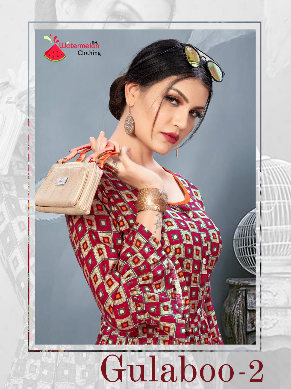 Buy Online Gulaboo 2 By Watermelon Reyon Kurtis Wholesale Supplier And Dealer Surat 7 Pcs of Full Catalogue at Wholesale Price. Looking for Gulaboo 2 By Watermelon Reyon Kurtis Wholesale Supplier And Dealer Surat Full Catalouge at Best Price? Buy Now Gulaboo 2 By Watermelon Reyon Kurtis Wholesale Supplier And Dealer Surat at Wholesale Rate of Rs 3745 with Total 7 Pcs from authroized dealer and supplier of WATERMELON Brand. Cost of Each piece is just only Rs 535 which is very low and affordable price to resale the product in your retail store ,This is Surat based Wholesale Supplier & Dealer of WATERMELON Brand. Click on Brand name to Know more about WATERMELON Brand's products.Call or Whatsapp on 9898838984 for booking or enquiry