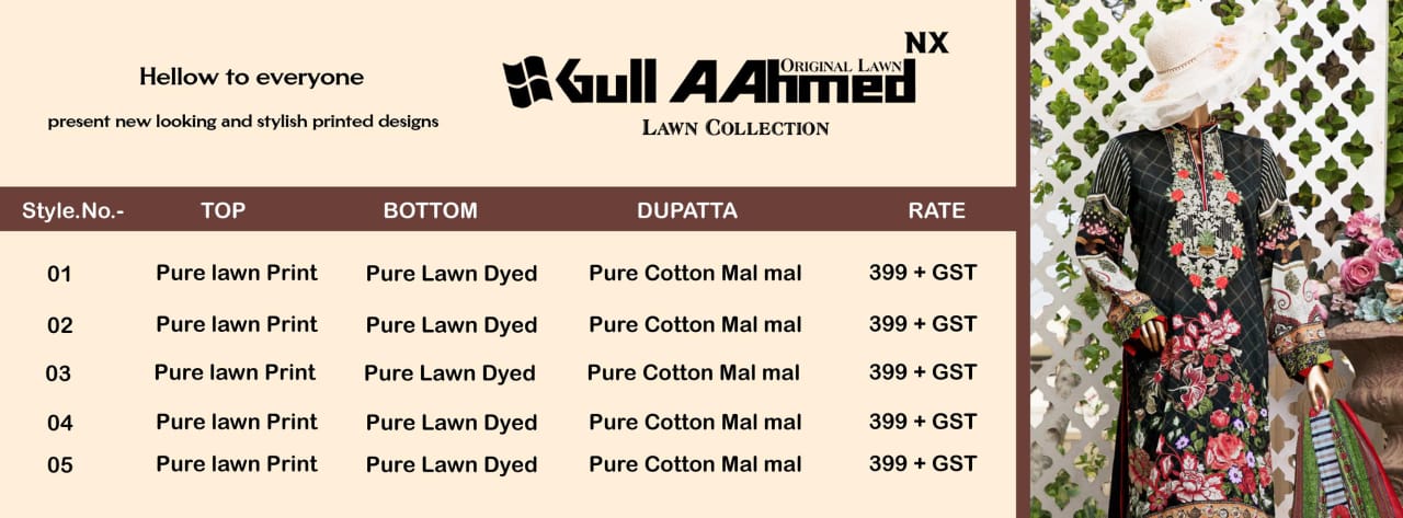 Buy Online Gulahmed Nx 1st Edition Lawn Dress Materials Wholesale Supplier And Dealer Surat 5 Pcs of Full Catalogue at Wholesale Price. Looking for Gulahmed Nx 1st Edition Lawn Dress Materials Wholesale Supplier And Dealer Surat Full Catalouge at Best Price? Buy Now Gulahmed Nx 1st Edition Lawn Dress Materials Wholesale Supplier And Dealer Surat at Wholesale Rate of Rs 1995 with Total 5 Pcs from authroized dealer and supplier of Brand. Cost of Each piece is just only Rs 399 which is very low and affordable price to resale the product in your retail store ,This is Surat based Wholesale Supplier & Dealer of Brand. Click on Brand name to Know more about Brand's products.Call or Whatsapp on 9898838984 for booking or enquiry