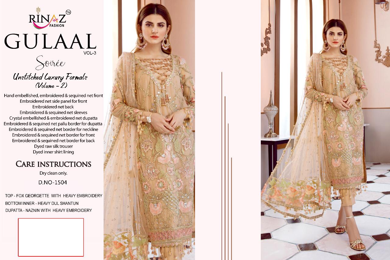 Buy Online Gulal Vol 3 By Rinaz Fashion Pakistani Suits Wholesale Supplier Gujarat 6 Pcs of Full Catalogue at Wholesale Price. Looking for Gulal Vol 3 By Rinaz Fashion Pakistani Suits Wholesale Supplier Gujarat Full Catalouge at Best Price? Buy Now Gulal Vol 3 By Rinaz Fashion Pakistani Suits Wholesale Supplier Gujarat at Wholesale Rate of Rs 7650 with Total 6 Pcs from authroized dealer and supplier of Brand. Cost of Each piece is just only Rs 1275 which is very low and affordable price to resale the product in your retail store ,This is Surat based Wholesale Supplier & Dealer of Brand. Click on Brand name to Know more about Brand's products.Call or Whatsapp on 9898838984 for booking or enquiry
