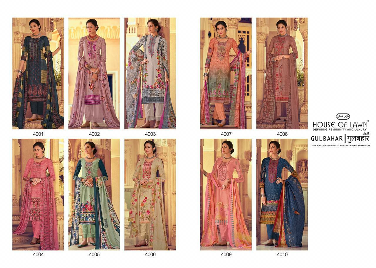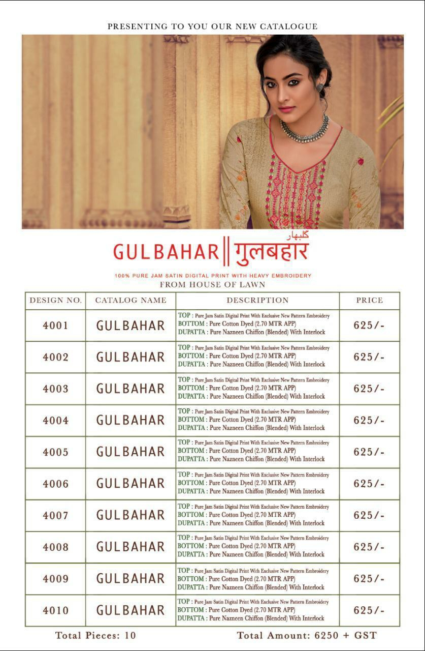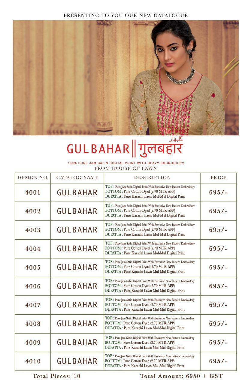 Buy Online Gulbahar By House Of Lawn Jam Satin Suits Wholesale Supplier Gujarat 10 Pcs of Full Catalogue at Wholesale Price. Looking for Gulbahar By House Of Lawn Jam Satin Suits Wholesale Supplier Gujarat Full Catalouge at Best Price? Buy Now Gulbahar By House Of Lawn Jam Satin Suits Wholesale Supplier Gujarat at Wholesale Rate of Rs 6950 with Total 10 Pcs from authroized dealer and supplier of HOUSE OF LAWN Brand. Cost of Each piece is just only Rs 695 which is very low and affordable price to resale the product in your retail store ,This is Surat based Wholesale Supplier & Dealer of HOUSE OF LAWN Brand. Click on Brand name to Know more about HOUSE OF LAWN Brand's products.Call or Whatsapp on 9898838984 for booking or enquiry
