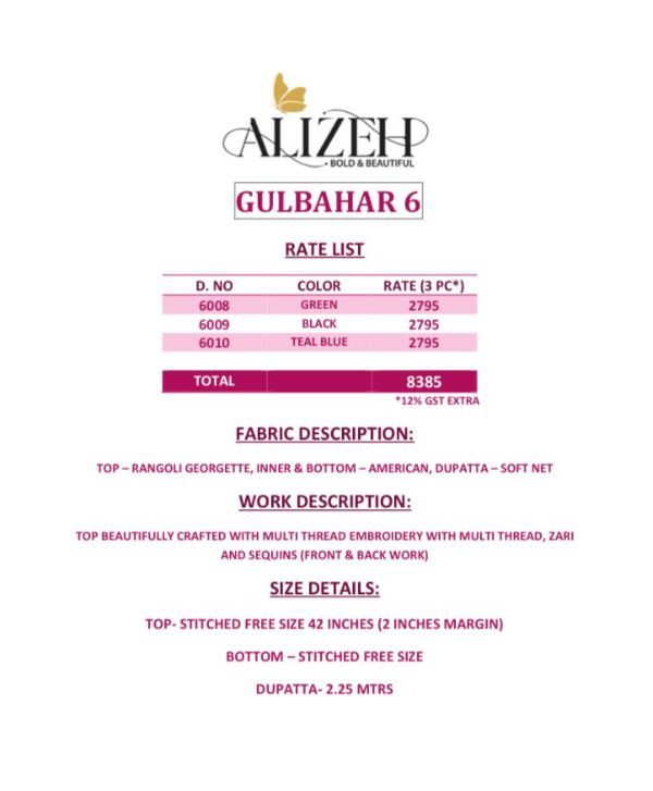 Buy Online Gulbahar Vol 6 Series 6008 To 6010 By Alizeh Official 3 Pcs of Full Catalogue at Wholesale Price. Looking for Gulbahar Vol 6 Series 6008 To 6010 By Alizeh Official Full Catalouge at Best Price? Buy Now Gulbahar Vol 6 Series 6008 To 6010 By Alizeh Official at Wholesale Rate of Rs 8385 with Total 3 Pcs from authroized dealer and supplier of Brand. Cost of Each piece is just only Rs 2795 which is very low and affordable price to resale the product in your retail store ,This is Surat based Wholesale Supplier & Dealer of Brand. Click on Brand name to Know more about Brand's products.Call or Whatsapp on 9898838984 for booking or enquiry